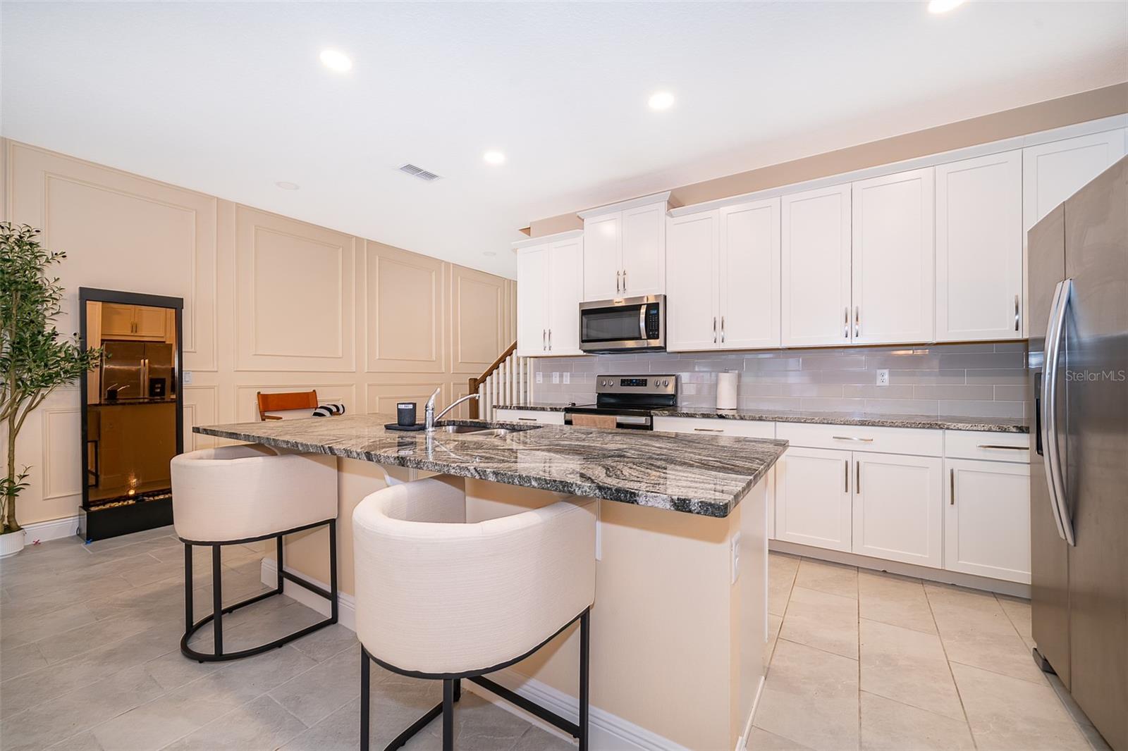 Step inside to discover an open-concept floor plan filled with natural light and elevated finishes. The gourmet kitchen features granite countertops, custom cabinetry, stainless steel appliances, and a large island — perfect for hosting or relaxed family dinners. The living room flows effortlessly into the private patio, making indoor-outdoor living easy and elegant.