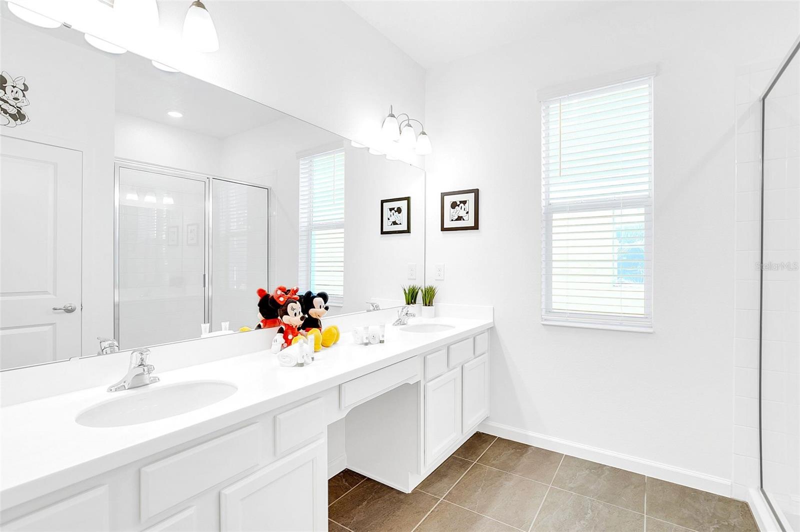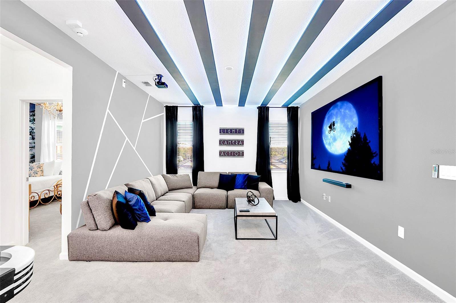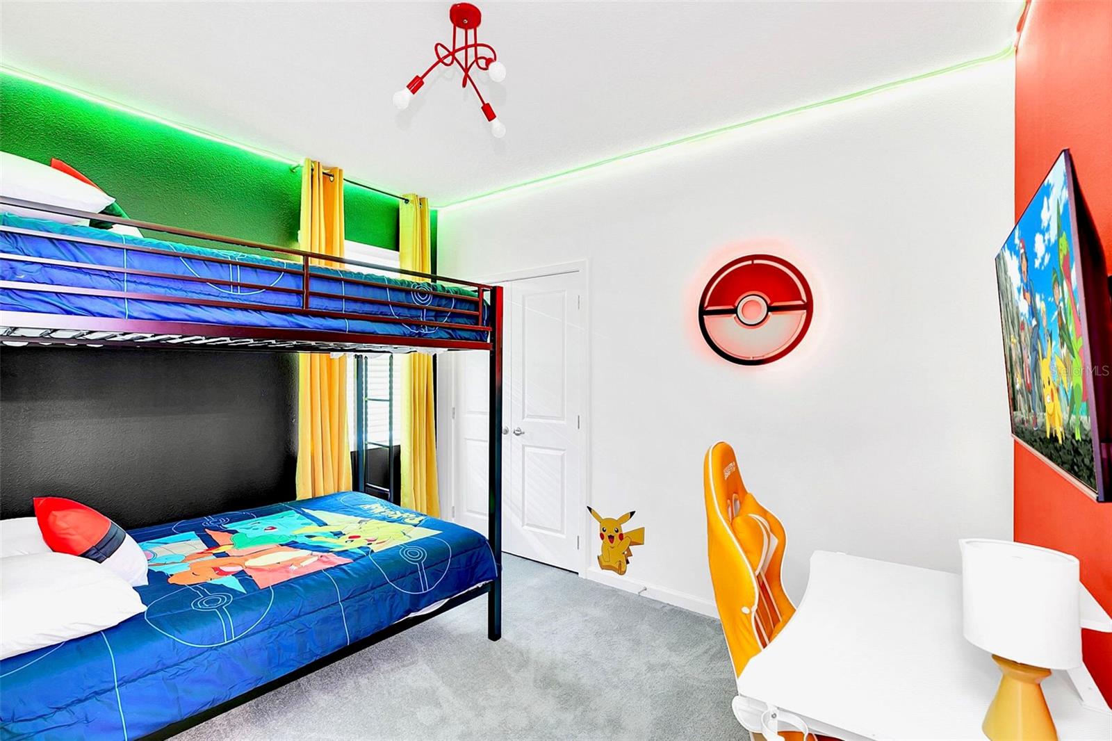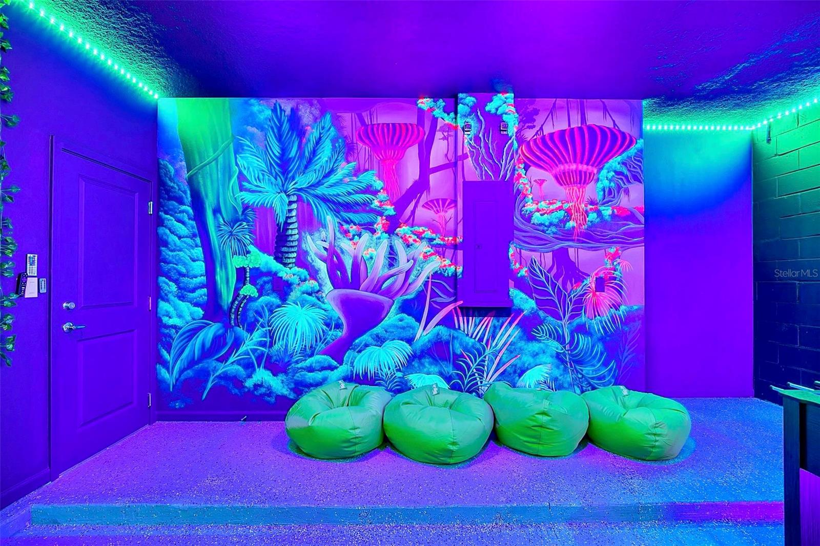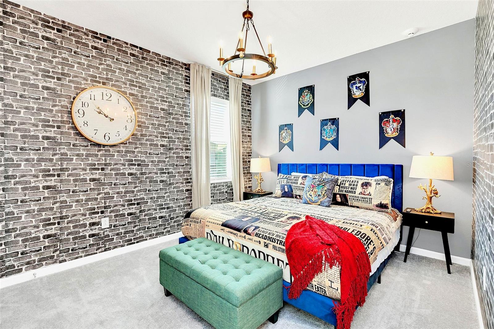 Inside, you’ll find a spacious open-plan living and dining area, perfect for gatherings, and a gourmet kitchen featuring two refrigerators, stainless steel appliances, solid-surface countertops, and a large island for entertaining. Themed bedrooms, crafted by a talented mural artist, bring a touch of magic to every stay, creating lasting memories for guests of all ages.
