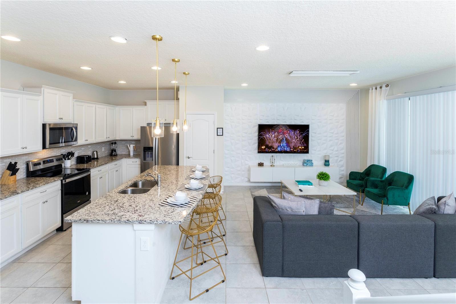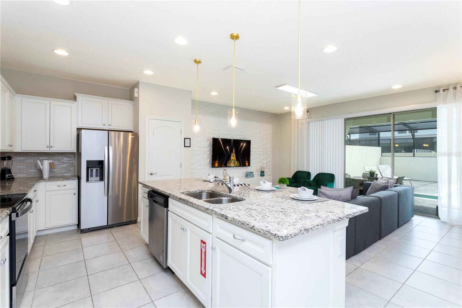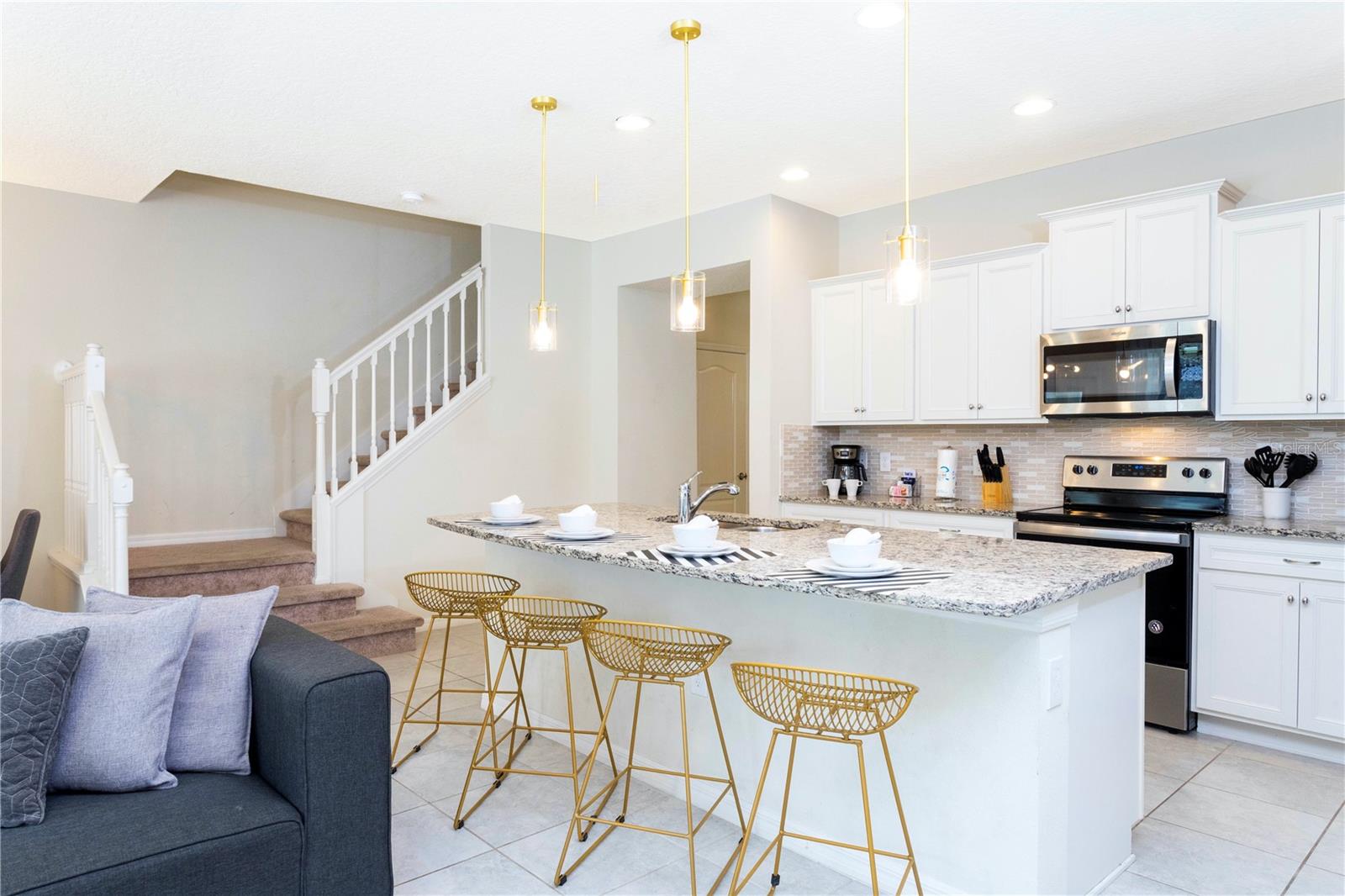 Offered fully furnished and turnkey-ready, this spacious home features a modern open-concept layout, stylish finishes, and thoughtful upgrades throughout. The gourmet kitchen boasts granite countertops, stainless steel appliances, and ample cabinetry, seamlessly connecting to the dining area and comfortable living room — perfect for entertaining or relaxing after a day at the parks.