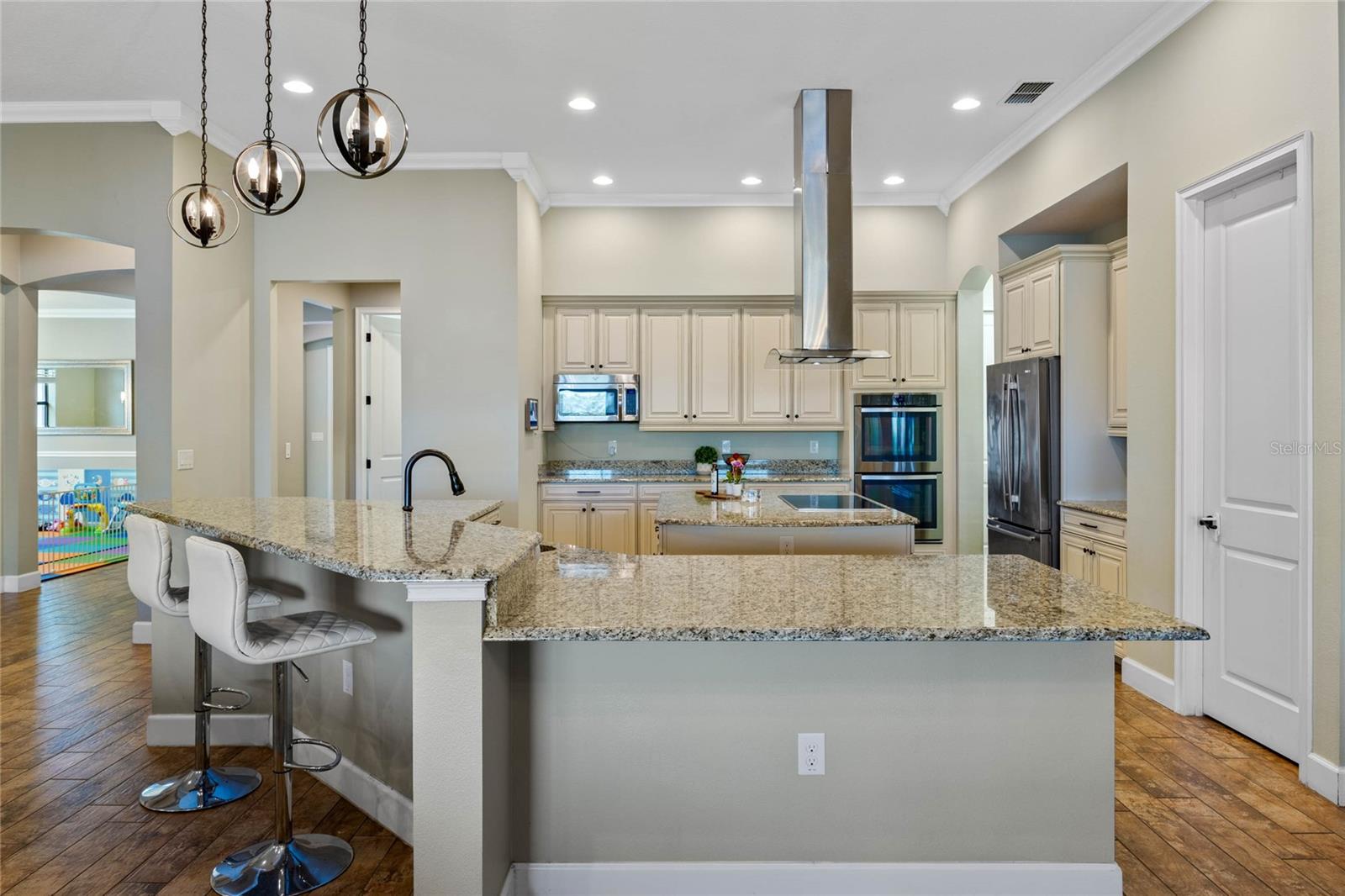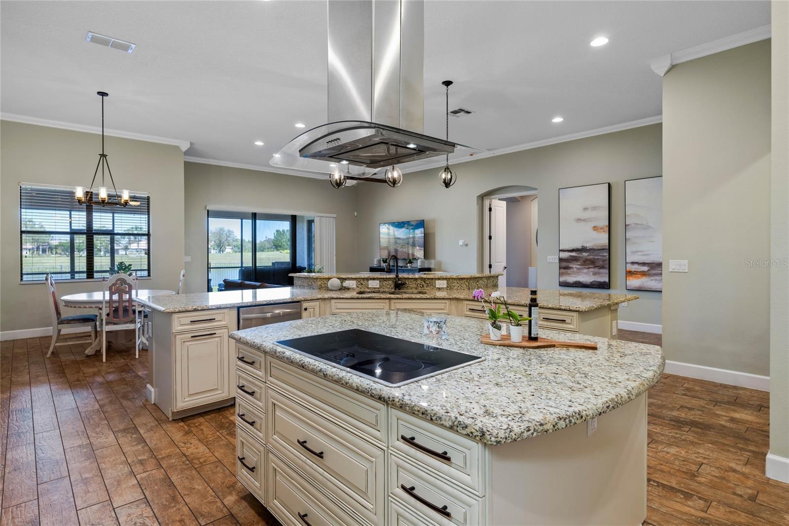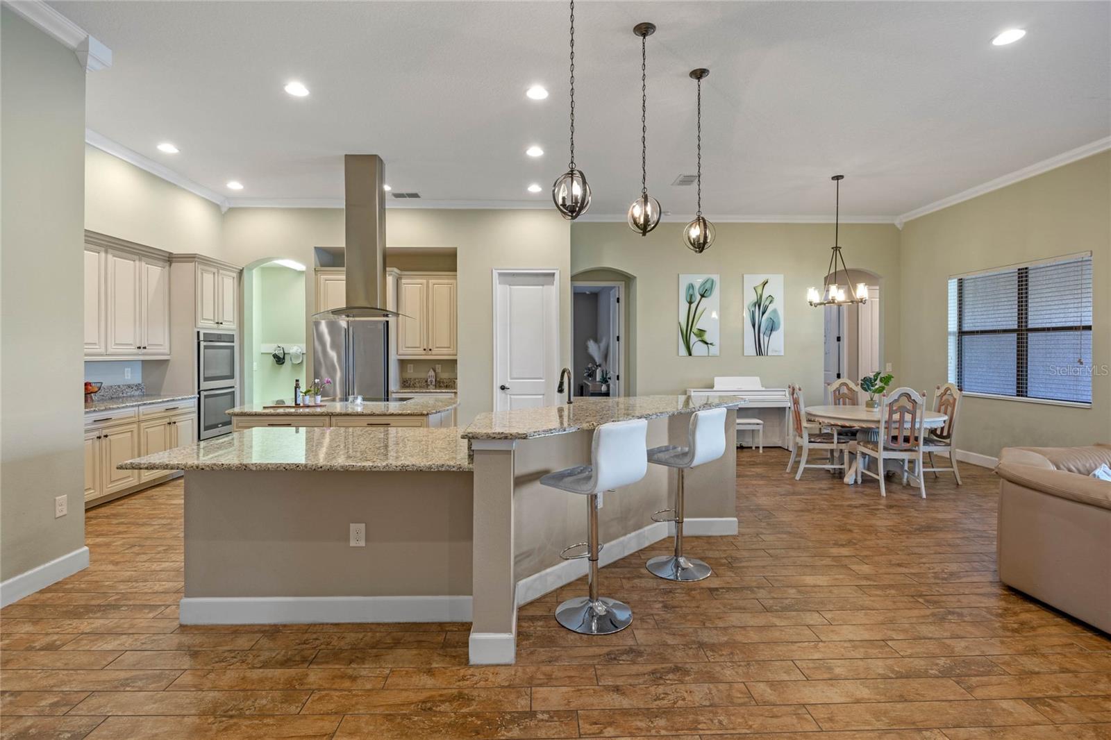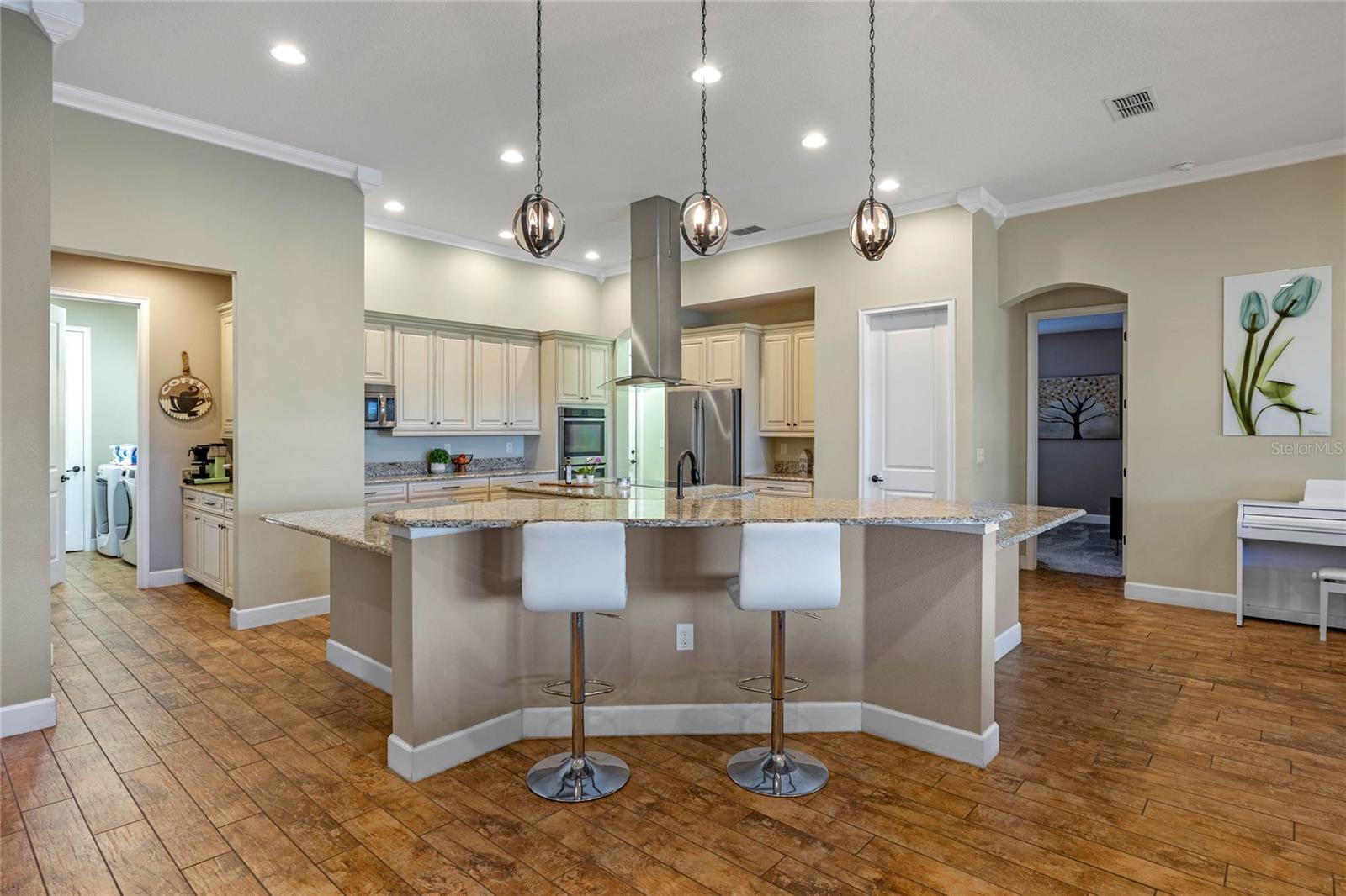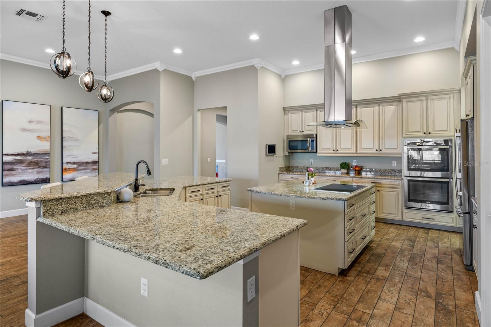 The gourmet kitchen is a chef’s dream, showcasing a huge center island with a cooktop, dual ovens, stainless steel appliances, and granite countertops. Enjoy casual meals in the eat-in kitchen space or host elegant gatherings in the formal dining room. The primary suite is a private retreat, featuring his and hers walk-in closets and direct access to the lanai through sliding doors. The owner’s bath is designed for luxury with an enormous walk-in shower, dual sinks, and ample storage. One of the guest bedrooms includes its own private en-suite bathroom, making it ideal for visitors or multi-generational living. A well-equipped laundry room with storage cabinets adds to the home’s convenience.