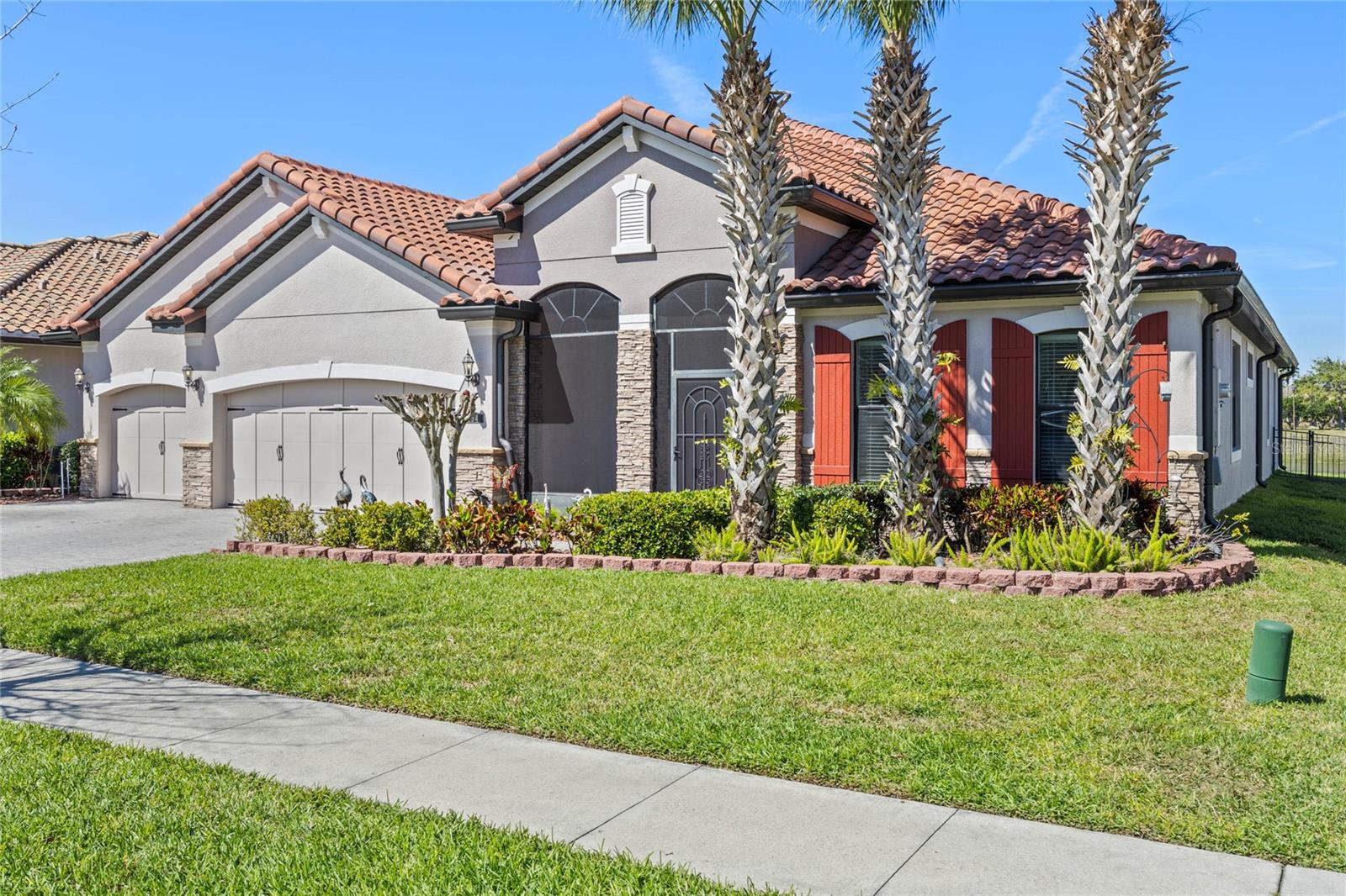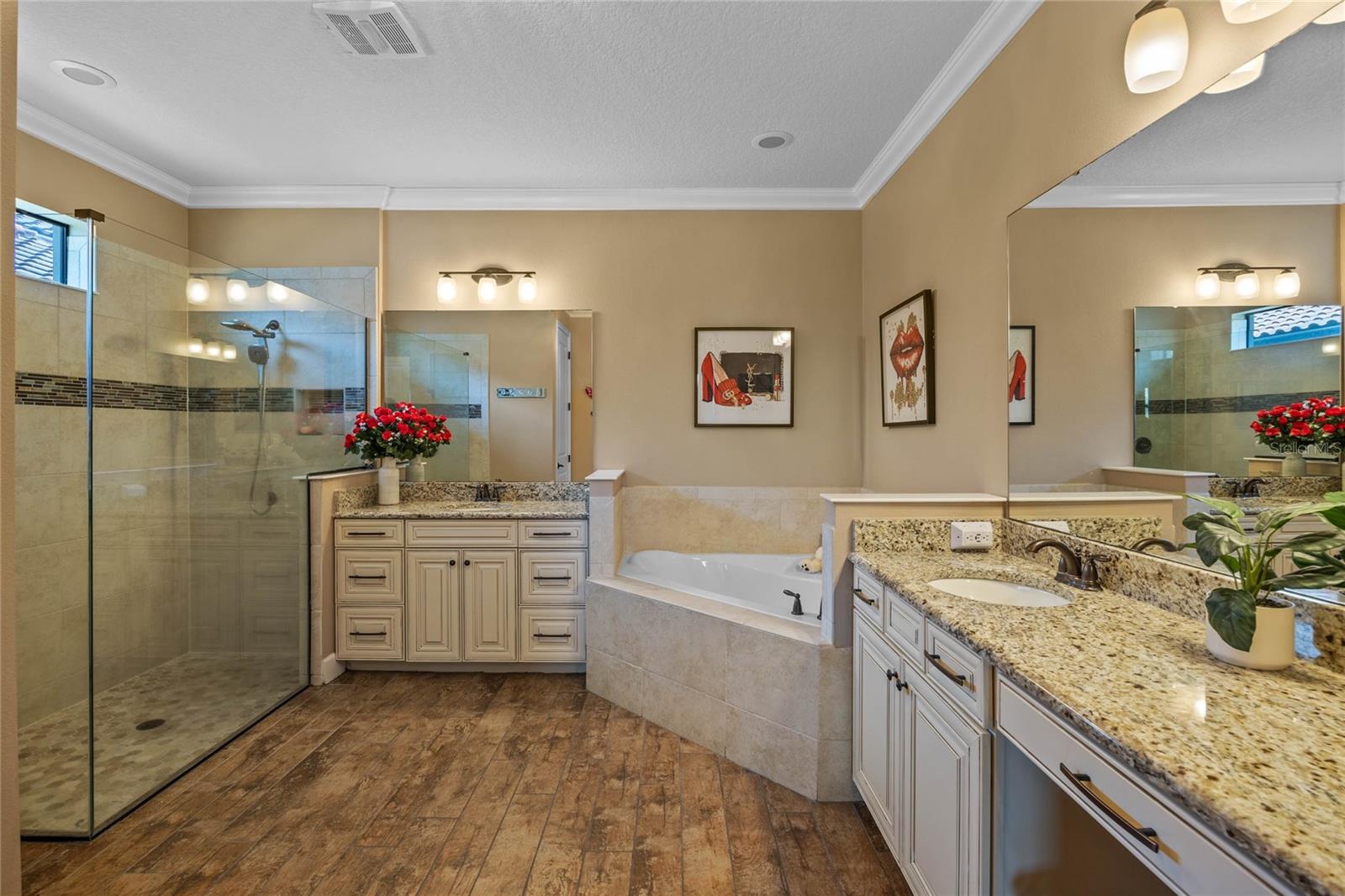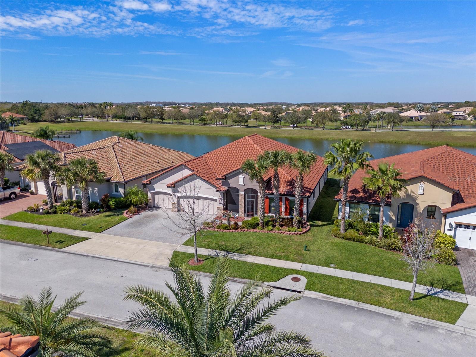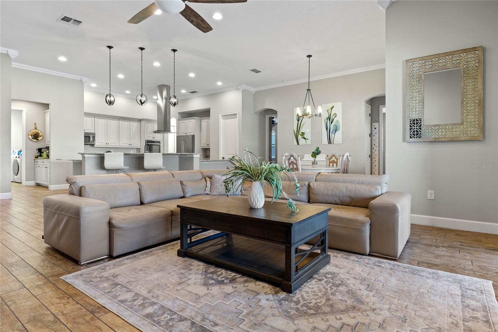 The gourmet kitchen is a chef’s dream, showcasing a huge center island with a cooktop, dual ovens, stainless steel appliances, and granite countertops. Enjoy casual meals in the eat-in kitchen space or host elegant gatherings in the formal dining room. The primary suite is a private retreat, featuring his and hers walk-in closets and direct access to the lanai through sliding doors. The owner’s bath is designed for luxury with an enormous walk-in shower, dual sinks, and ample storage. One of the guest bedrooms includes its own private en-suite bathroom, making it ideal for visitors or multi-generational living. A well-equipped laundry room with storage cabinets adds to the home’s convenience.