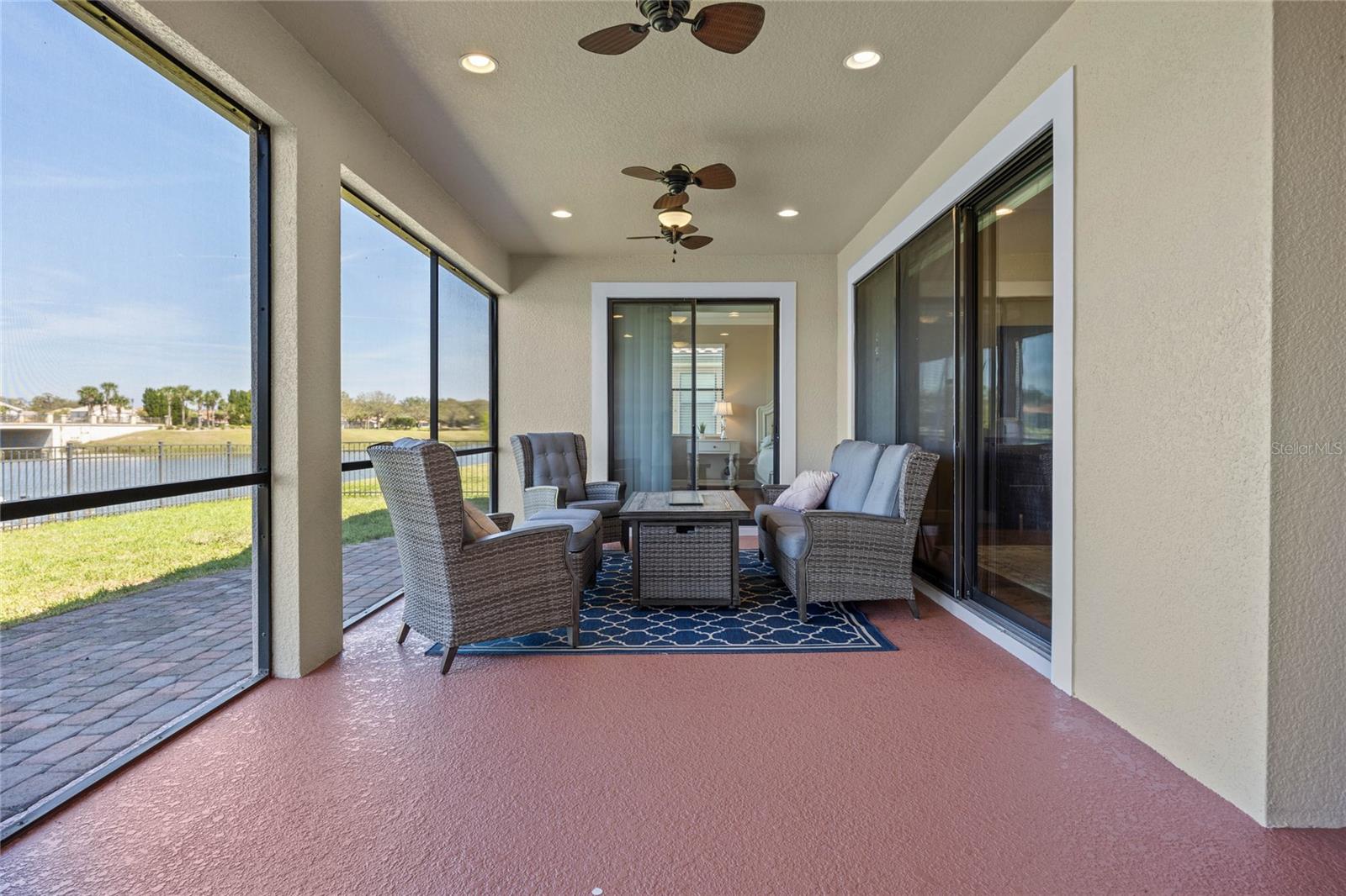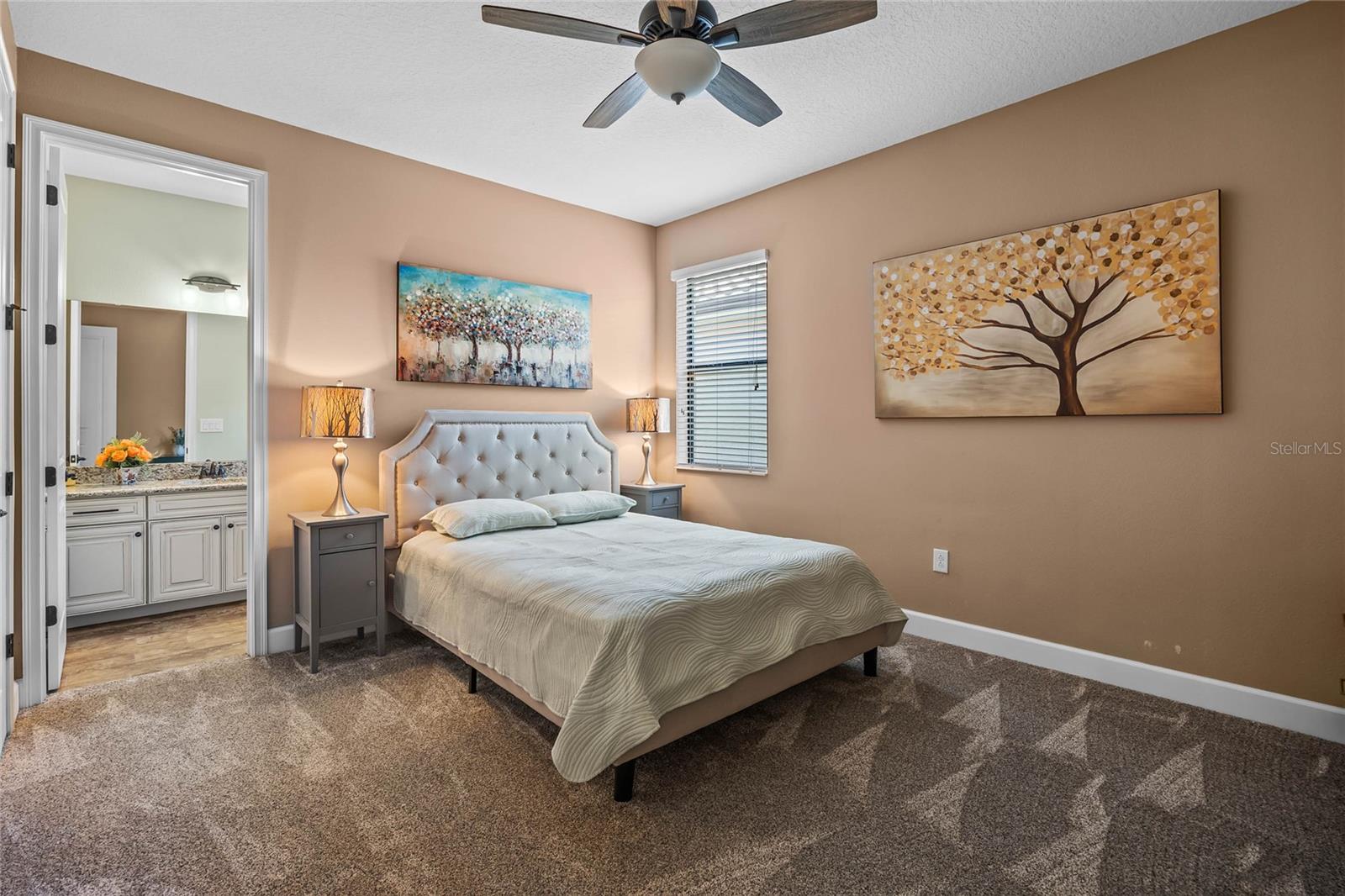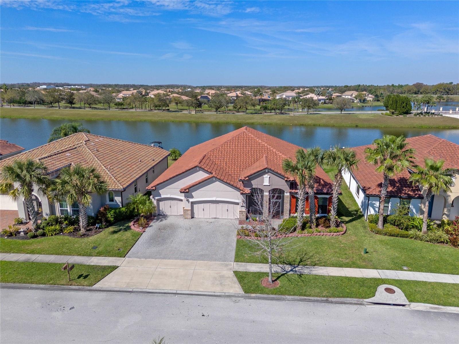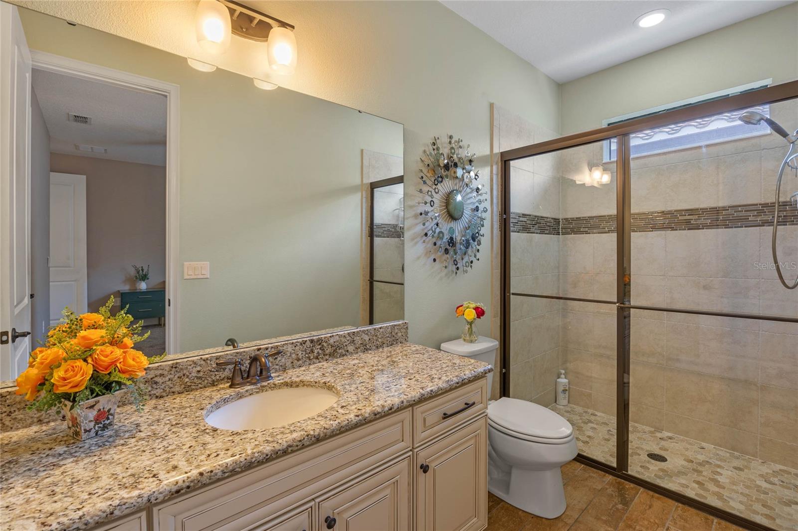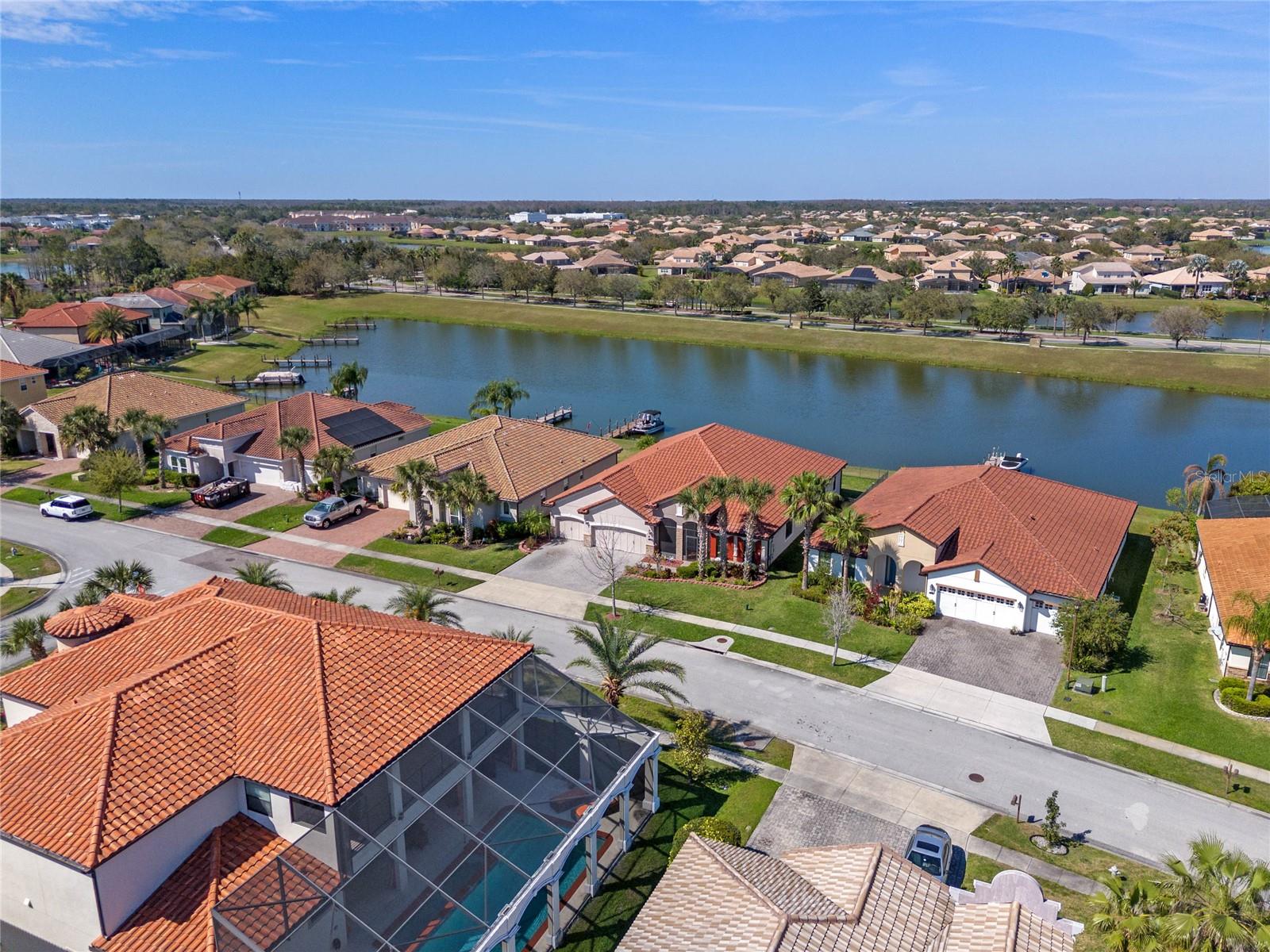 The gourmet kitchen is a chef’s dream, showcasing a huge center island with a cooktop, dual ovens, stainless steel appliances, and granite countertops. Enjoy casual meals in the eat-in kitchen space or host elegant gatherings in the formal dining room. The primary suite is a private retreat, featuring his and hers walk-in closets and direct access to the lanai through sliding doors. The owner’s bath is designed for luxury with an enormous walk-in shower, dual sinks, and ample storage. One of the guest bedrooms includes its own private en-suite bathroom, making it ideal for visitors or multi-generational living. A well-equipped laundry room with storage cabinets adds to the home’s convenience.