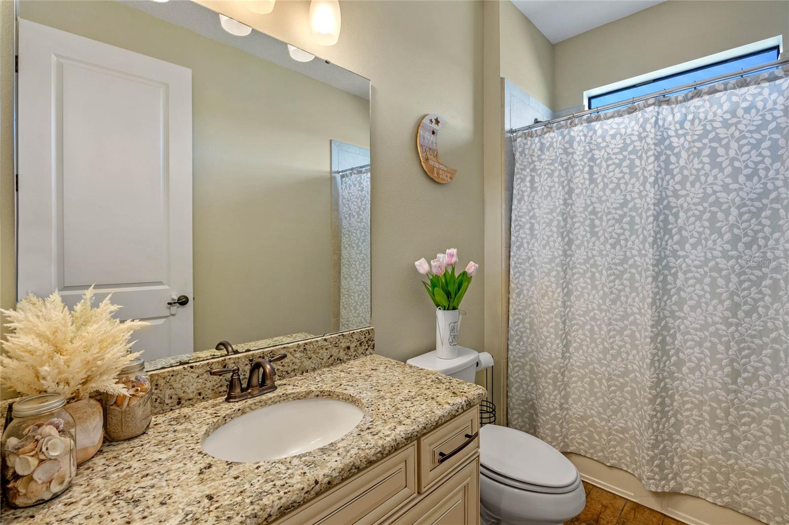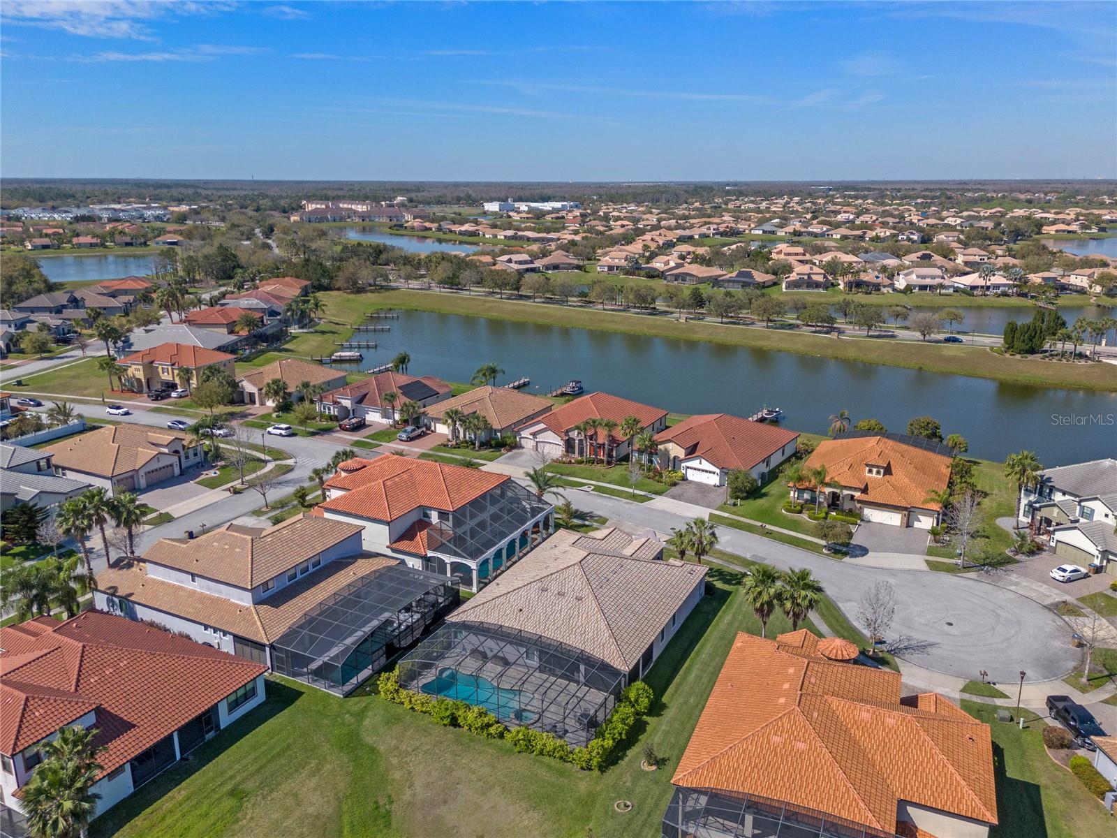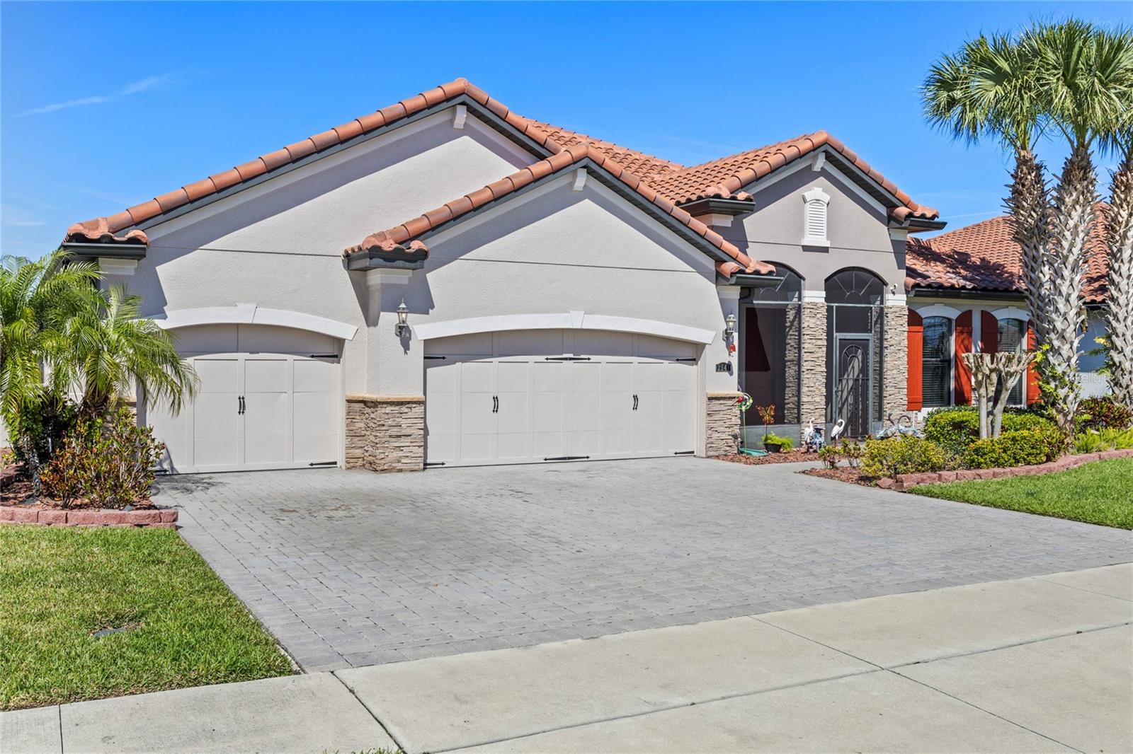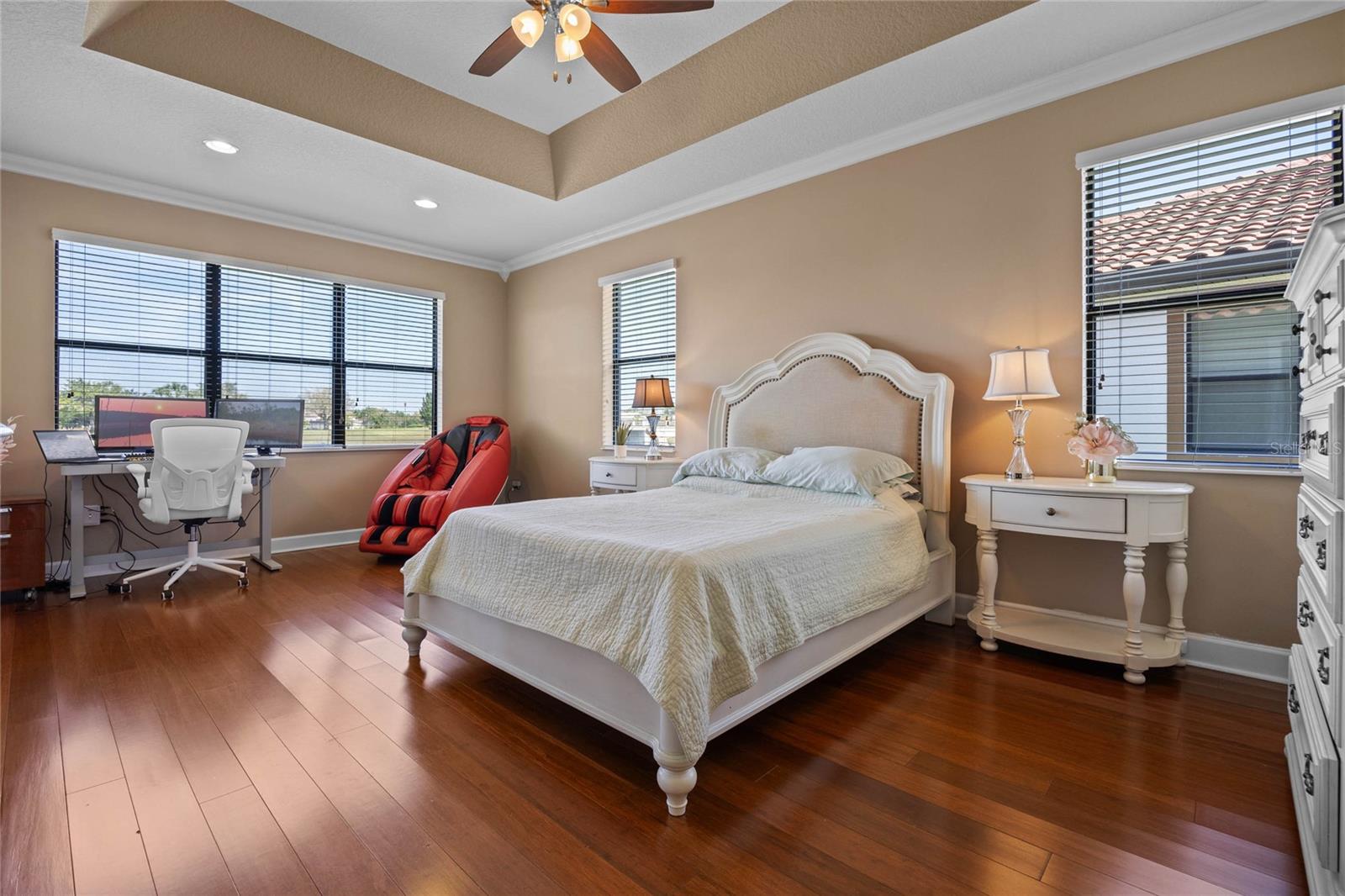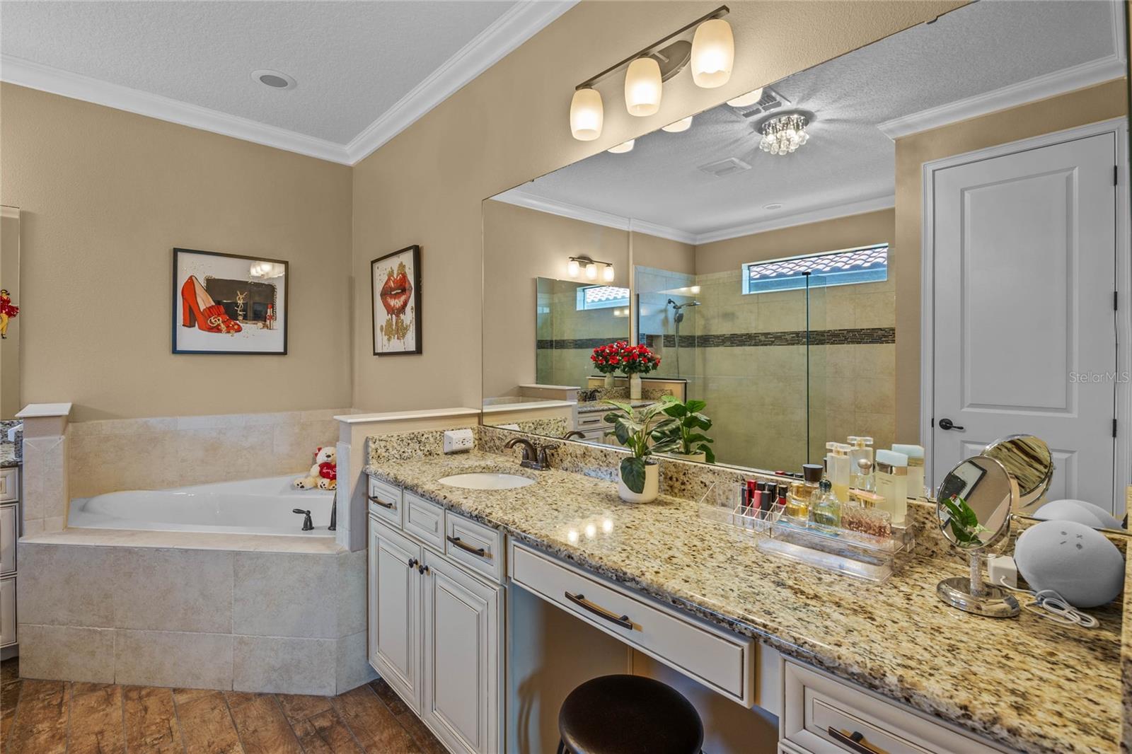 The gourmet kitchen is a chef’s dream, showcasing a huge center island with a cooktop, dual ovens, stainless steel appliances, and granite countertops. Enjoy casual meals in the eat-in kitchen space or host elegant gatherings in the formal dining room. The primary suite is a private retreat, featuring his and hers walk-in closets and direct access to the lanai through sliding doors. The owner’s bath is designed for luxury with an enormous walk-in shower, dual sinks, and ample storage. One of the guest bedrooms includes its own private en-suite bathroom, making it ideal for visitors or multi-generational living. A well-equipped laundry room with storage cabinets adds to the home’s convenience.