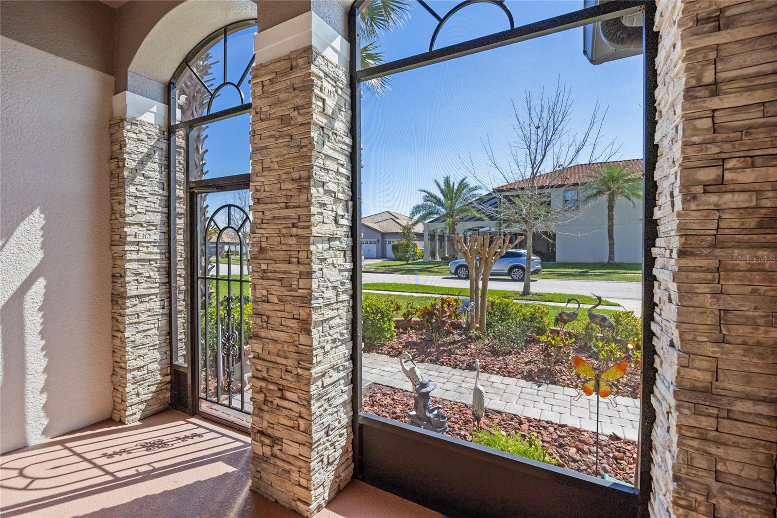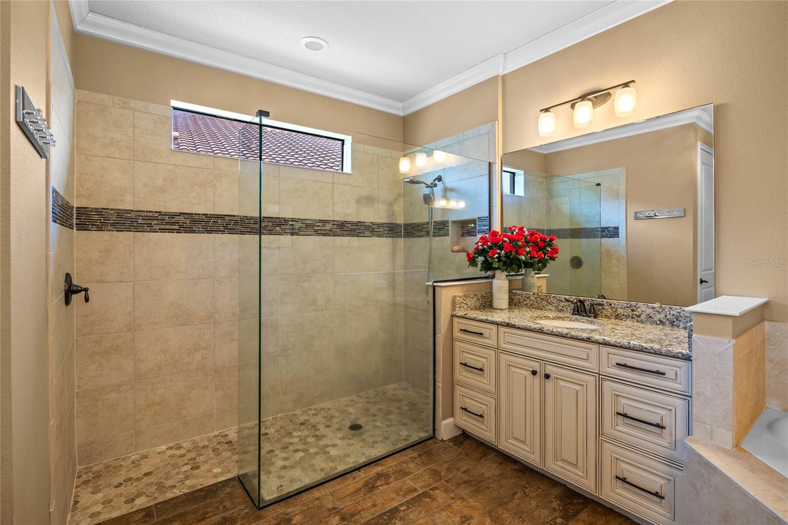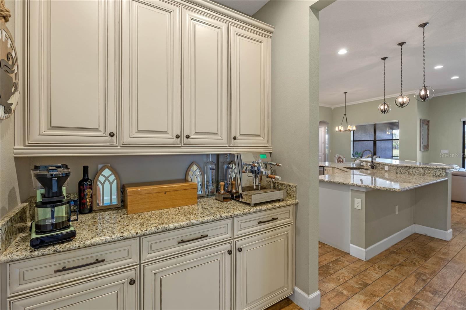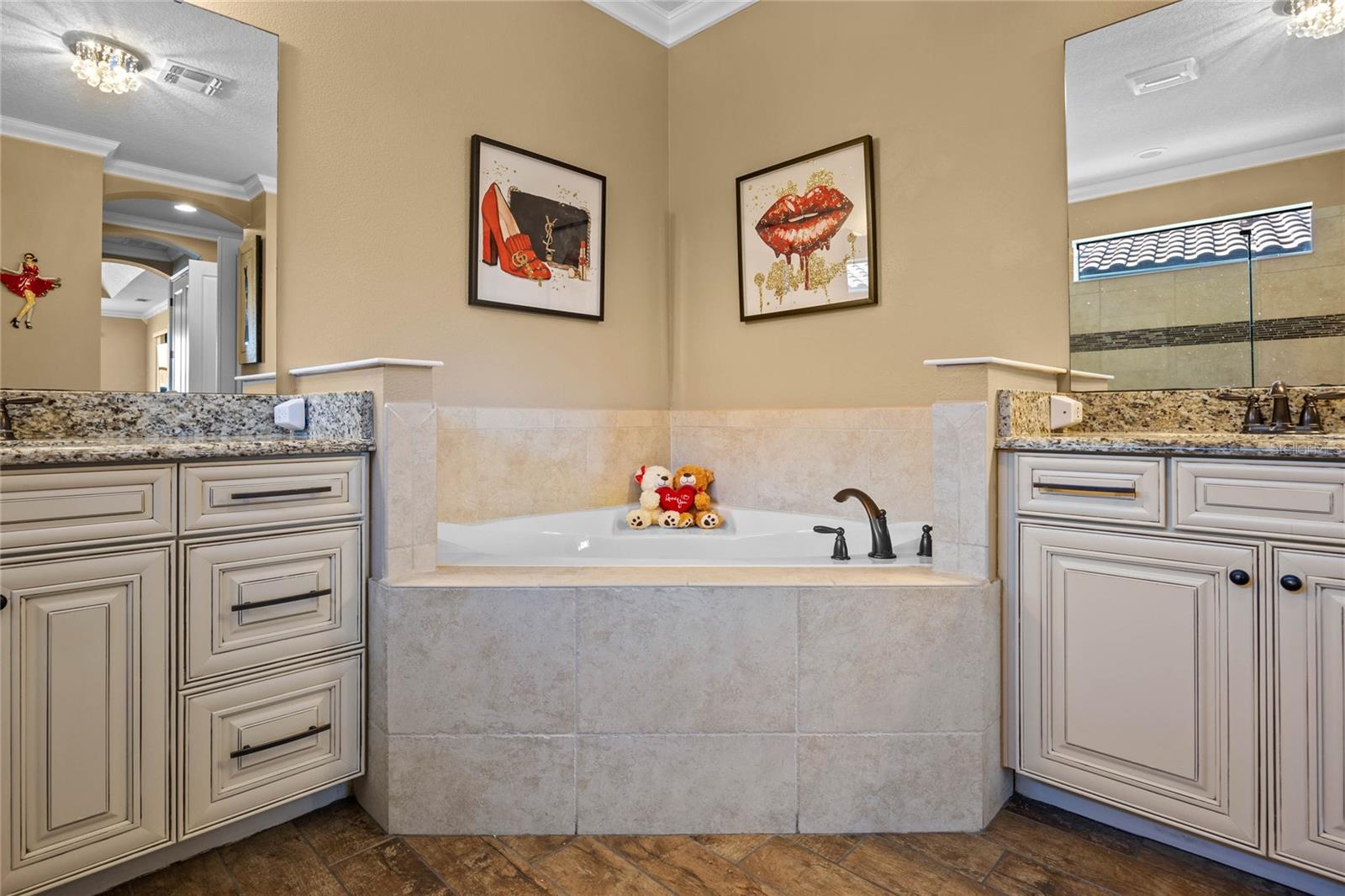 The gourmet kitchen is a chef’s dream, showcasing a huge center island with a cooktop, dual ovens, stainless steel appliances, and granite countertops. Enjoy casual meals in the eat-in kitchen space or host elegant gatherings in the formal dining room. The primary suite is a private retreat, featuring his and hers walk-in closets and direct access to the lanai through sliding doors. The owner’s bath is designed for luxury with an enormous walk-in shower, dual sinks, and ample storage. One of the guest bedrooms includes its own private en-suite bathroom, making it ideal for visitors or multi-generational living. A well-equipped laundry room with storage cabinets adds to the home’s convenience.