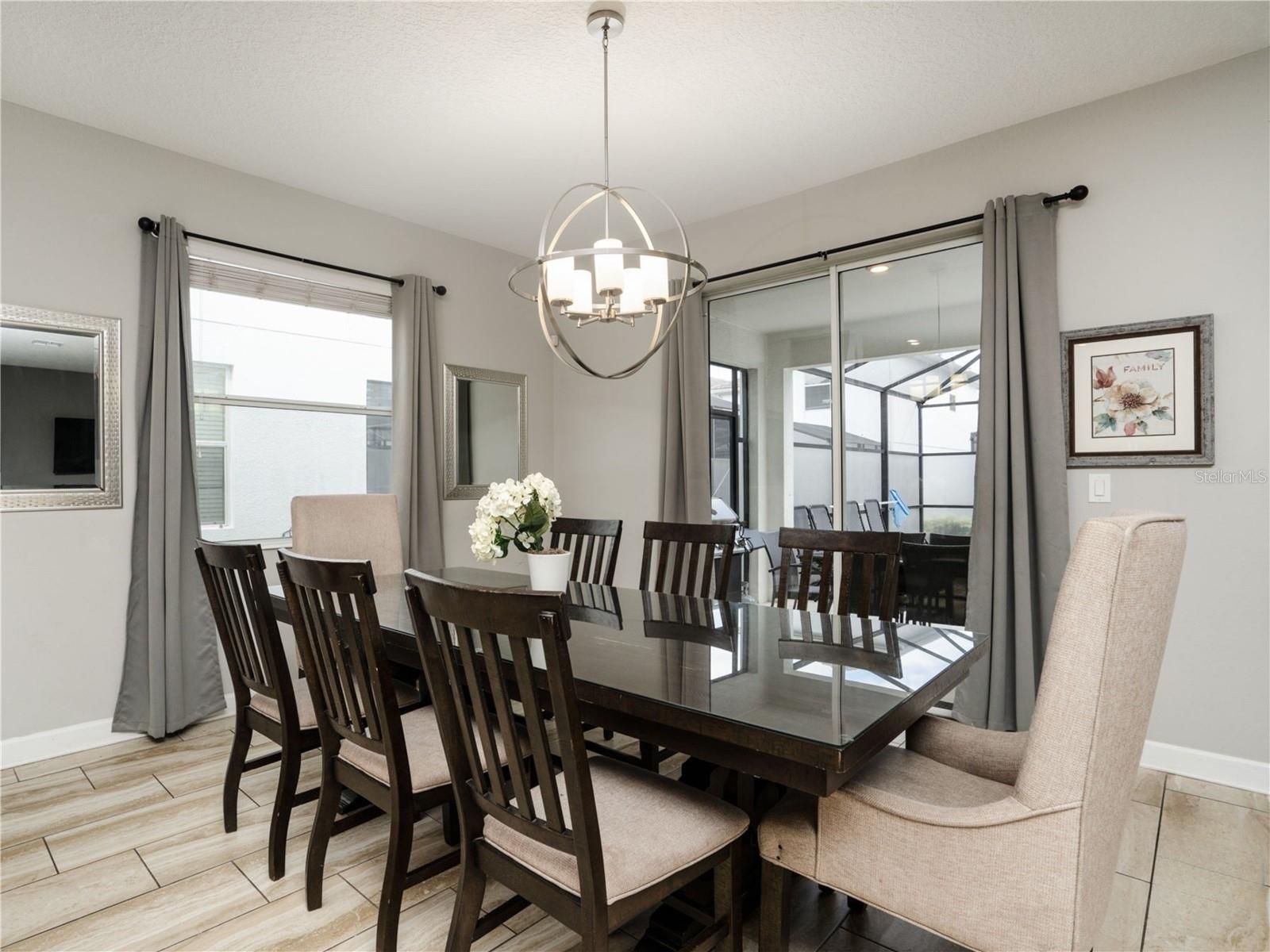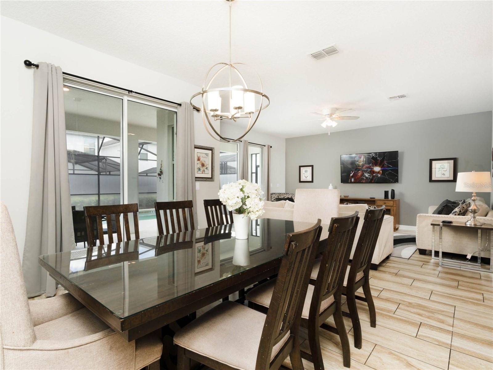 The home features a private screened-in pool, a covered lanai, and outdoor lounge furniture—perfect for enjoying Florida’s sunshine. The property is being offered turnkey with modern furnishings, TVs in every bedroom, central AC, and a fully equipped kitchen with granite countertops and stainless steel appliances.