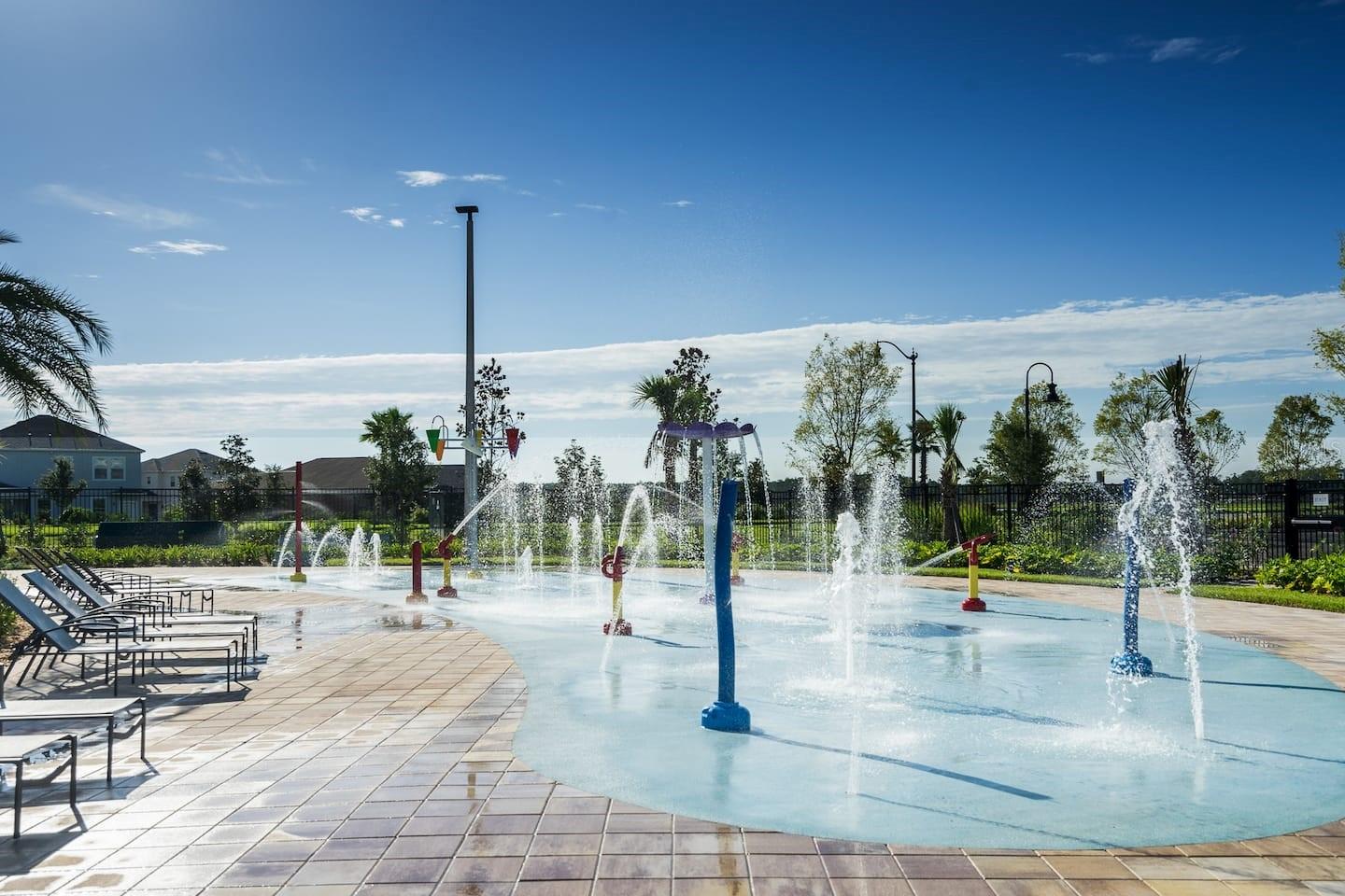 Resort-style pool with water slide and splash pad