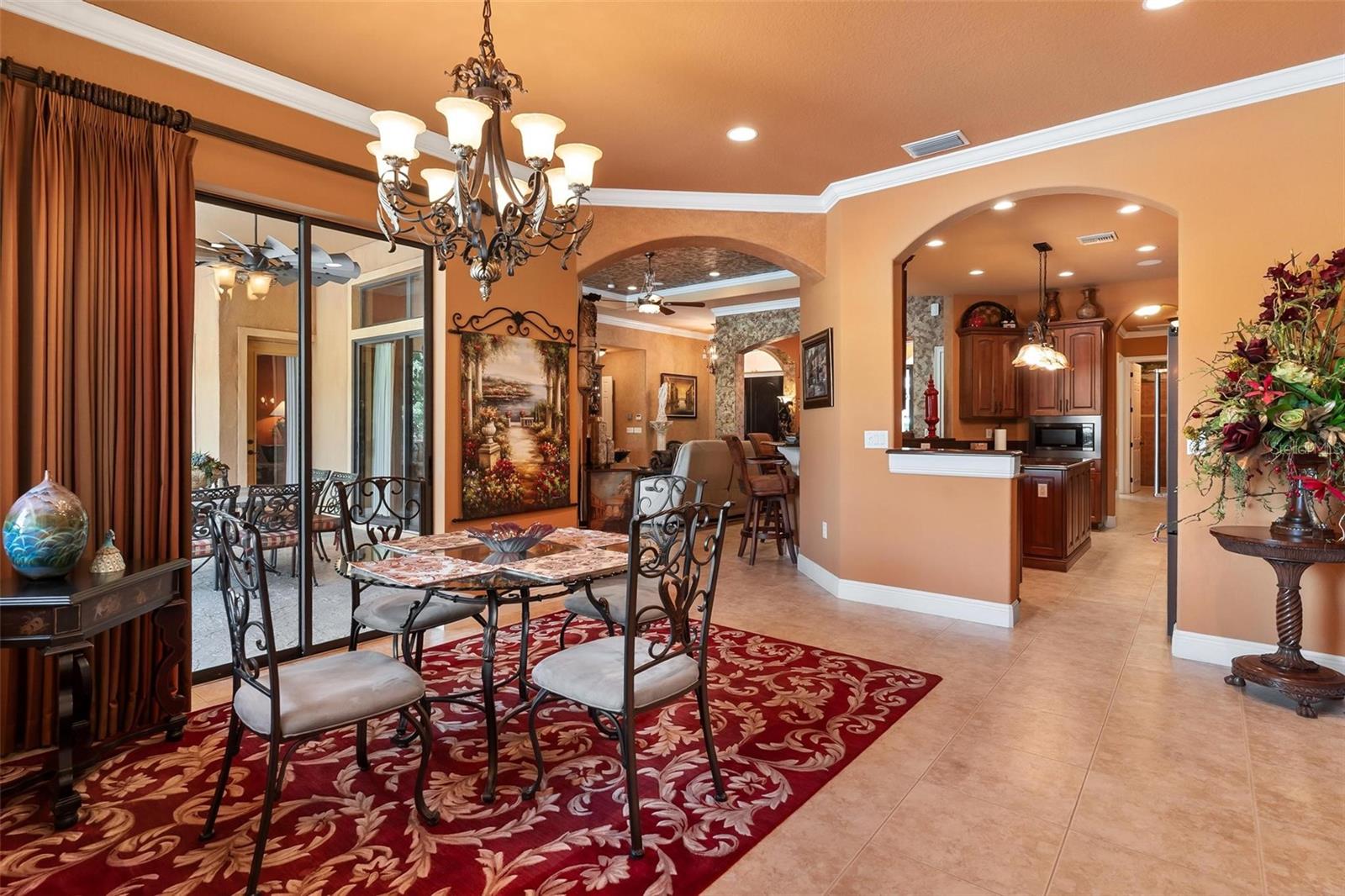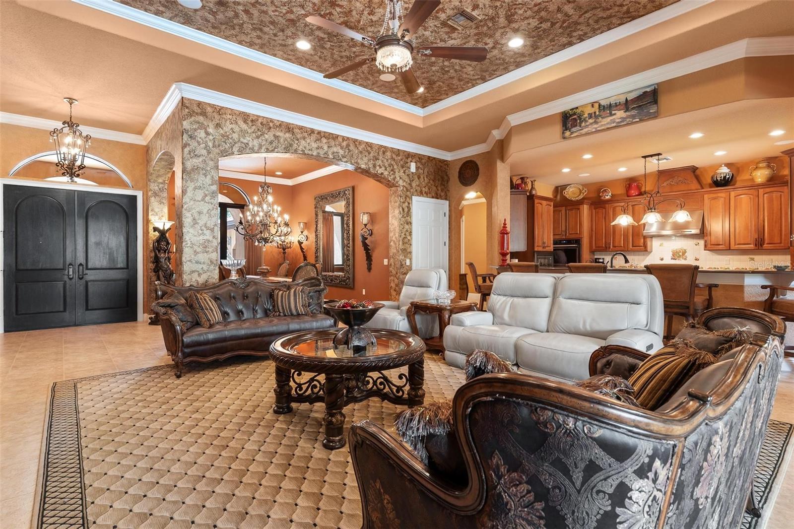 ELEGANT "TUSCANY ESTATE" POOL HOME in a Prestigious Guard Gated Golf Community! Welcome to this exceptional 4-bedroom, 4-bathroom custom residence located on a beautifully manicured 1.4-acre double lot on the golf course! From the moment you arrive, you’ll be captivated by the meticulous attention to detail—as you stroll through the professionally designed landscaping with Vista Pro grass and multi-level gardens to the grand 22-foot fountain, and extensive custom outdoor lighting. Perfect for entertaining, the screened lanai boasts an outdoor fireplace, full summer kitchen with under counter ice maker, surround sound system, custom lights, and a stamped concrete floor. Enjoy year-round luxury in the saltwater heated pool and spa for effortless hosting. Indoors, your private home theatre awaits, featuring tiered seating with 8 leather recliners, an 8x5 projection screen, and high-end audio-visual equipment that conveys with the home. The gourmet kitchen is a chef’s dream, offering granite countertops, center island, double wall ovens, a 6-burner Thermador gas range, trash compactor, dishwasher, and under-sink reverse osmosis system plus a large walk-in pantry! The open-concept great room includes a full bar with ice maker, trey ceilings, and detailed crown molding. You will love having 8-foot doors throughout. Retreat to the expansive primary suite and bath complete with an electric fireplace, jetted tub, oversized walk-in shower, dual custom walk-in closets and vanities. The second private en suite guest room includes its own bath and walk-in closet. Guest bedroom three is oversized share the 3rd guest bath! The dedicated office with custom built-ins can easily serve as a fourth bedroom. No worries if the electric goes out with your own Whole-house generator with a 500-gallon buried propane tank. Endless hot water with the commercial-grade tankless water heater (installed 2024). More upgrades to include the Water softener and whole-house filtration system. Two HVAC units (replaced approx. 7 years ago). Huge 3-car garage with epoxy floors, insulated doors, custom cabinetry, and climate-controlled walk-in storage! Additional parking pad for two vehicles. Every detail of this home reflects exceptional quality and luxurious living. A rare opportunity to own a showpiece in one of the region’s most sought-after communities. Clubhouse membership is optional for additional fees will give you access to the marina, RV storage, community pool, fitness room, tennis, pickleball, activities and more. YOUR RESORT STYLE LIVING AWAITS...CALL TODAY!