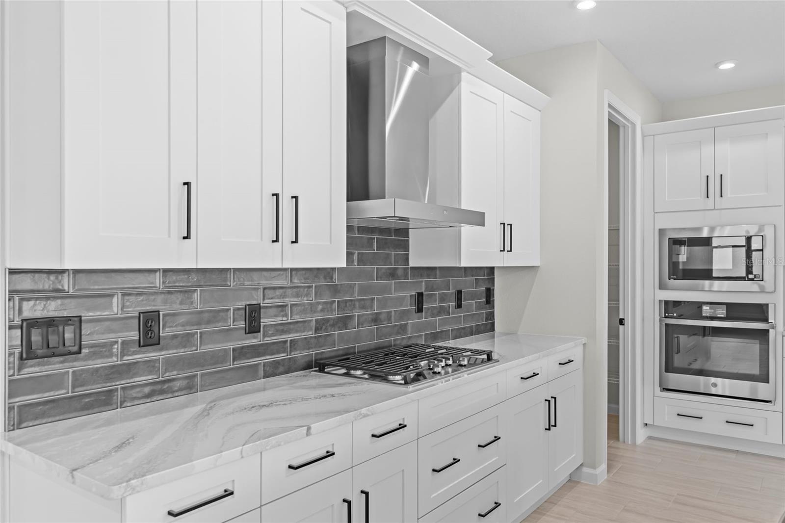 The centerpiece of the home is the gourmet kitchen, crafted for both functionality and elegance. Enjoy preparing meals with premium stainless steel appliances, including a wall oven, gas cooktop, and an efficient chimney-style exhaust hood. Frameless European-style cabinetry with upgraded large crown molding offers abundant storage and a contemporary look, while the 24” deep cabinet above the refrigerator with a side panel provides extra convenience. The kitchen is adorned with stunning 3cm luxury veined quartz countertops and an artisan tile backsplash, perfect for both daily living and entertaining guests.
