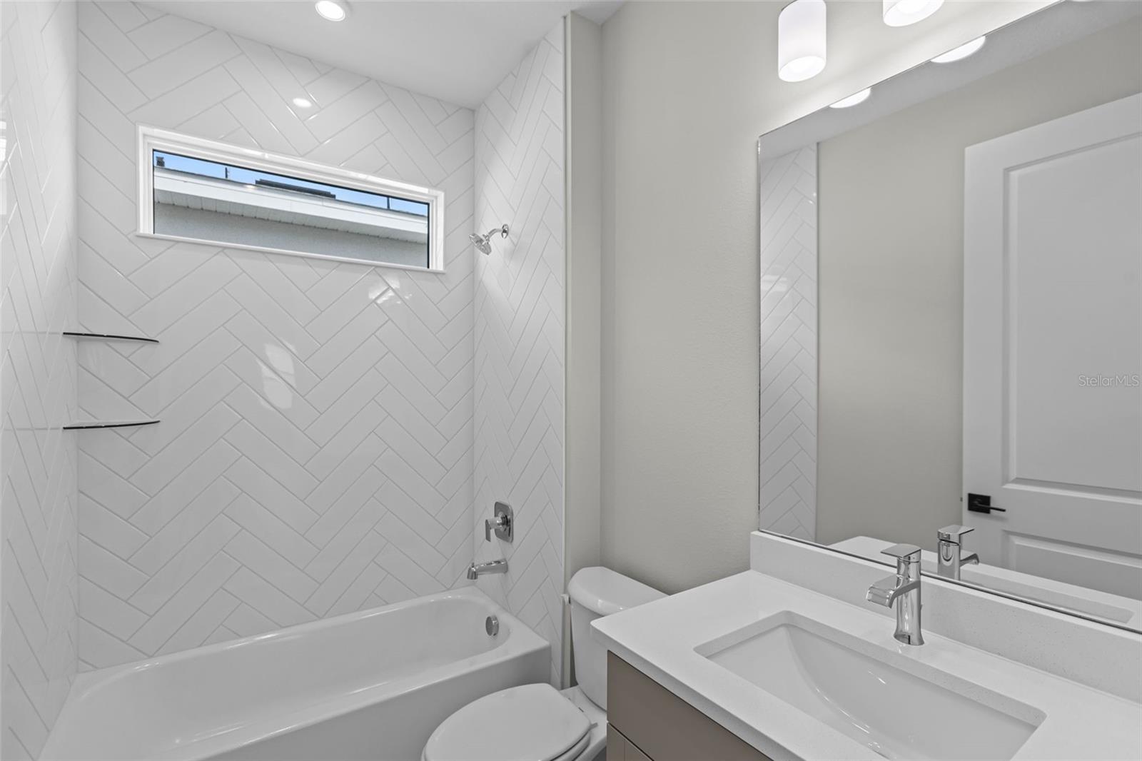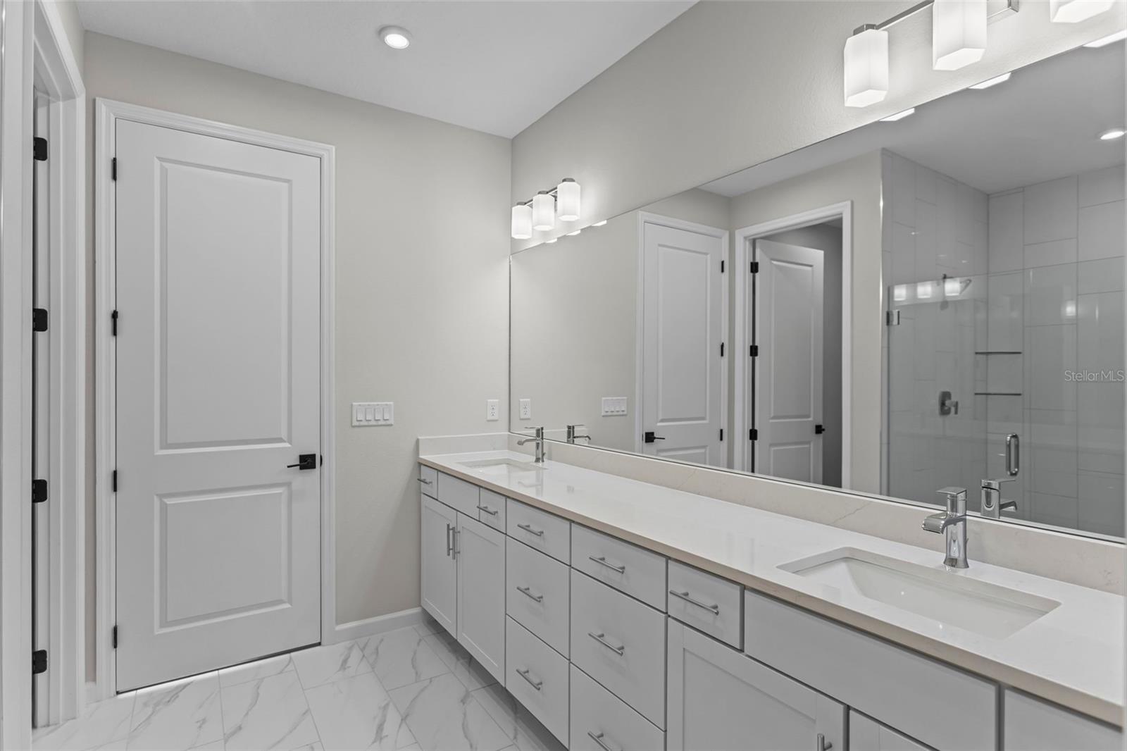 The Owner’s Suite is a true retreat, featuring a luxurious extended shower with a frameless glass enclosure, upgraded stone mosaic tile flooring, and both a standard and handheld showerhead with a slide bar. All bathrooms include upgraded plumbing fixtures and tile that extends to the ceiling, providing a spa-like atmosphere. The home’s main living areas are finished with elegant 12x24 porcelain tile, while the Owner’s Suite and flex space feature stylish laminate plank wood flooring for warmth and durability.