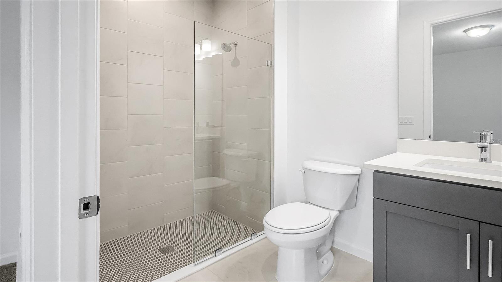 The Owner’s Suite is a true retreat, featuring a luxurious extended shower with a frameless glass enclosure, upgraded stone mosaic tile flooring, and both a standard and handheld showerhead with a slide bar. All bathrooms include upgraded plumbing fixtures and tile that extends to the ceiling, providing a spa-like atmosphere. The home’s main living areas and Owner’s Suite and flex space feature stylish luxury wood-look vinyl plank flooring for warmth and durability.