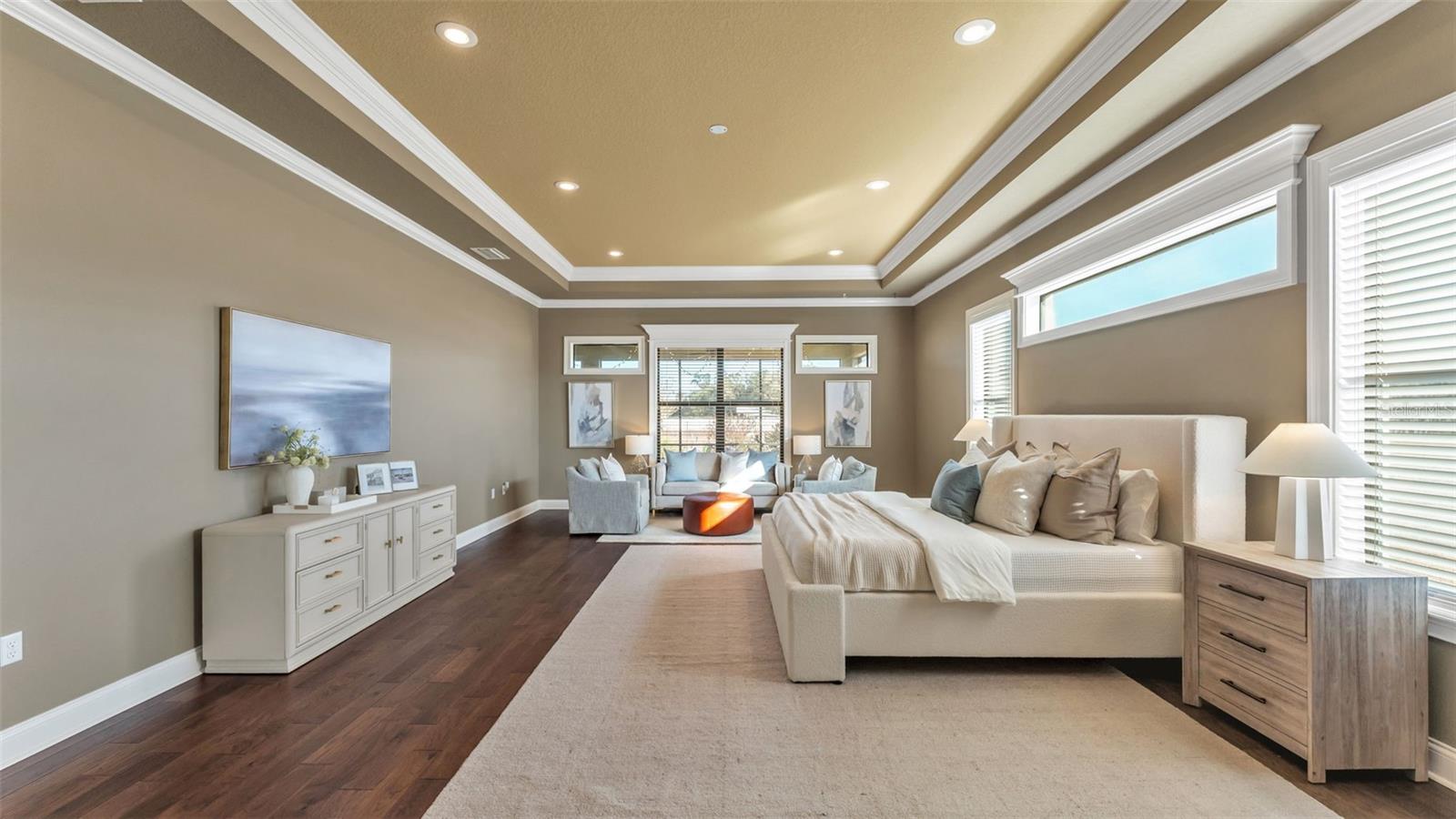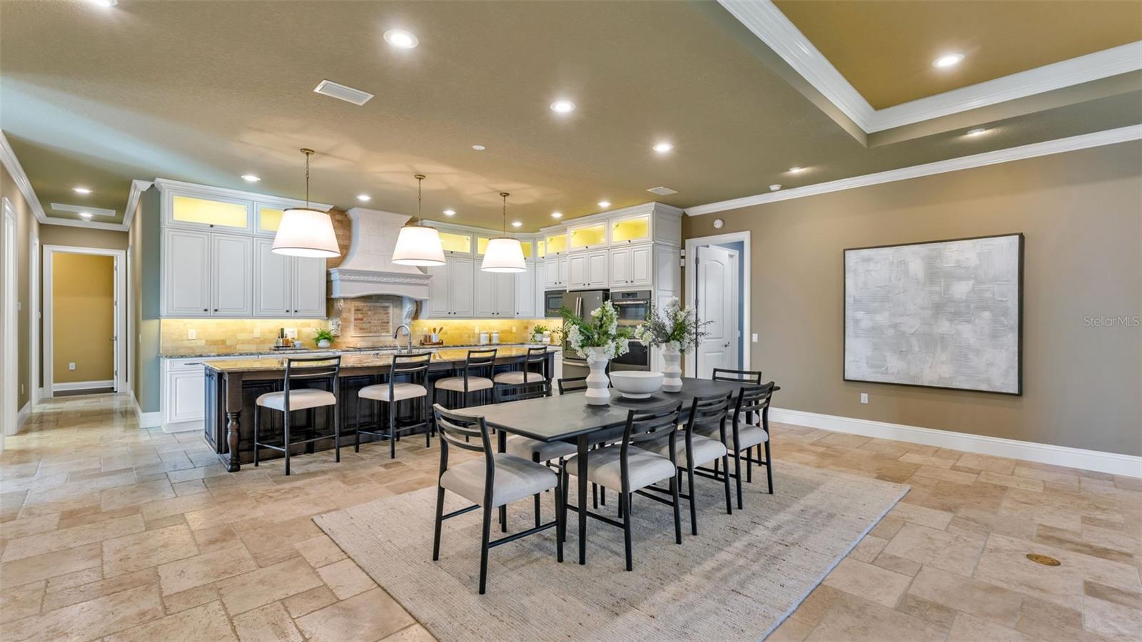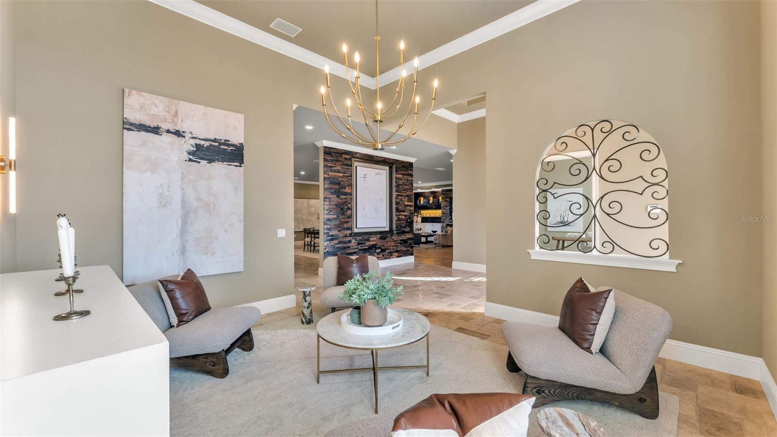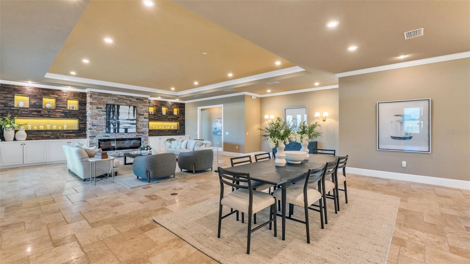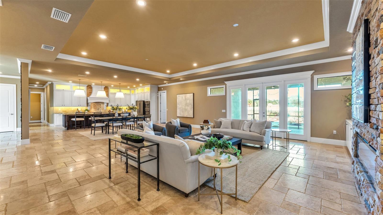 Inside, you’ll find travertine stone and hardwood floors, crown molding throughout, and generous ceiling heights, including a tall foyer and tray ceilings in the great room and primary bedroom. The great room is spacious and welcoming, with room for multiple seating areas, built-in cabinetry, accent lighting, and an electric fireplace. French doors open to the screened porch and courtyard, creating an easy connection to outdoor living.