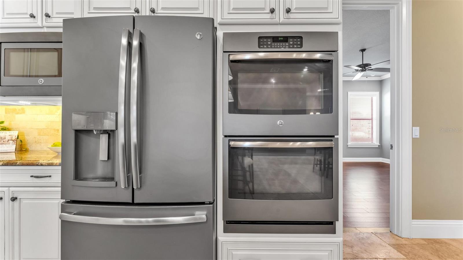 The kitchen was designed for both everyday use and entertaining, with upgraded granite countertops, an oversized island with double sinks, double ovens, custom cabinetry with extensive storage, a built-in microwave, and a walk-in pantry. The oversized laundry room includes granite countertops, a wash tub, and added sound insulation between the laundry and adjacent bedroom.