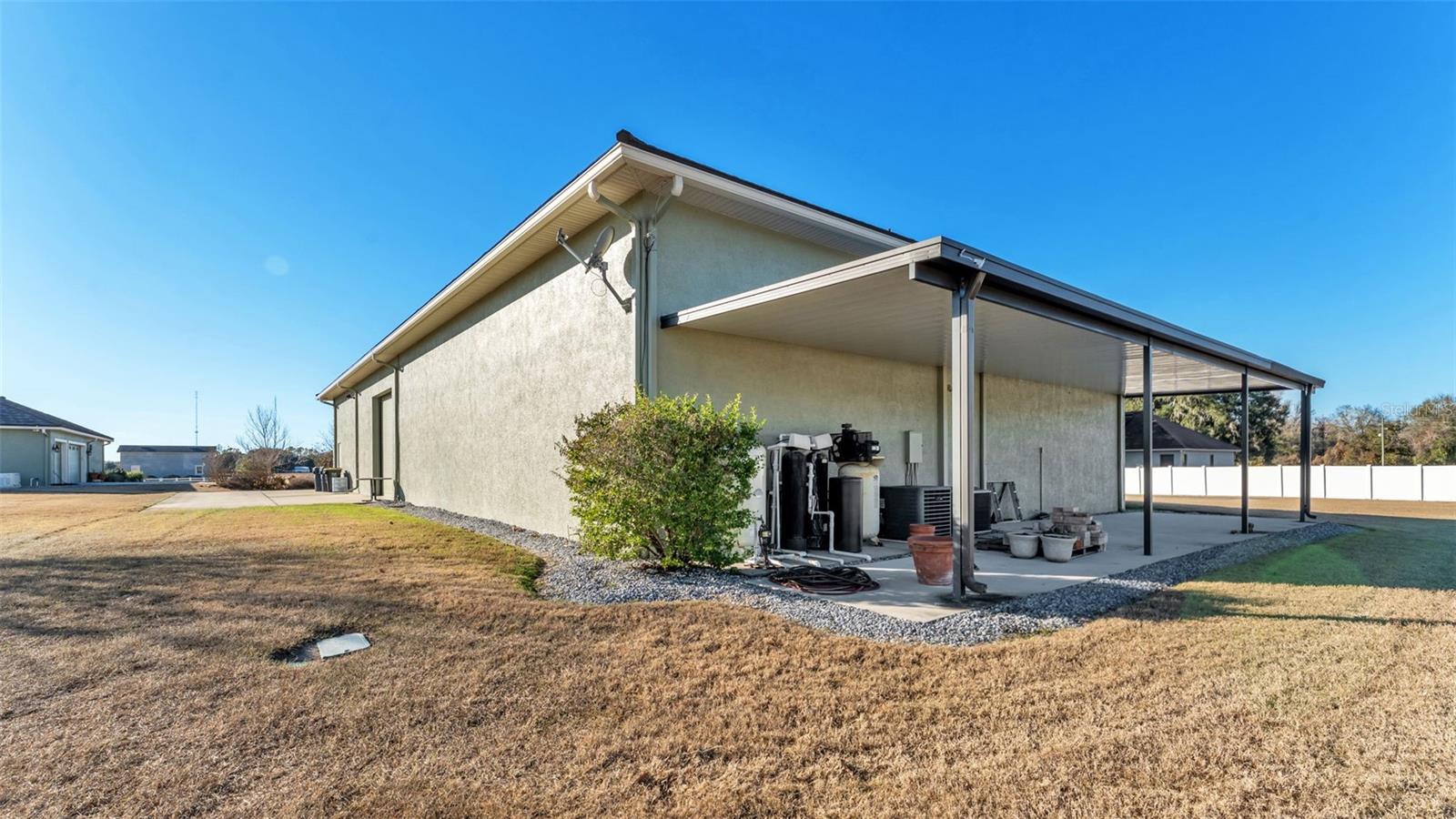 A major standout feature of this property is the detached 5,000-square-foot, climate-controlled shop, built in 2014 to commercial-grade standards. Designed for serious use, the shop features 16-foot ceilings, epoxy-coated chemical-resistant floors, dual A/C systems, multiple RV and welder hookups, and extensive electrical and air infrastructure throughout. The star of the shop is a Challenger 10,000-lb asymmetrical two-post vehicle lift with in-floor power, making the shop ideal for automotive work, collections, RVs, and more. Additional features include an integrated air compressor system plumbed throughout, 20x20 mezzanine storage, office space with a dedicated FRP clean room for engine assembly, (3) insulated overhead power roll-up doors, hard-wired internet from the main home, and 14x50 aluminum carport with a concrete pad for storage and cover for water tank, filtration systems and air compressors.