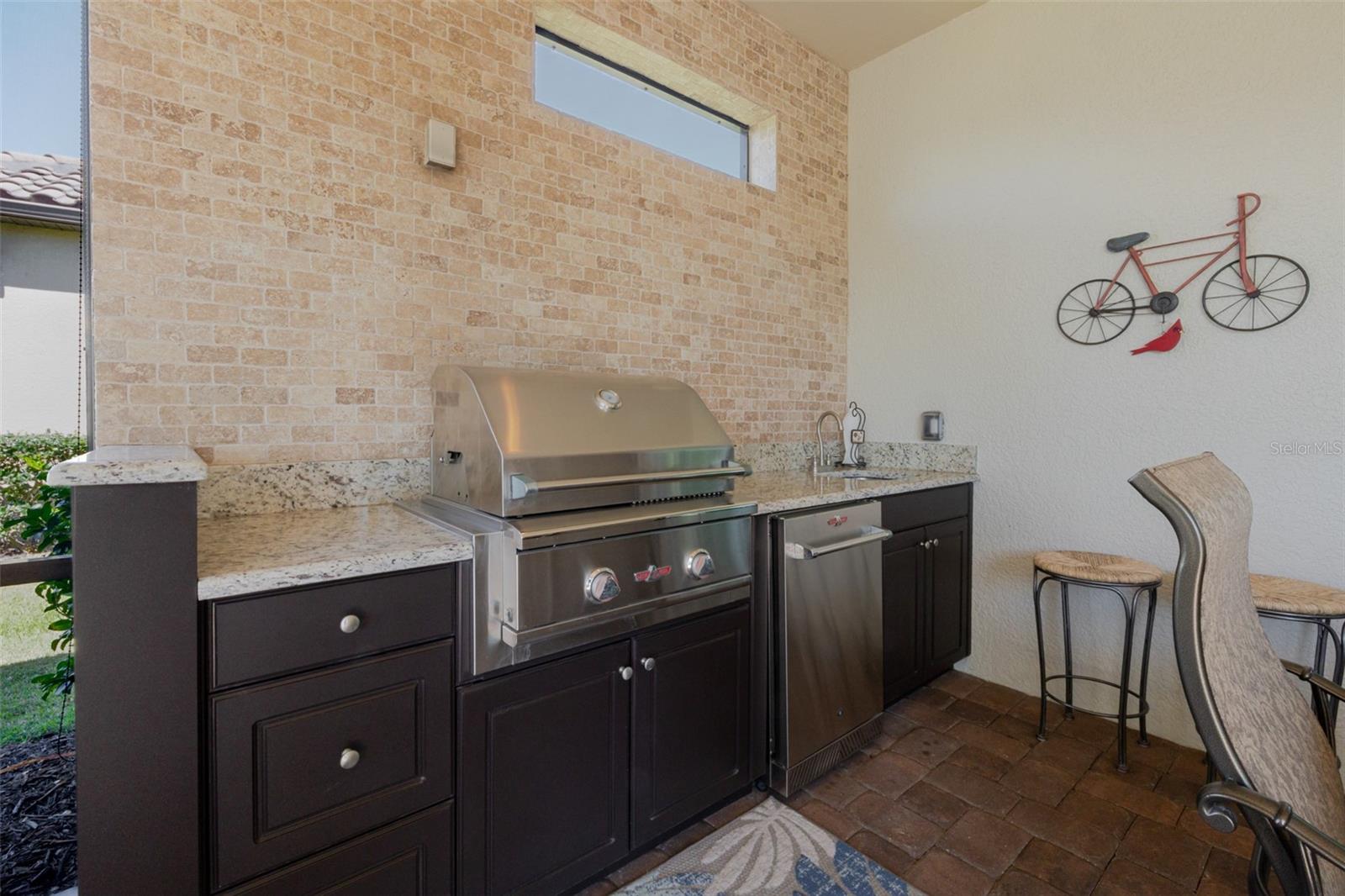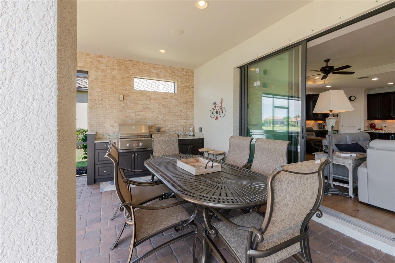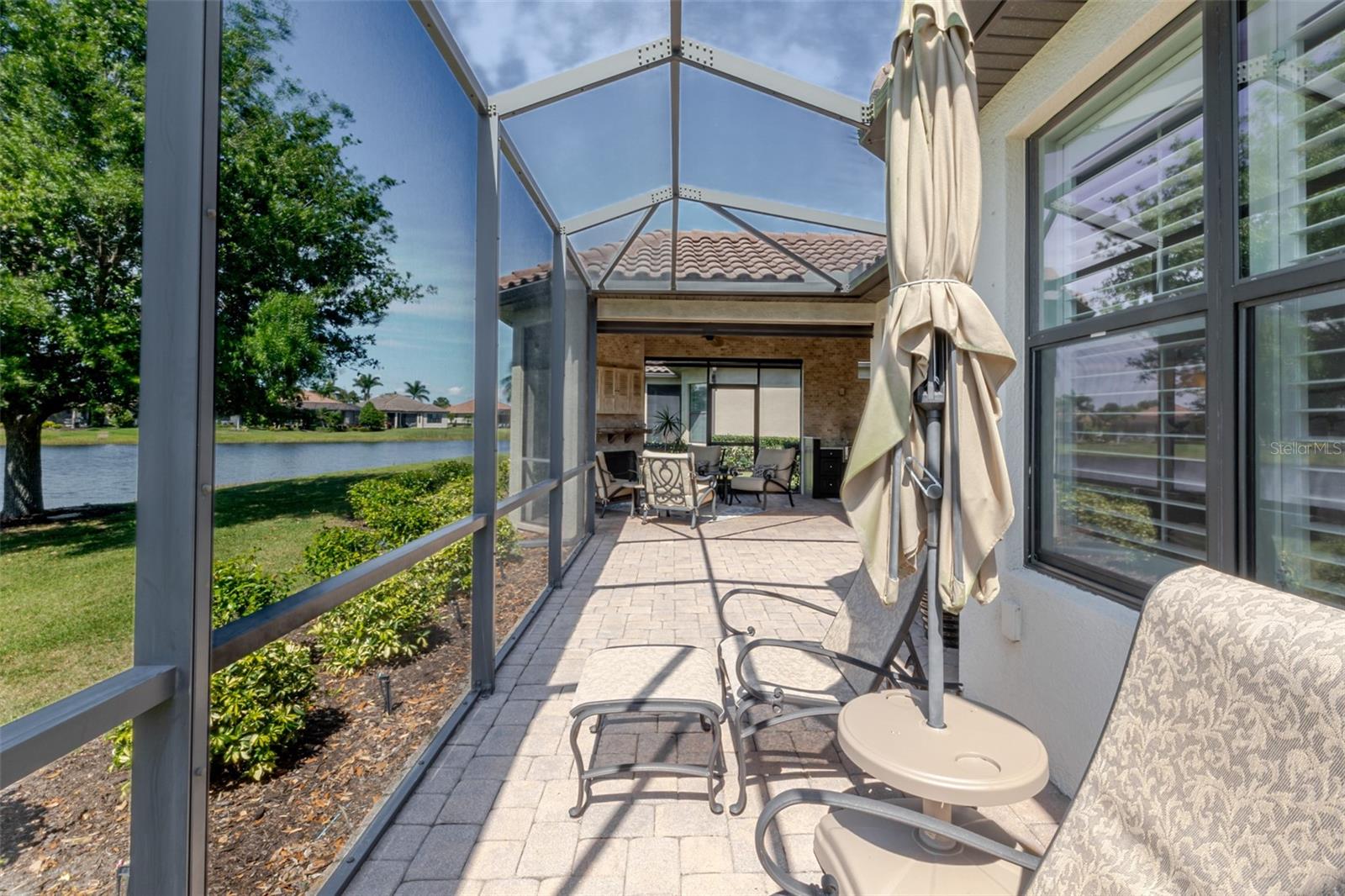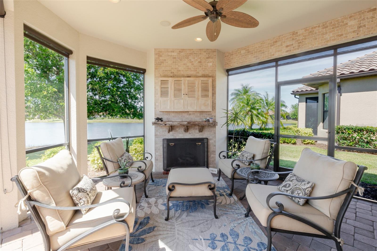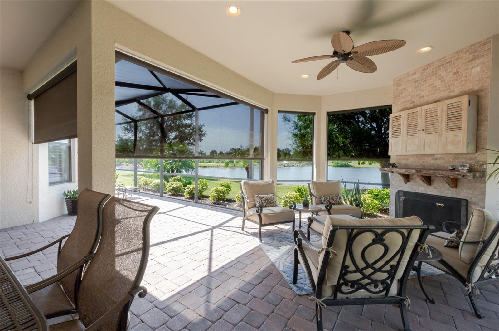 Florida outdoor living at its finest: Step outside to your expanded screened paver patio with peaceful water views—complete with summer kitchen (2014), custom feature wall (2015), and cozy outdoor fireplace for those perfect Florida evenings. Morning coffee by the water, sunset dinners under the stars, or simply unwinding by the fire—this is the lifestyle you've been dreaming about.