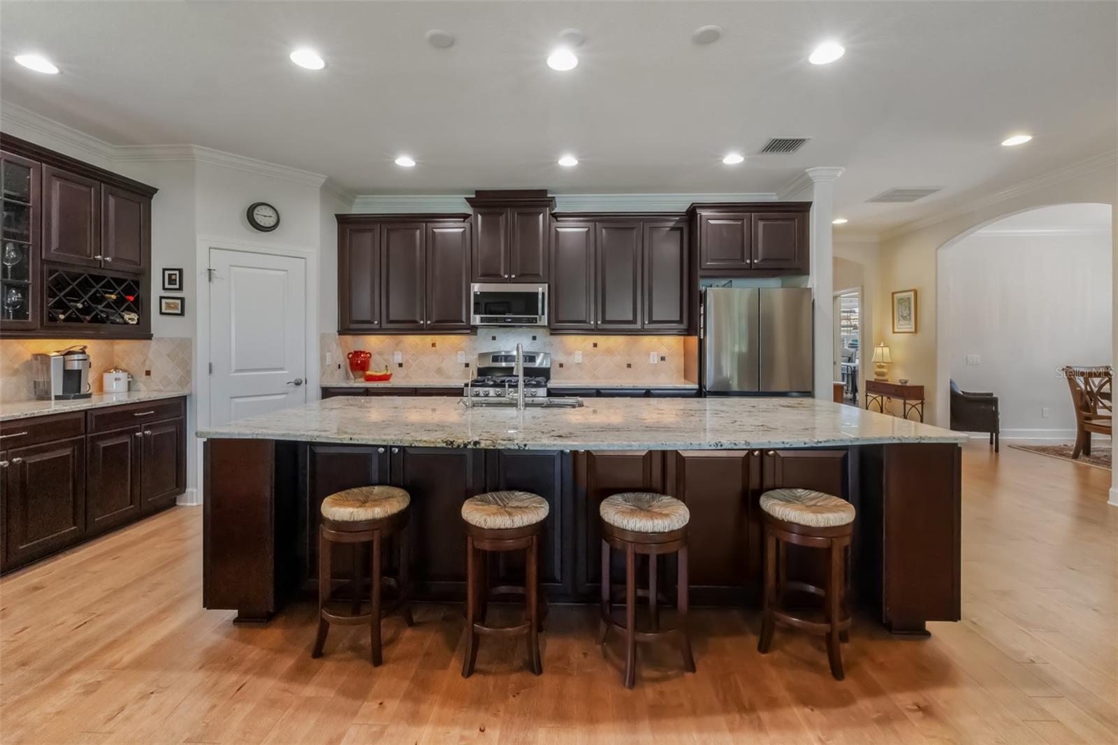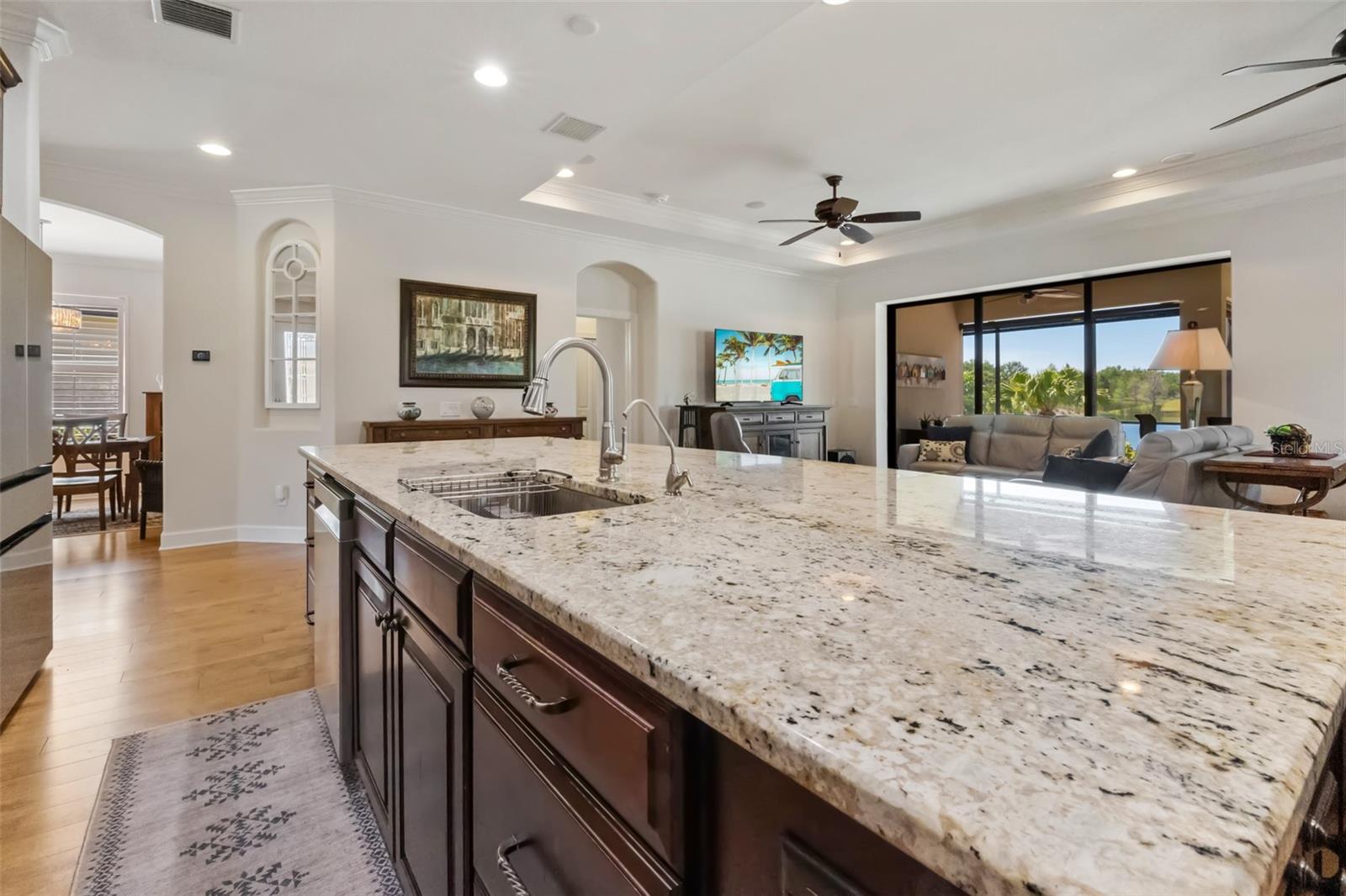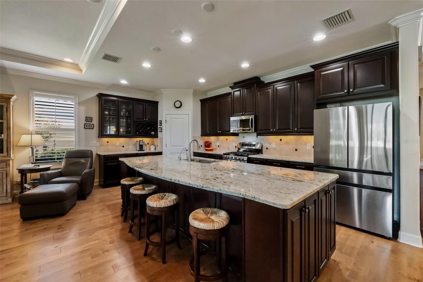 The open-concept kitchen is a chef's dream—granite countertops, expansive island, upgraded cabinetry, under-cabinet lighting, and brand-new appliances including refrigerator (2023), microwave, dishwasher, and disposal (2024). Whether you're hosting friends or enjoying quiet mornings, this space works beautifully for everyday living and entertaining alike.