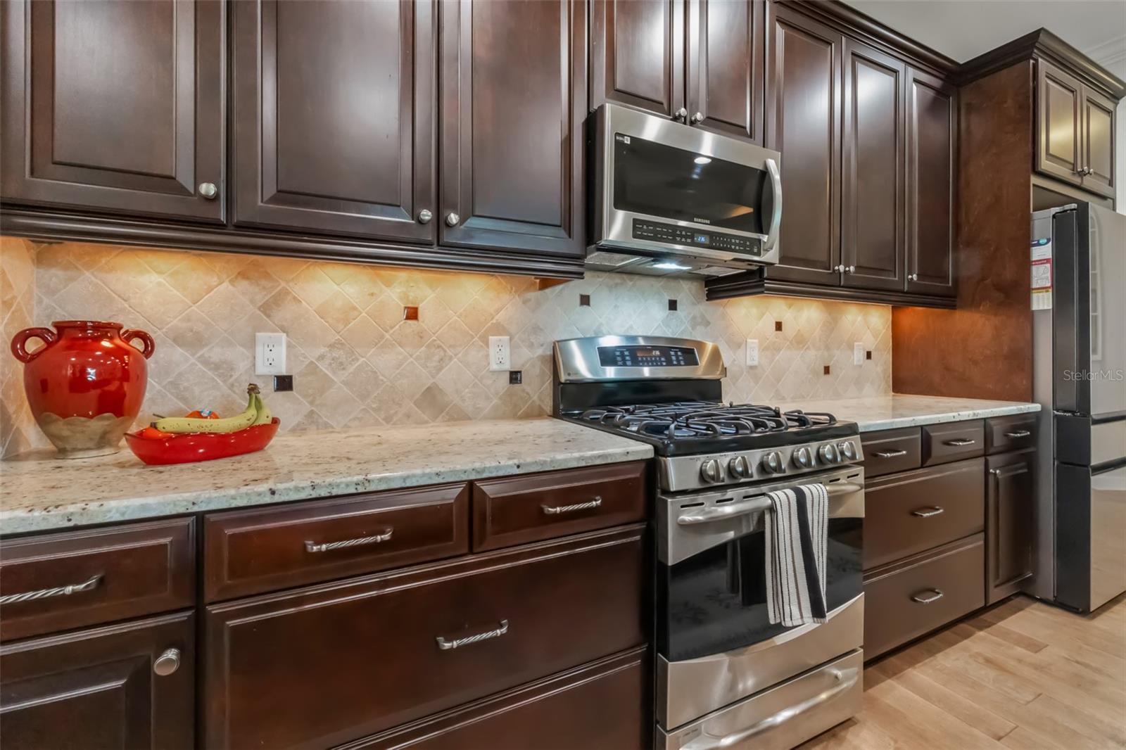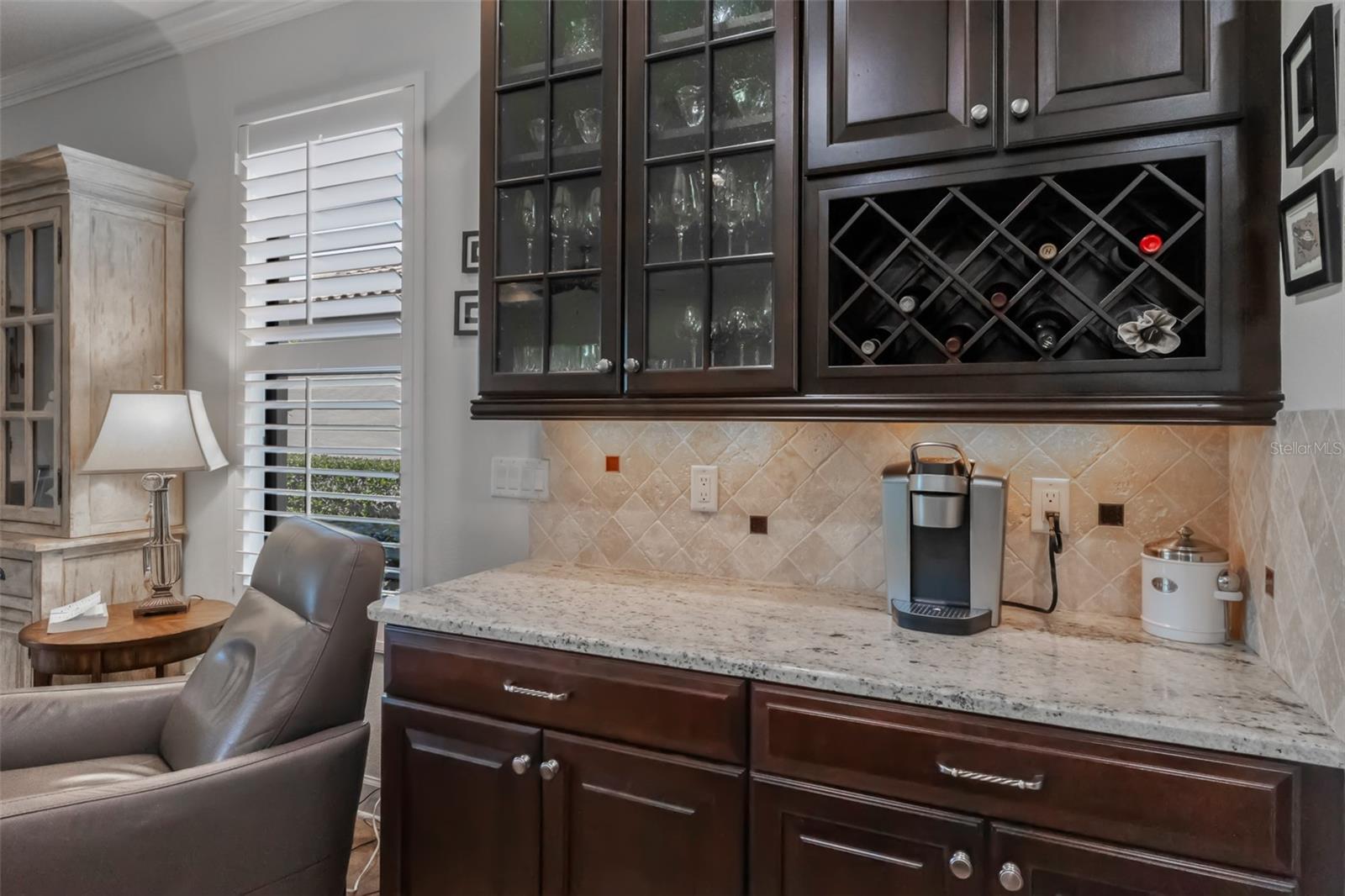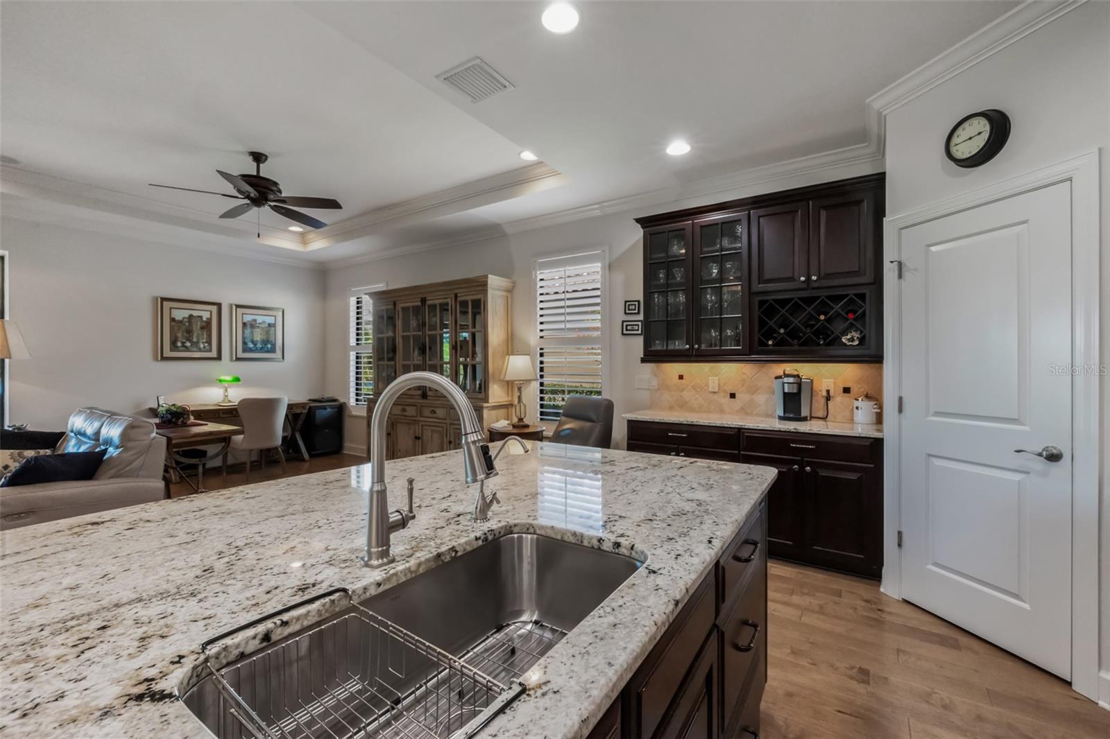 The open-concept kitchen is a chef's dream—granite countertops, expansive island, upgraded cabinetry, under-cabinet lighting, and brand-new appliances including refrigerator (2023), microwave, dishwasher, and disposal (2024). Whether you're hosting friends or enjoying quiet mornings, this space works beautifully for everyday living and entertaining alike.
