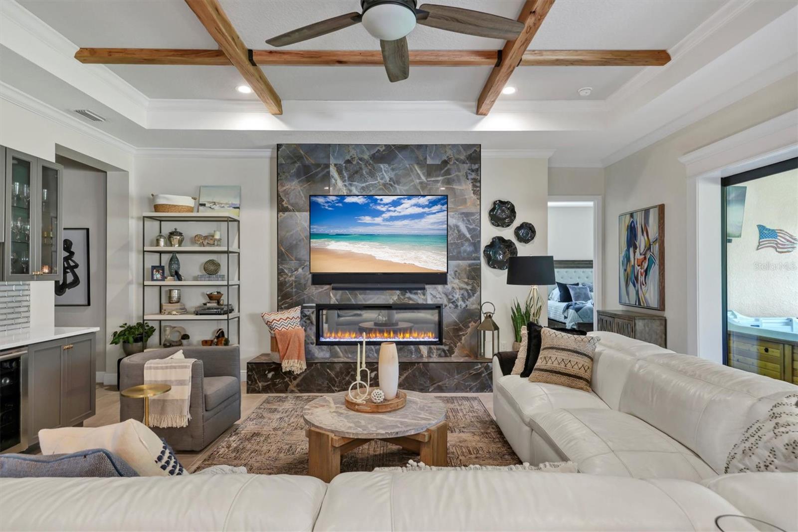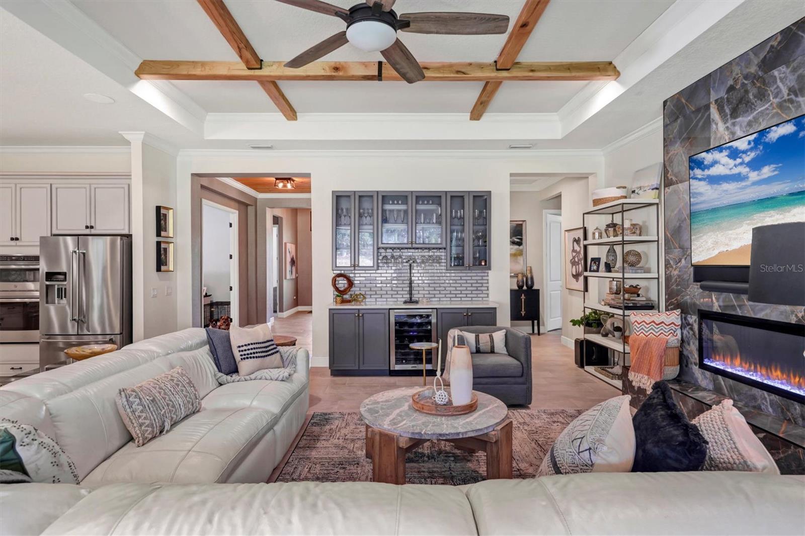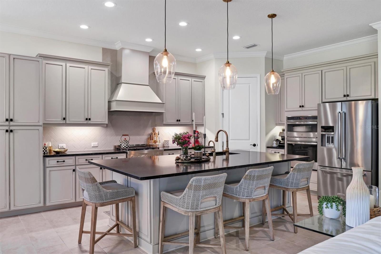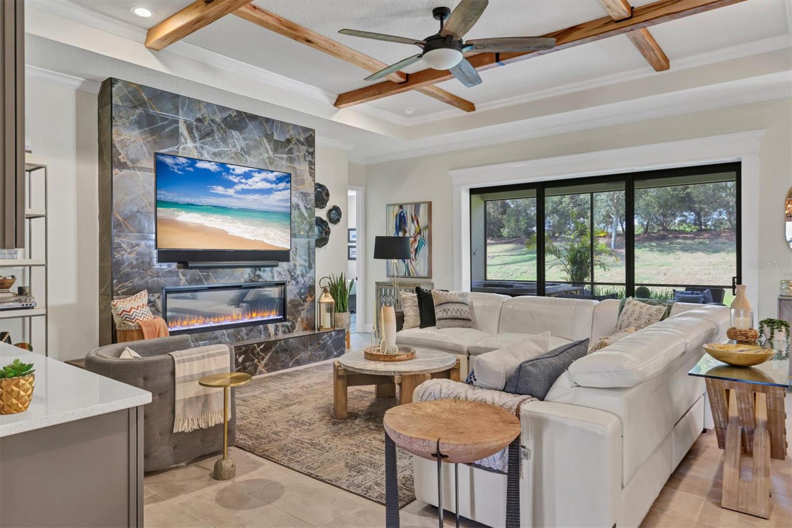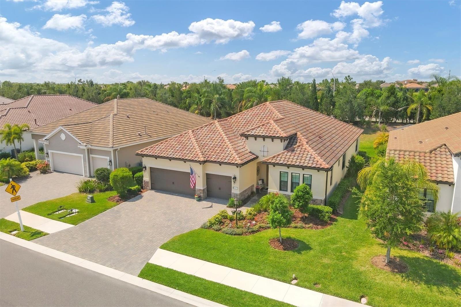 MODEL QUALITY 4 BED + DEN / 3 BATH / 3 CAR GARAGE 2,758 SQFT HOME BUILT in 2020 BY NEAL in the highly desirable INDIGO NEIGHBORHOOD OF LAKEWOOD RANCH. * MOVE-IN READY AND IMMACULATELY CLEAN * Too many upgrades and designer details to mention but here's a few * ALL-IMPACT WINDOWS AND DOORS * 8’ DOORS THROUGHOUT * CROWN MOLDING * WHOLE HOUSE SURGE PROTECTOR * PLANTATION SHUTTERS. The first thing you notice as you enter the home is the unique foyer which includes TONGUE AND GROOVE CIELINGS and an eye-catching mirrored accent wall. Straight ahead, you enter the expansive OPEN CONCEPT 21’ x 20’ great room-kitchen-dining combo space that makes this home PERFECT FOR ENTERTAINING. A custom-built STONE FEATURE WALL with ELECTRIC FIREPLACE gives texture and ambiance to the space. The COFFERED CEILINGS AND EXPOSED WOOD BEAM ACCENTS give the home warmth and character. A DRY BAR with extra storage and a WINE FRIDGE makes life easier. 14’ TRIPLE GLASS SLIDERS open from the great room to a large 21’ x 12’ COVERED LANAI WITH PAVERS that seamlessly connect the outdoor space with the indoors and offers peaceful and serene views of the PRIVATE BACK YARD GREENSPACE. Back inside, the kitchen has an UPGRADED KITCHENAID COMMERCIAL GAS RANGE and WALL OVEN AND MICROWAVE. The stainless steel refrigerator and dishwasher are also newly upgraded KitchenAid appliances. The LARGE CENTER ISLAND boasts a unique MATTE FINISH HONED GRANITE that is sure to impress family and friends. The spacious primary bedroom is a true retreat offering two spacious walk-in customized closets. The primary bathroom includes a large walk-in shower with a pebble floor, plus dual vanities. BEDROOM 2 IS AN ENSUITE which is located at the front of the home near the 14’ x 12’ DEN/OFFICE with FRENCH DOOR and ENGINEERED HARDWOOD FLOORS. The SPLIT BEDROOM FLOORPLAN place bedrooms 3 and 4 in a separate wing of the home where they share a bath. You will LOVE the oversized 14’ x 8’ laundry room with folding counter and upper cabinetry. INDIGO IS A WARM AND FRIENDLY GATED MAINTENANCE FREE COMMUNITY with LOW HOA FEES THAT INCLUDE YOUR YARD CARE, a GRAND CLUBHOUSE where residents gather for planned events and an active social calendar, RESORT-STYLE POOL WITH CABANAS, FITNESS CENTER, YOGA STUDIO, 4 PICKLE BALL COURTS, AND 2 BOCCE BALL COURTS. Indigo is close to Downtown Sarasota, Gulf Beaches, Lakewood Ranch Mainstreet, Waterside Place, UTC Shopping and Entertainment District, A RATED SCHOOLS, Publix, and so much more! This home is an ABSOLUTE MUST SEE!