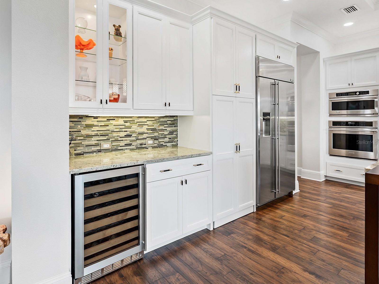 Amazing lake views in The Lake Club! Located in the original phase of The Lake Club, this lakeside custom Bermuda residence by Arthur Rutenberg is your cozy and luxurious private oasis. Spanning almost 3,500 square feet, this functional floor plan offers a modern open flow plus a massive study with high ceilings, extended bonus room, and 4-car attached garage. From the moment you arrive home, you will appreciate how this residence expertly balances timeless elegance with unique elements you won’t find at other properties. The mediterranean exterior shines between towering palm trees and elegant wing walls from the long driveway to your split 4-car garage bays, both with their own private attached entrances to the interior. Through double wood front doors, the foyer offers a stately entrance with custom tile inlay design in the wood floors, designer wallpaper feature wall, and instant views of the lake over the southwestern rear exposure. The central great room is a bright place to gather with tall tray ceiling, large impact sliding glass doors, and custom feature wall. The chef’s kitchen delights with a completely custom island taking center stage featuring plentiful storage, granite counters, and a custom wood bar for guests to watch the chef in action. Enjoy wood cabinetry with 2025 fresh super white paint, cleverly hidden walk-in pantry with shelving, and a dream stainless steel appliance suite with Wolf gas cooktop and griddle, built-in wall oven and microwave, dishwasher, refrigerator, and wine fridge. The adjacent dining room allows for seamless indoor and outdoor entertaining with disappearing corner impact sliding glass doors to the lanai. The paver lanai surrounded by a classic colonnade screen enclosure is perfectly situated lakeside for the most incredible sunset views every evening. Plus, covered entertaining areas with wood ceilings, retractable shade awning and additional rolldown shade screen, custom outdoor kitchen with grill, built-in firepit, and heated saltwater pool with large sunshelf. Inside are the perfect places to work and play, with an oversized den that has space for two separate work areas and designer chandeliers, and a spacious bonus room with custom wet bar and impact sliding glass doors to the lanai. The primary suite is a comforting place for respite with large windows overlooking the lake, and dual walk-in closets. Have a spa-day everyday in the en-suite bathroom with dual vanities, makeup vanity, large soaking tub, and walk-in shower with multiple shower heads. Two guest bedrooms, both with walk-in closets, are ready for your guests, plus two full bathrooms, one of which is a great pool bathroom. There are no storage woes in this house with extra linen closets, large storage closet by the laundry, and an additional 13x13 storage space in the left garage that is perfect for a workbench or golf cart parking. Rounding out this impressive estate is a functional laundry room, and mudroom entry off the left garage. Recent upgrades in November and December 2025 include: fresh interior paint in the main living areas and bonus room, new tankless water heater, and new whole house water softener and filtration system. The Lake Club is an exclusive premier, gated community with a Grande Clubhouse, restaurant, pool, tennis, pickleball and more.
