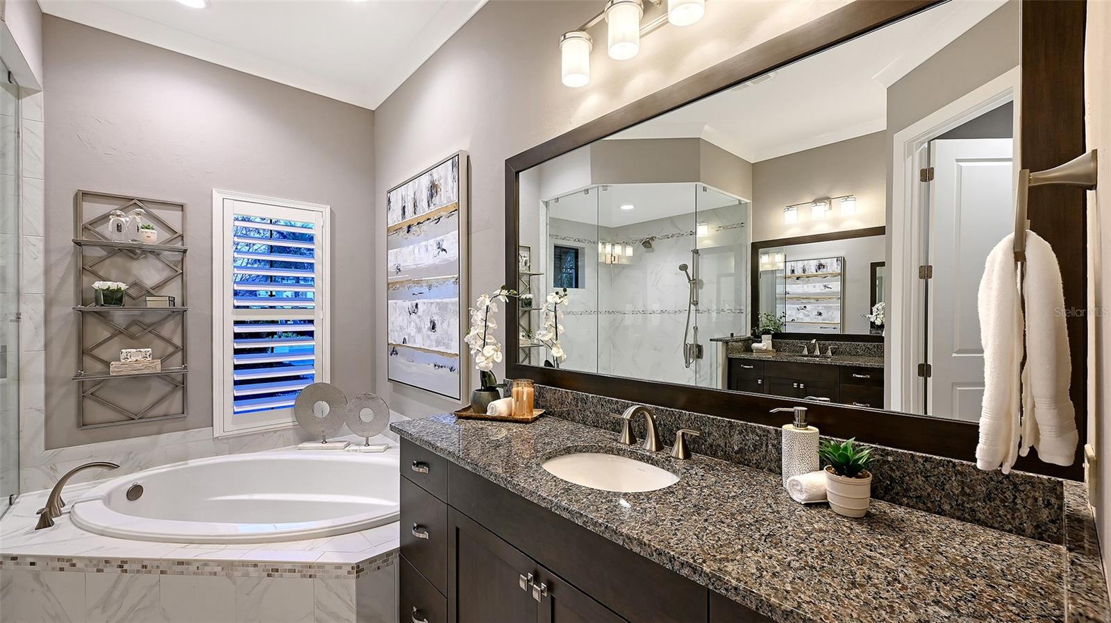 The primary suite is a true sanctuary, complete with two walk-in closets, private lanai access, and a spa-inspired bath featuring dual vanities, a soaking tub, and an expansive walk-in shower.
