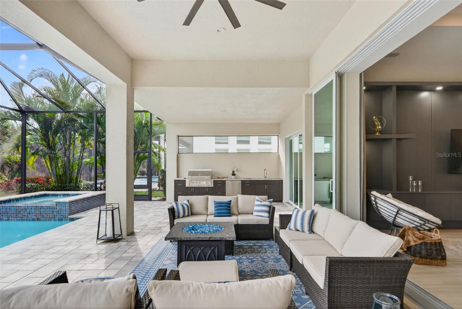 Beautifully appointed Aragon model, on a larger Estate lot, located within the sought-after Isles by Toll Brothers, this residence is perfectly positioned amid mature landscaping with tranquil sunrise and preserve views from the lanai. Offering three bedrooms, three-and-a-half baths, a den/study, and a formal dining room, the home is thoughtfully designed to balance refined sophistication with inviting comfort. A well-conceived floor plan provides exceptional privacy, with the primary suite intentionally separated from the additional en-suite bedrooms—ideal for both everyday living and hosting guests. Throughout the home, curated finishes elevate every space, including custom wall built-ins and expansive 10-foot pocket sliding glass doors that fully retract, seamlessly connecting the interior to the lanai. Additional upgrades include 13 ft ceilings, wood shutters, hurricane-impact glass, and meticulous attention to detail at every turn. The kitchen serves as a striking centerpiece, anchored by an expansive quartz island and complemented by decorative, soft-close cabinetry—beautifully suited for both entertaining and daily use. The primary suite is a true retreat, featuring dual walk-in closets, sliders to the lanai, and a generously scaled, spa-inspired en-suite bath. Each additional bedroom offers its own private en-suite bath, ensuring comfort and convenience for family and visitors alike. Seamlessly extending the living space outdoors, the expansive lanai is outfitted with a thoughtfully designed outdoor kitchen complete with a beverage station and grill. As evening falls, unwind in the spa and take in the peaceful sounds of nature from the preserve—creating a serene backdrop for both relaxation and entertaining. Luxurious living in the gated, maintenance-free community of The Isles, nestled between The Lake Club and Concession, at its best! The Isles at Lakewood Ranch offers many amenities such as a 65,000 square foot clubhouse, tennis and pickleball courts, basketball court, playground, state of the art fitness center and yoga room, resort-style swimming pool and spa, boardwalk and fishing pier, and a playground and dog park. Centrally located, just off I-75 and a short drive to the award-winning beaches of Siesta Key, Lido, & Anna Maria. This move-in ready home has all the amenities that one would want in this 2025 Best-Selling Multigenerational Planned Community in the Nation.