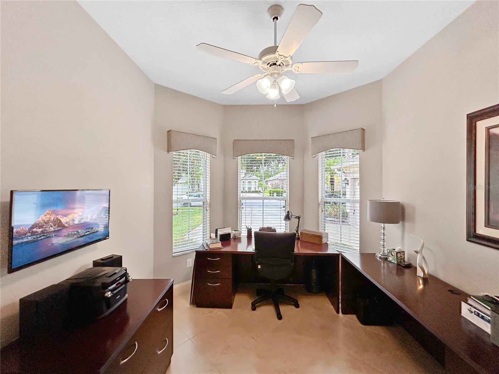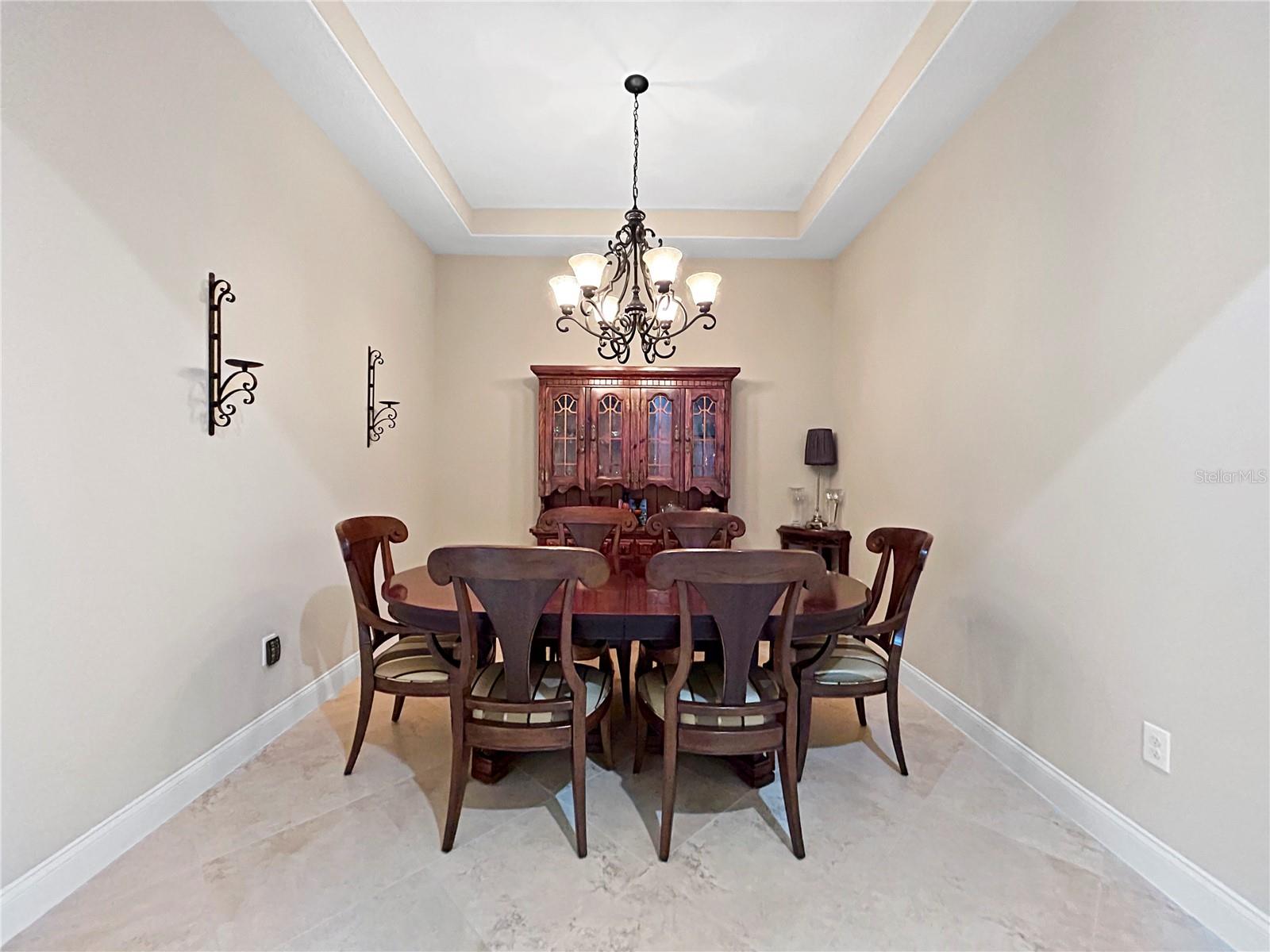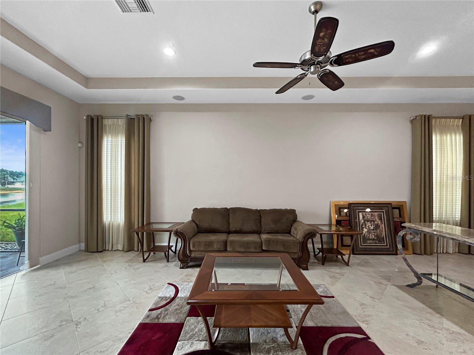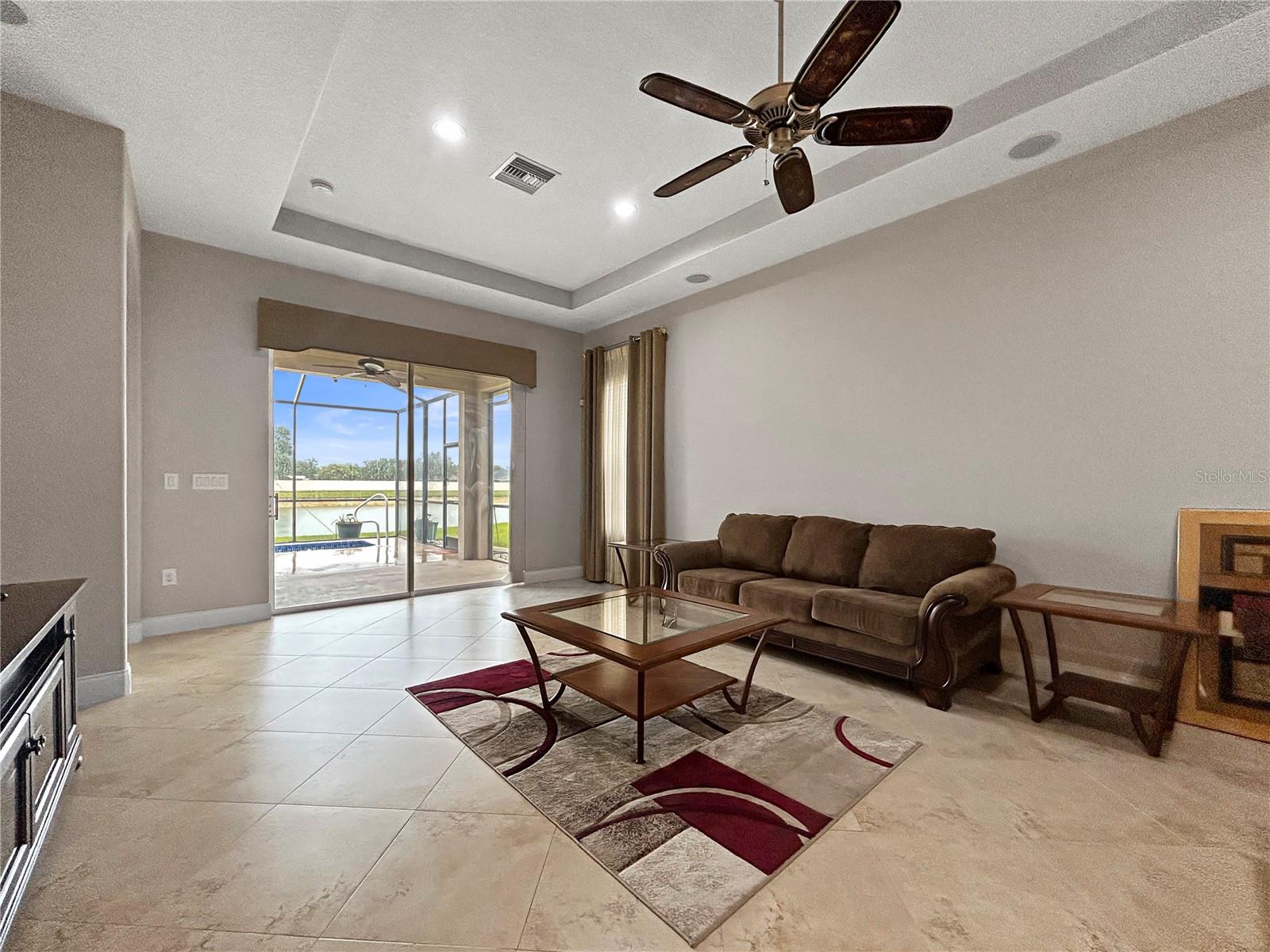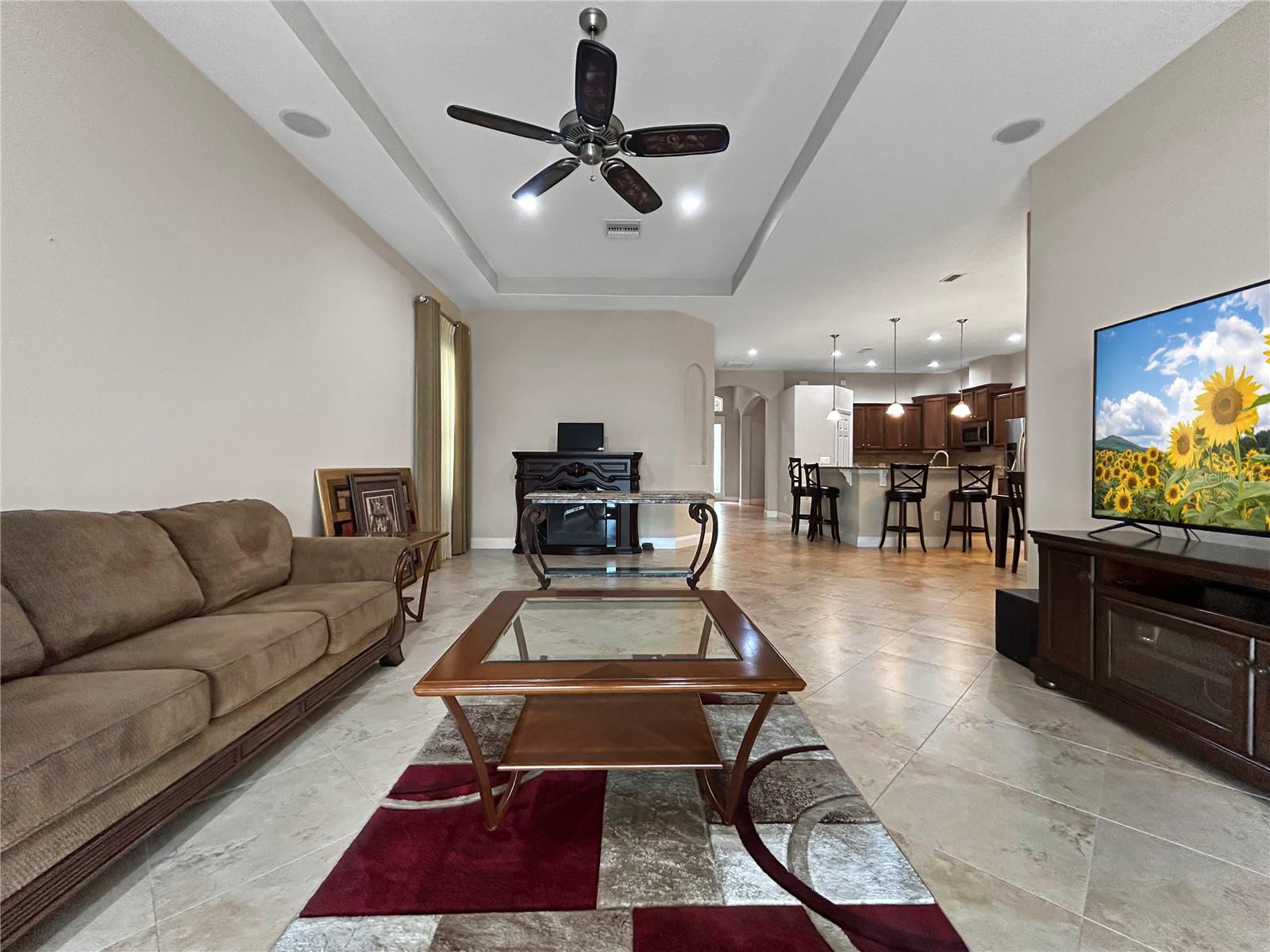 Step inside to find earth-toned ceramic tile flooring throughout, paired with architectural details like arched entryways and coffered ceilings that add a touch of sophistication. The spacious formal dining room and oversized living room create an ideal space for entertaining, with sliding glass doors that open to a covered and screened-in deck—your private retreat overlooking a serene pond and featuring an in-ground, Jacuzzi spa.