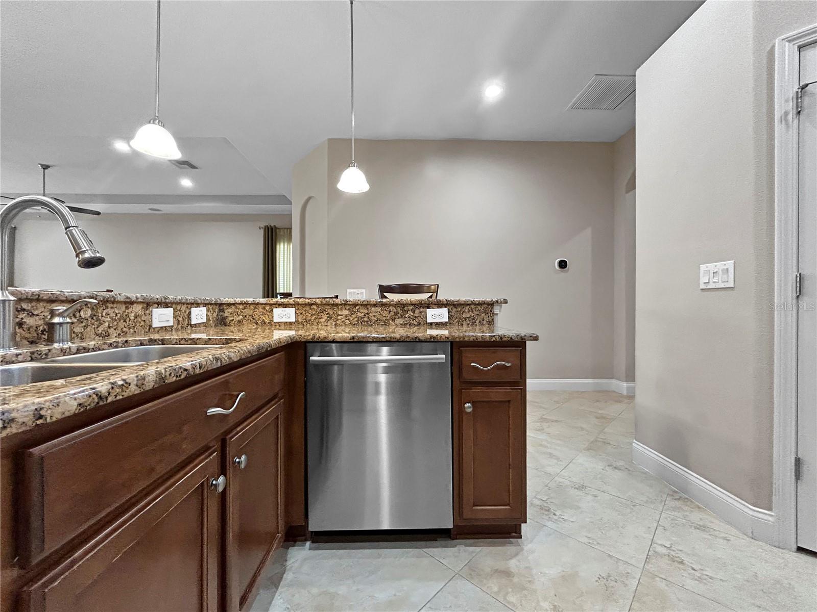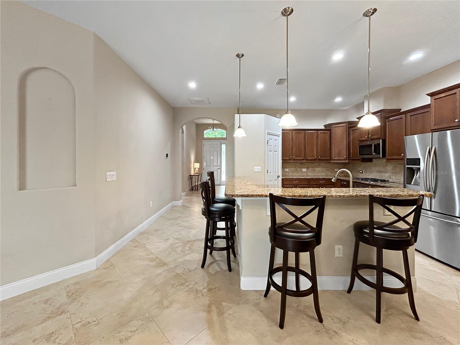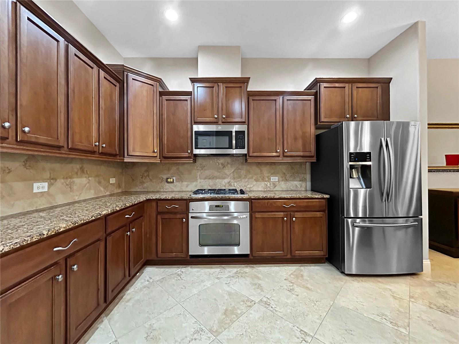 The chef’s kitchen is a showstopper, featuring granite countertops, an island with seating, beautiful backsplash, ample cabinetry, a large pantry, and stainless steel appliances, including a gas cooktop—perfect for culinary enthusiasts.
