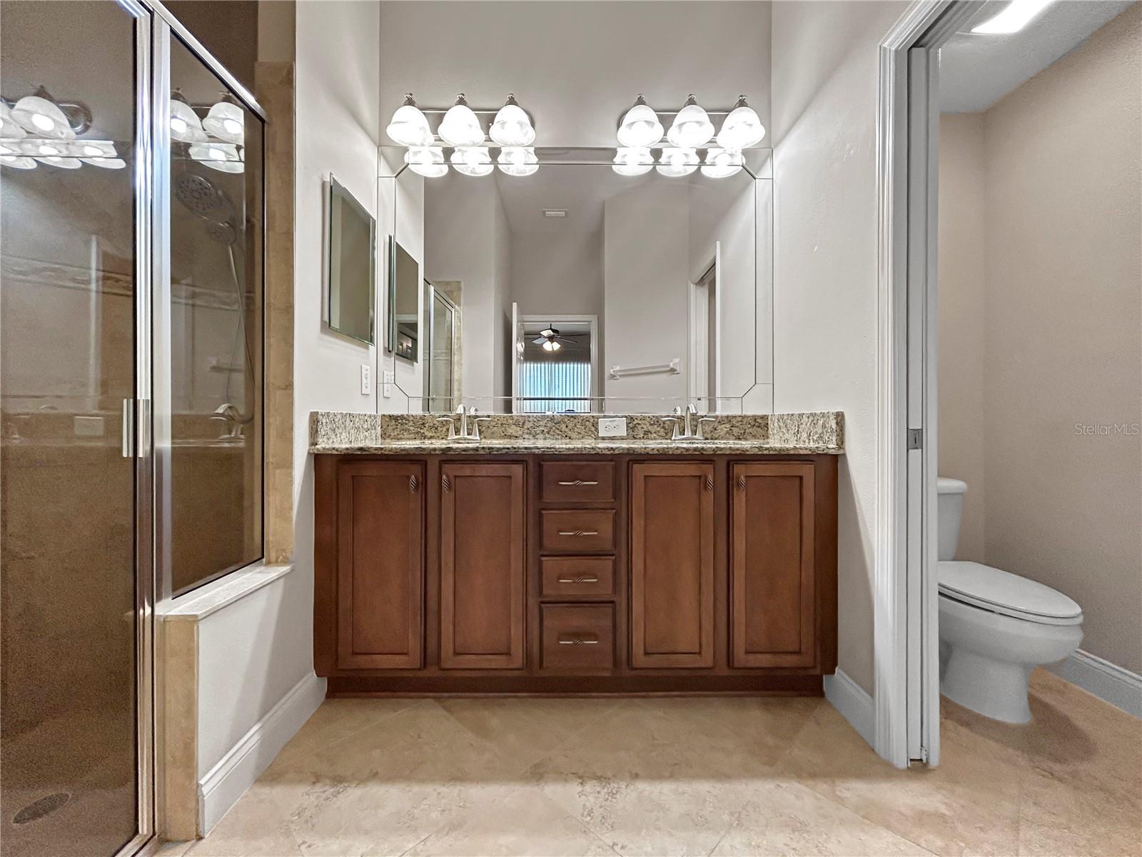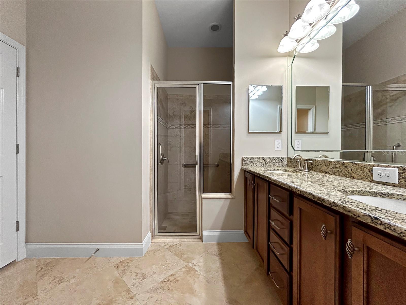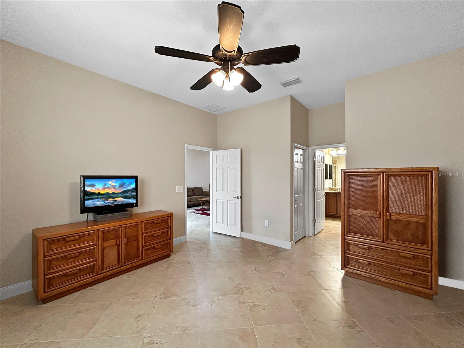 The primary suite is a true sanctuary with its own en suite bath, offering dual vanities, a walk-in shower, and two spacious walk-in closets. All bedrooms are generously sized, complete with large closets and ceiling fans.