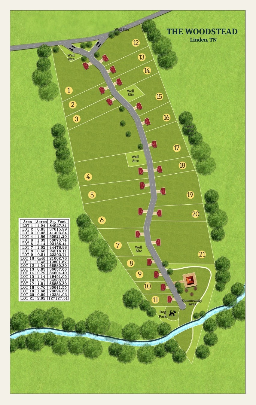 Welcome to The Woodstead: A Gated Country Retreat Like No Other. Only 21 Homes Available. THIS IS LOT #3. Financing Available - See Below. Nestled on 33.8 acres of rolling woods just minutes from charming Linden, TN, located in what is known as "Nashville Big Backyard". The Woodstead offers a rare opportunity to be part of a one-of-a-kind gated community built for peace, freedom, and connection to nature. With only 21 exclusive lots available, on .5 - 2.5 acres, this is your chance to own land in a thoughtfully planned community where you can build your dream barndominium. Choose from a curated selection of home models from one of Middle TN’s best barndominium builders. Price includes the land with all utilities in place PLUS your barndominium home. Each homesite is surrounded by woods and plenty of space for your micro-homestead. The community areas are designed for gathering, gardening and enjoying the outdoors. A quiet creek borders the property, and you’re just a short drive to the Buffalo River for kayaking, swimming, and fishing. All this, just 5 minutes from downtown Linden for everyday essentials, 60 minutes from Columbia, and 90 minutes from from Nashville. This is more than a place to live — it’s a lifestyle of simplicity, self-reliance, and community. NO HOA: Only a private POA where residents have autonomy over community decisions. Don’t miss your chance to claim your place in this beautiful community. FINANCING AVAILABLE: One-time closing construction loan. Combines the land purchase with the construction of the home. FHA Loan - 3.5% down. Conventional Loan - 10% down. VA Loan - 0% down.