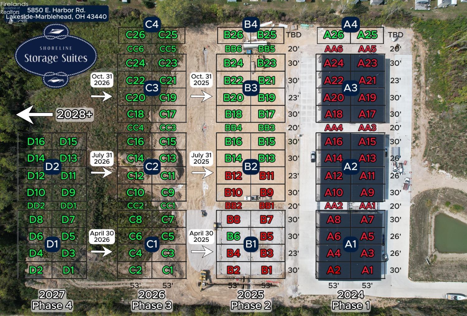 The best price per sq ft for any new construction in the area! Welcome to Shoreline Storage Suites, Ottawa County's newest gated luxury storage campus. Located on Vacationland's main corridor, this new and growing storage community is accessible from the traffic light at SR-163 and SR-269N for easy entry/exit and is central to many boat ramps and campgrounds. New cafe and yoga studio out front and the new Beach Glass Lounge is directly next door! Unit includes: 18' remote-controlled overhead door, 20+' ceilings, man door, ceiling fan, floor drain, R19 roof insulation, R13 wall insulation, interior metal walls, LED lighting, 100AMP service, wall outlets, gas heat, plumbing rough-ins, and prewired Spectrum wifi/cable. Fenced-in 20' x 53' outside spaces and optional lofts, bathrooms and other upgrades also available. Residential purposes prohibited. See map in photos showing available units.B16 (Dimensions: 30' x 53').