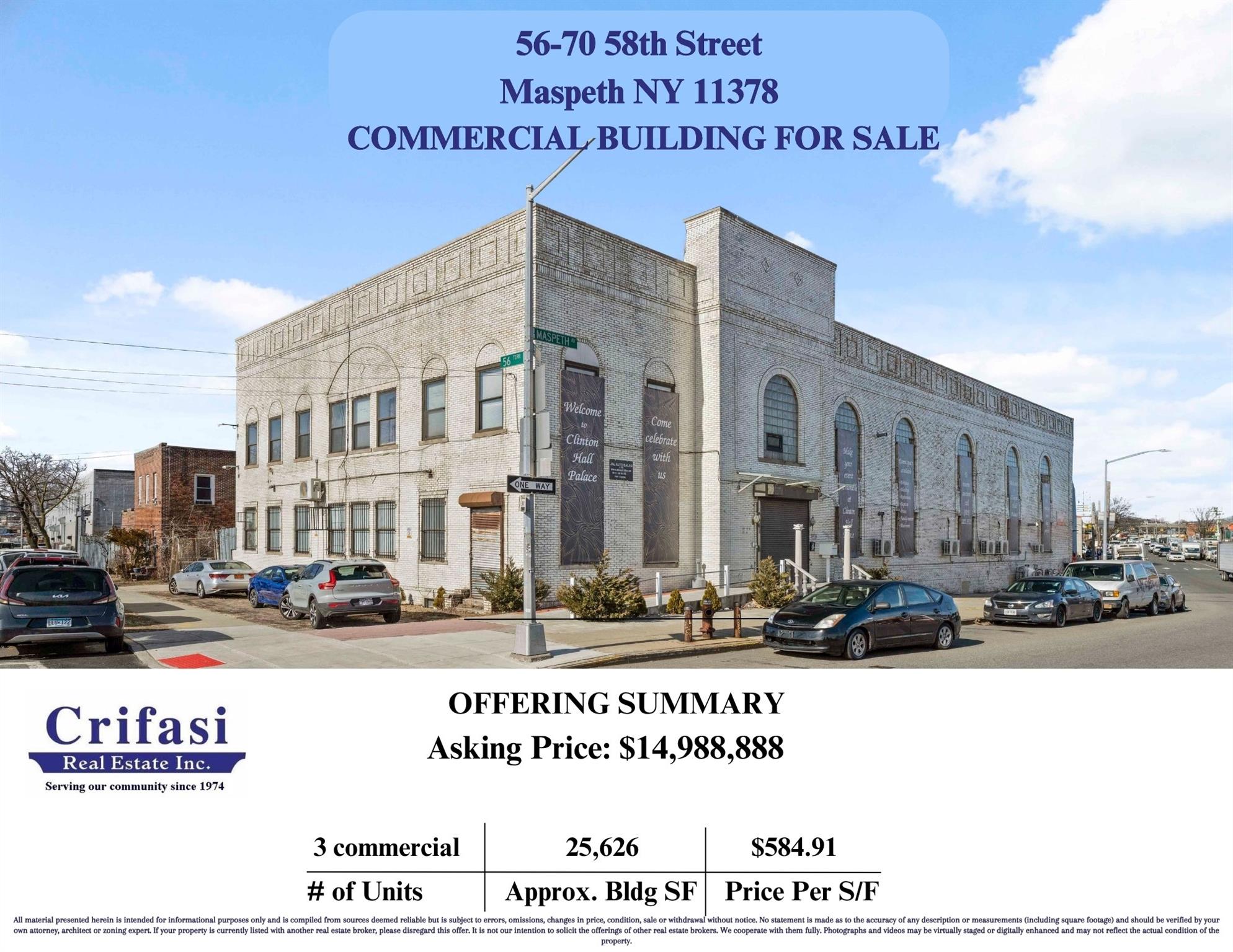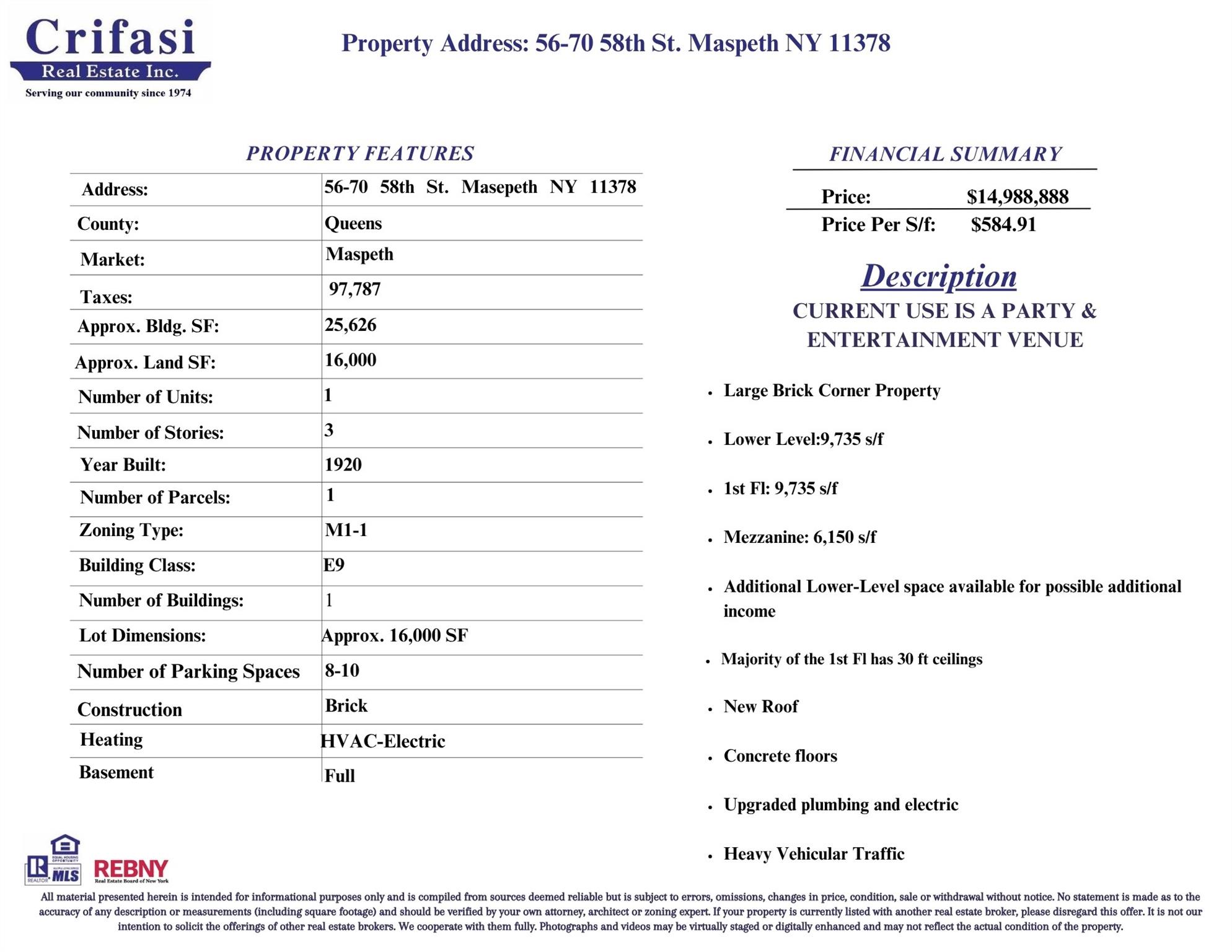 This expansive brick corner property offers approximately 25,626 square feet of versatile space situated on a 16,000-square-foot lot. Currently operating as a party and entertainment venue, the building features 9,735 square feet on both the lower level and first floor, along with an additional 6,150 square feet on the mezzanine. The first floor, mezzanine, and 2,000 square feet of the lower level will be delivered vacant, while the remainder of the lower level is occupied by two month-to-month tenants, providing income potential or optional vacancy for owner use. The majority of the first floor features soaring 30-foot ceilings and striking original Art Deco details. Ideal for continued use as an event space or conversion to a House of Worship, school, self-storage facility, warehouse, office, or research and development space. Recent upgrades include a new roof, concrete floors, and updated plumbing and electrical systems. Located in a high-traffic area with excellent visibility and accessibility, the property also offers off-street parking for approximately 8–10 vehicles, along with drive-in and loading dock access.