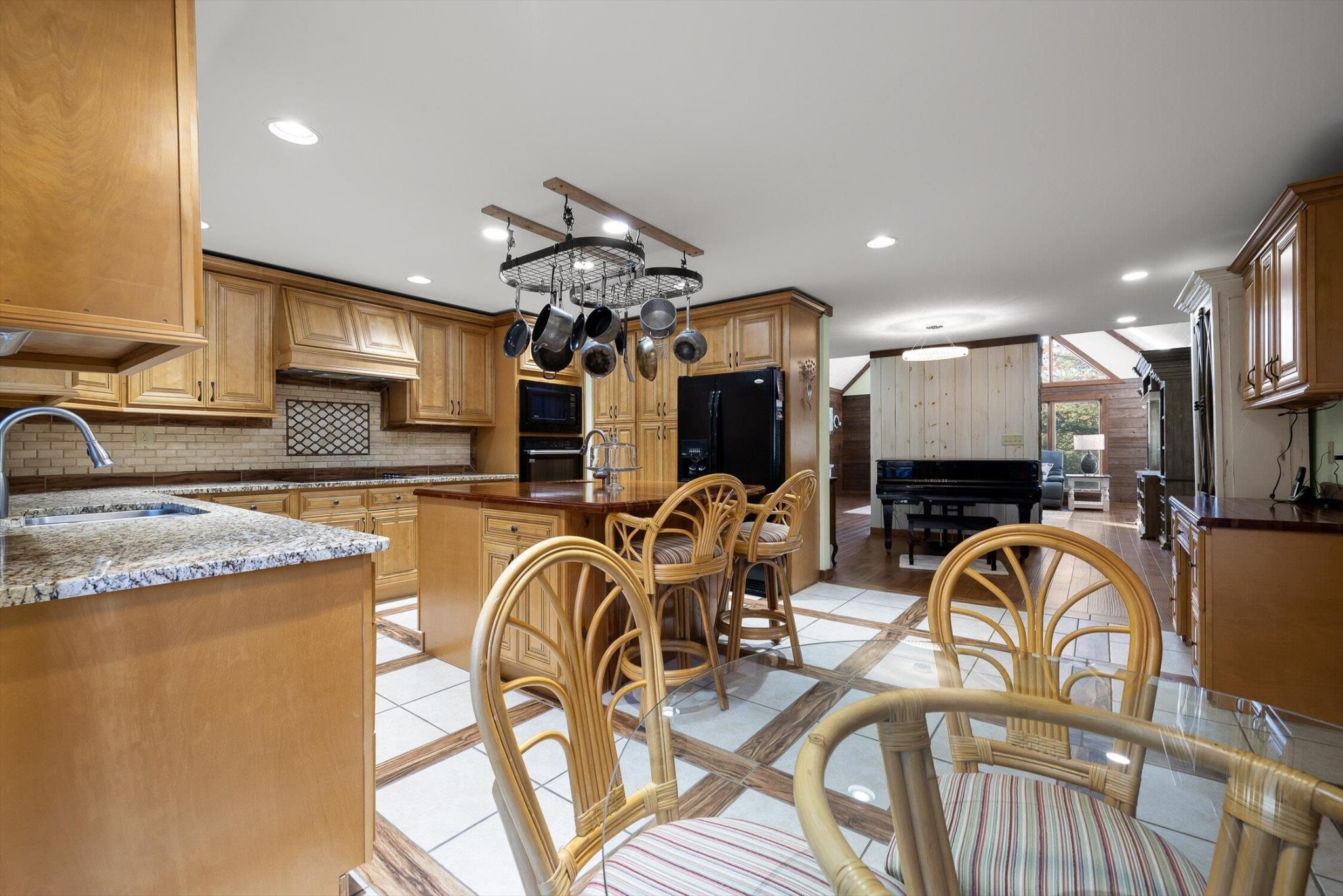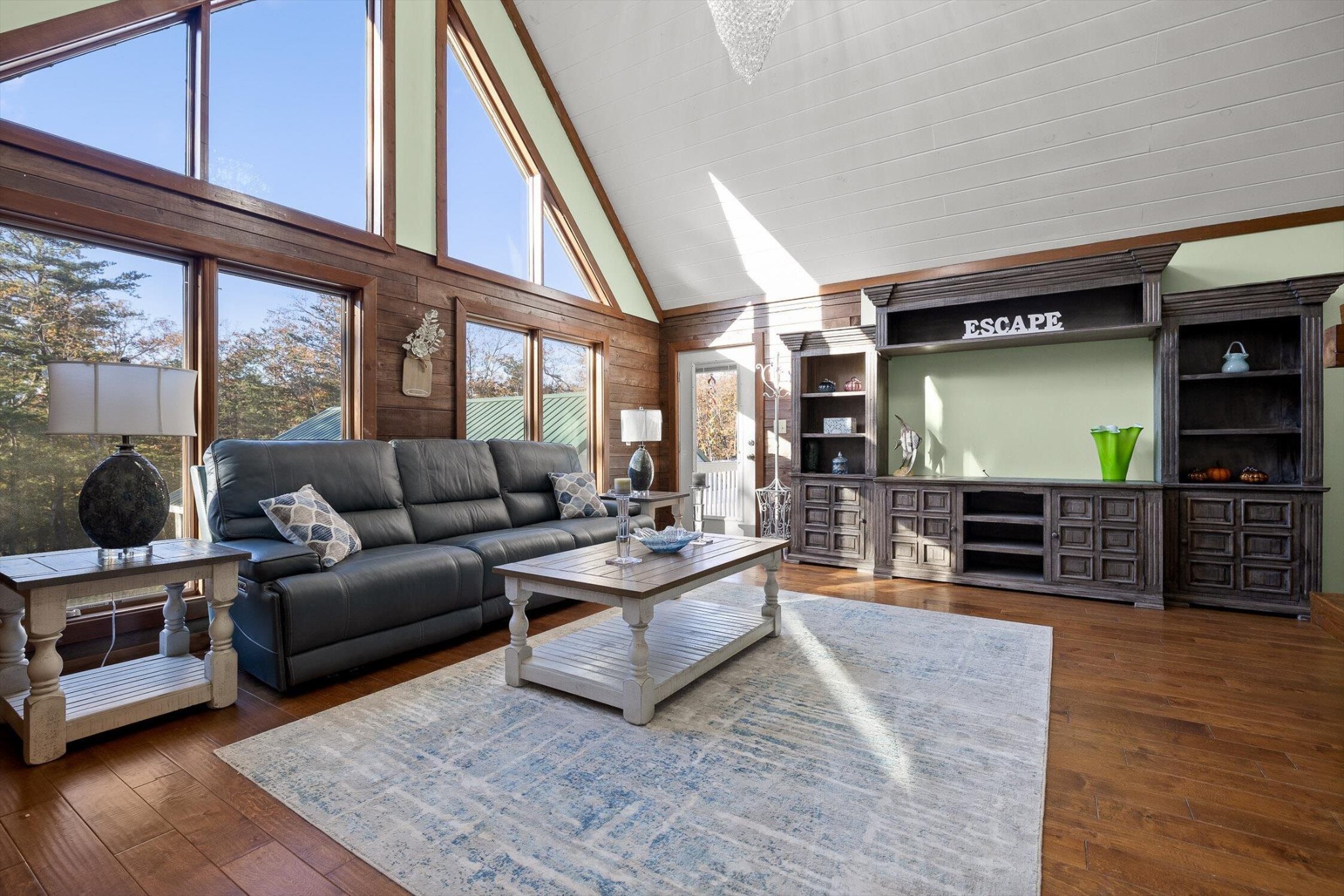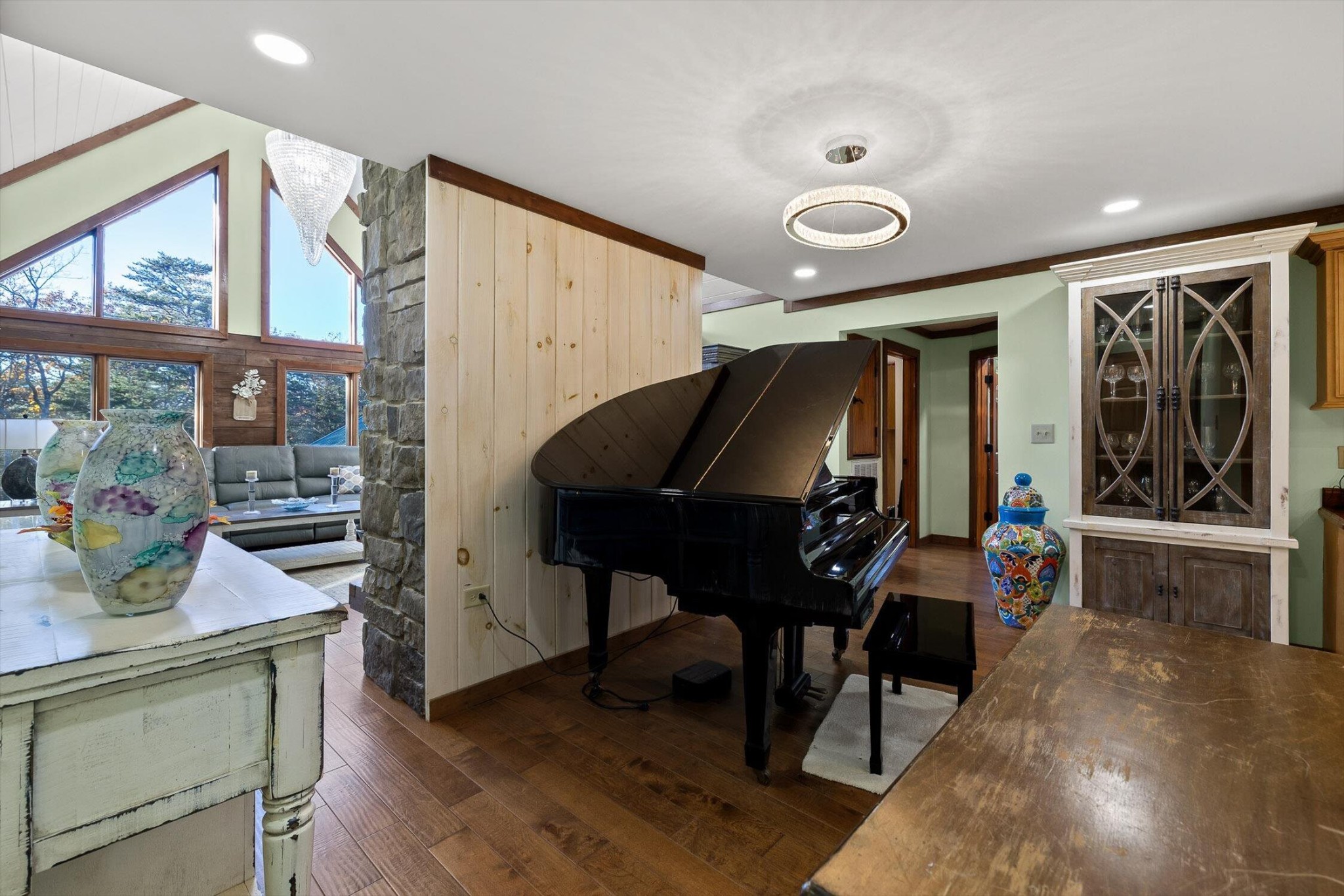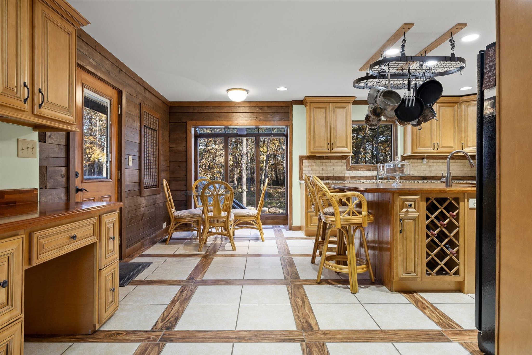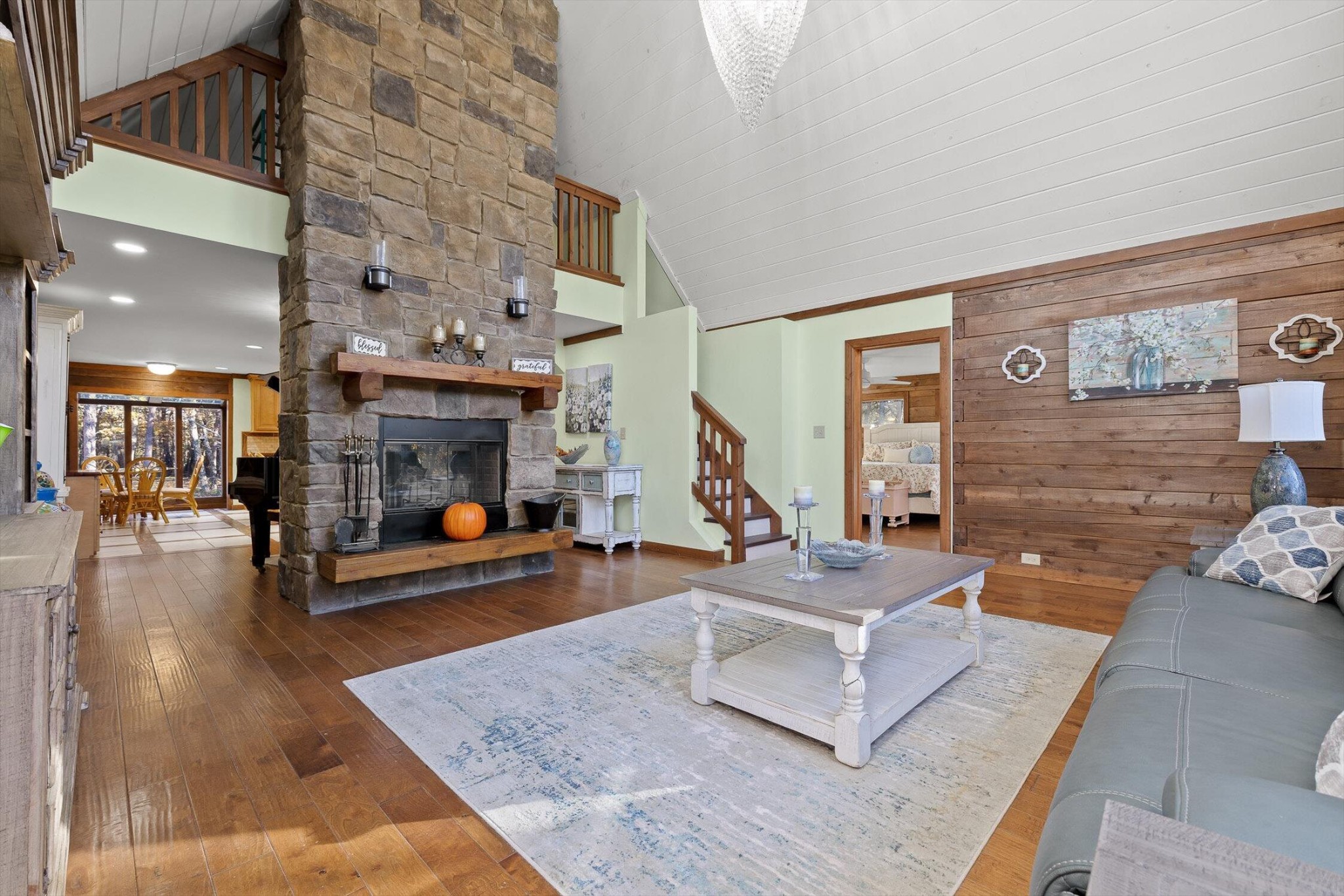 The main home features five bedrooms and four bathrooms, showcasing warm wood finishes, vaulted ceilings, and the timeless charm of exposed beams. With three full kitchens, the layout offers incredible flexibility for hosting, extended family, or rental opportunities.