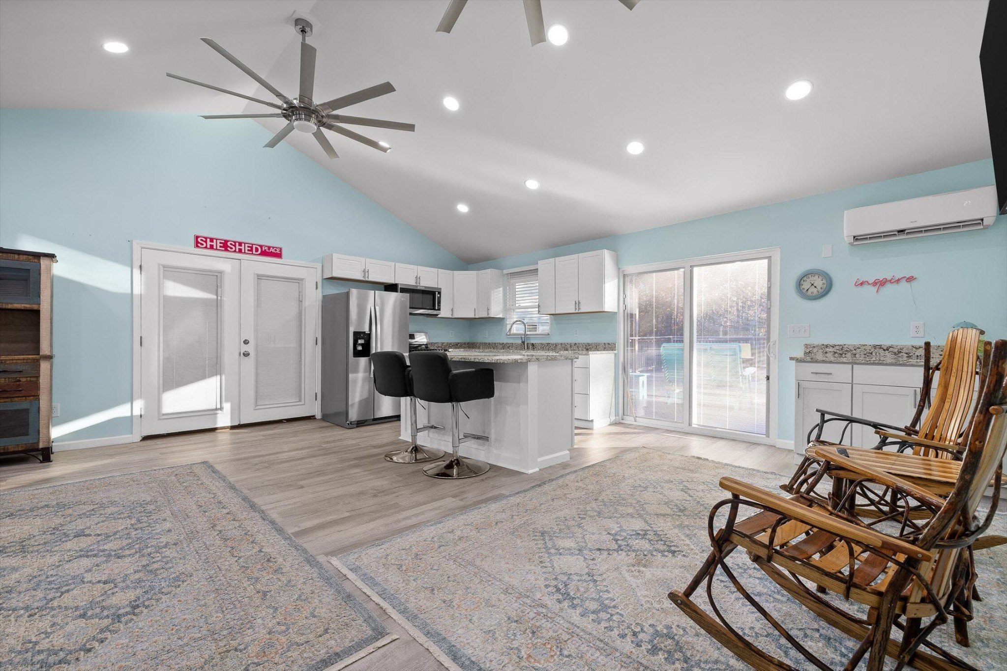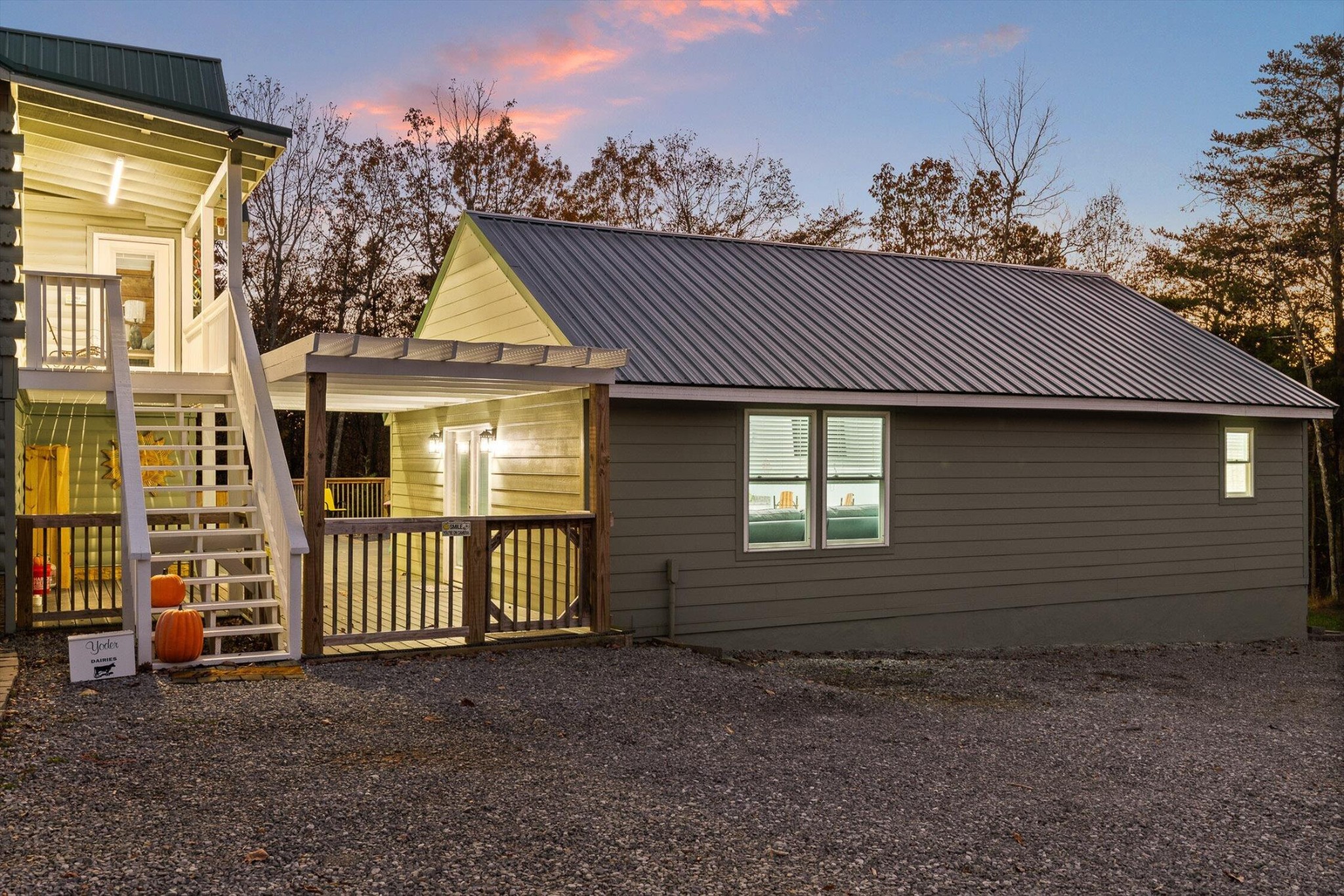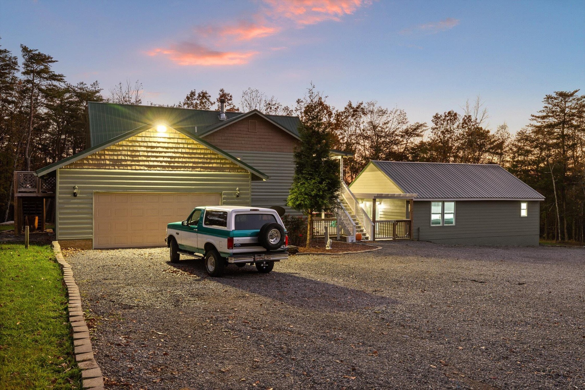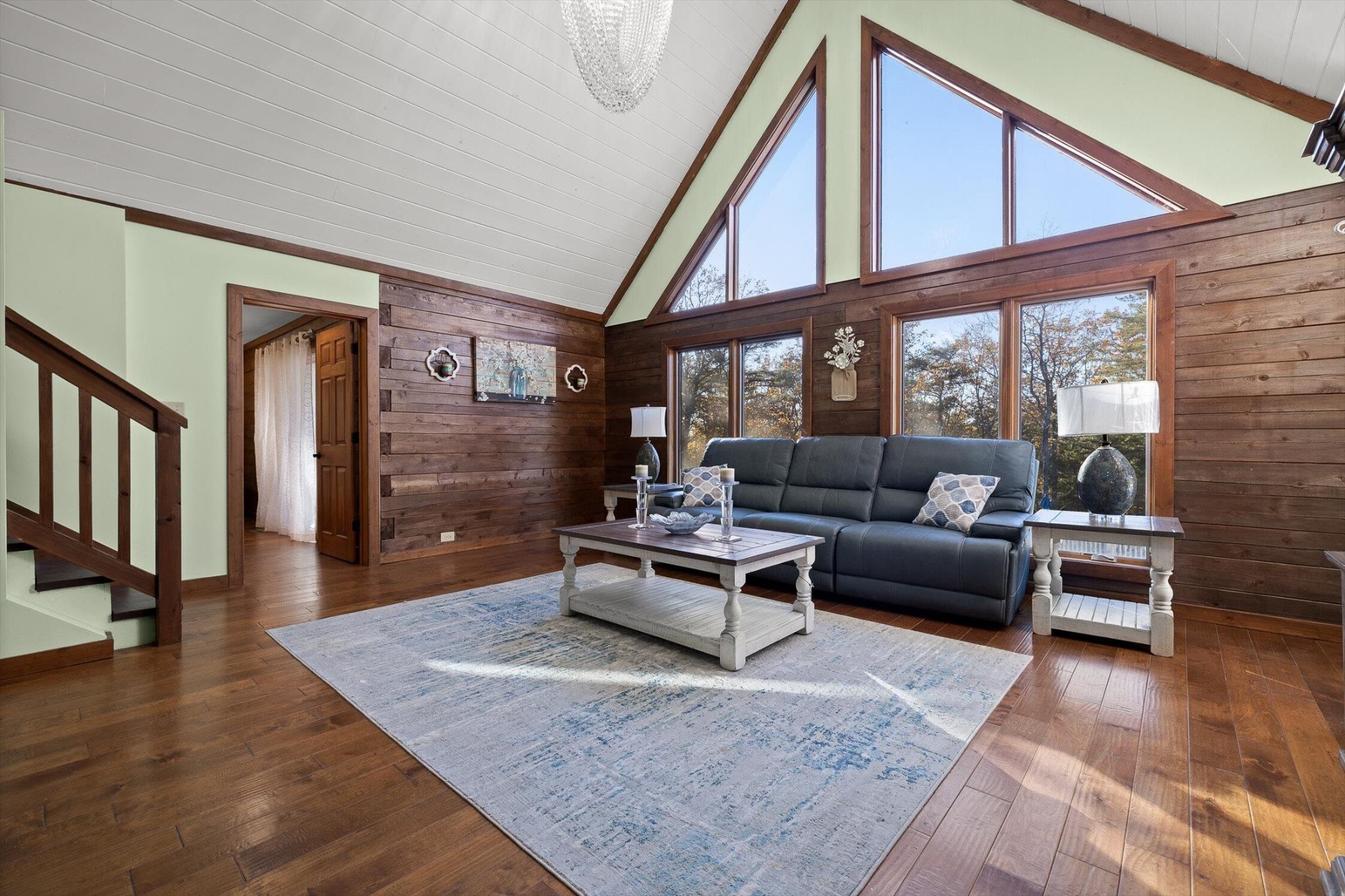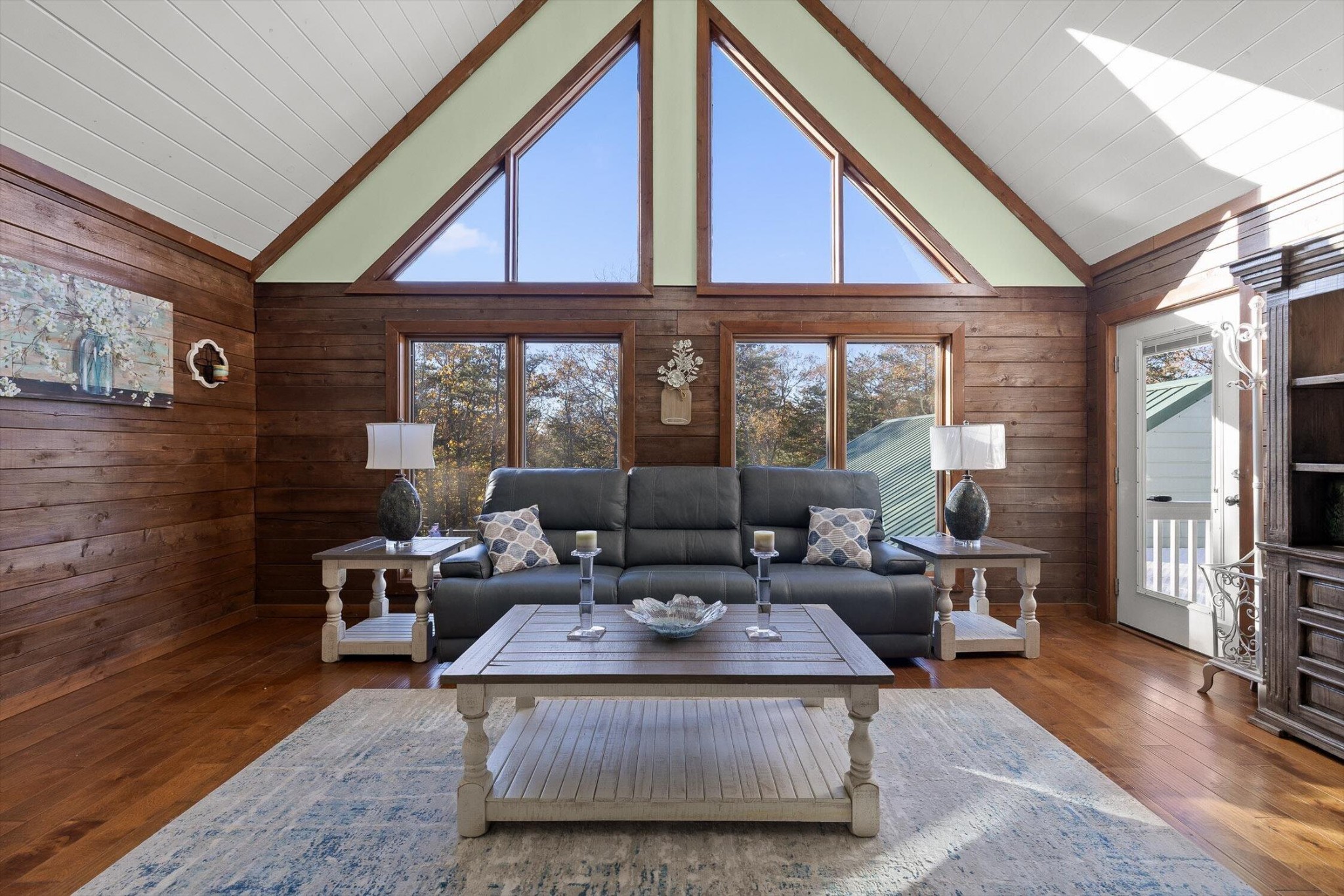 The main home features five bedrooms and four bathrooms, showcasing warm wood finishes, vaulted ceilings, and the timeless charm of exposed beams. With three full kitchens, the layout offers incredible flexibility for hosting, extended family, or rental opportunities.