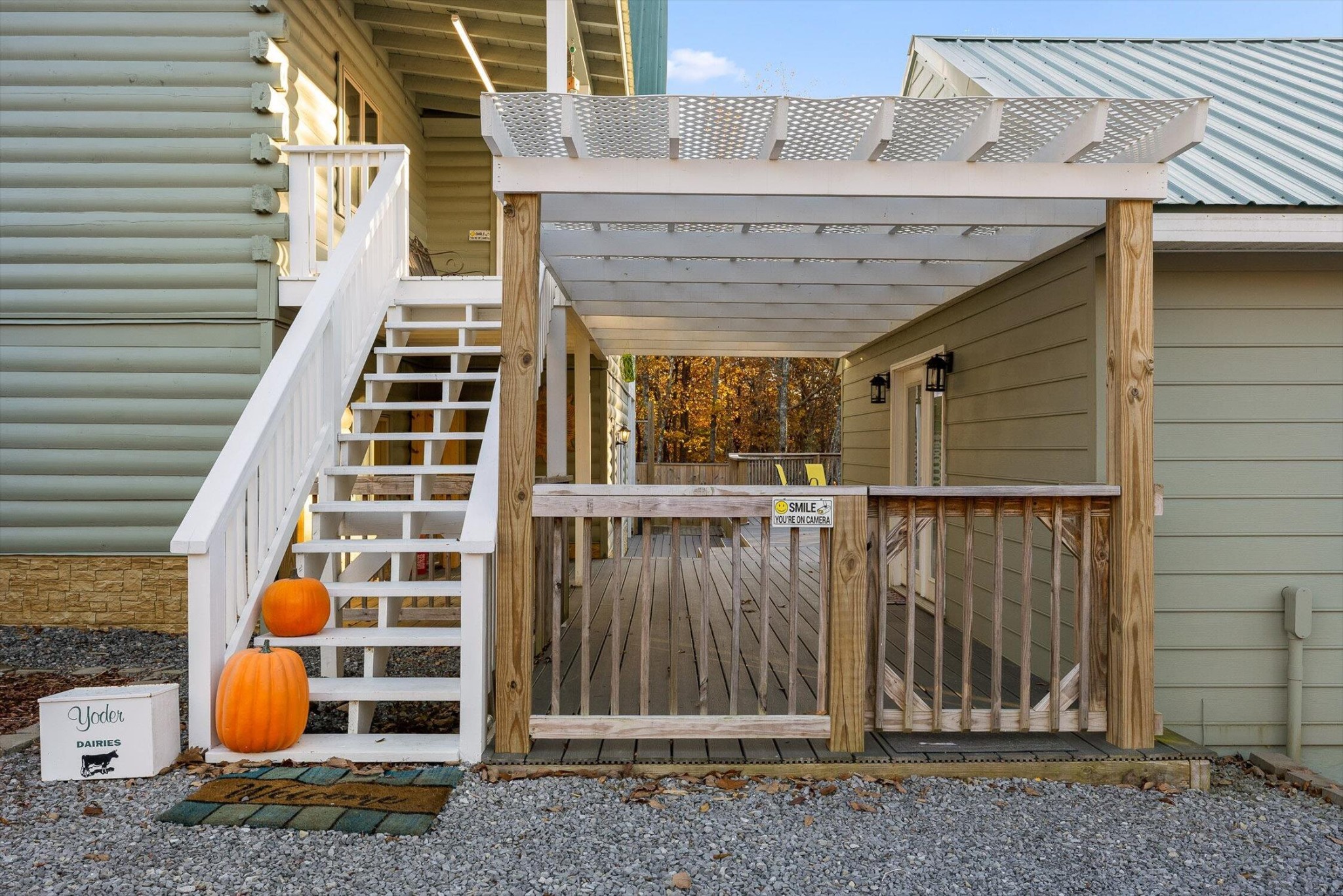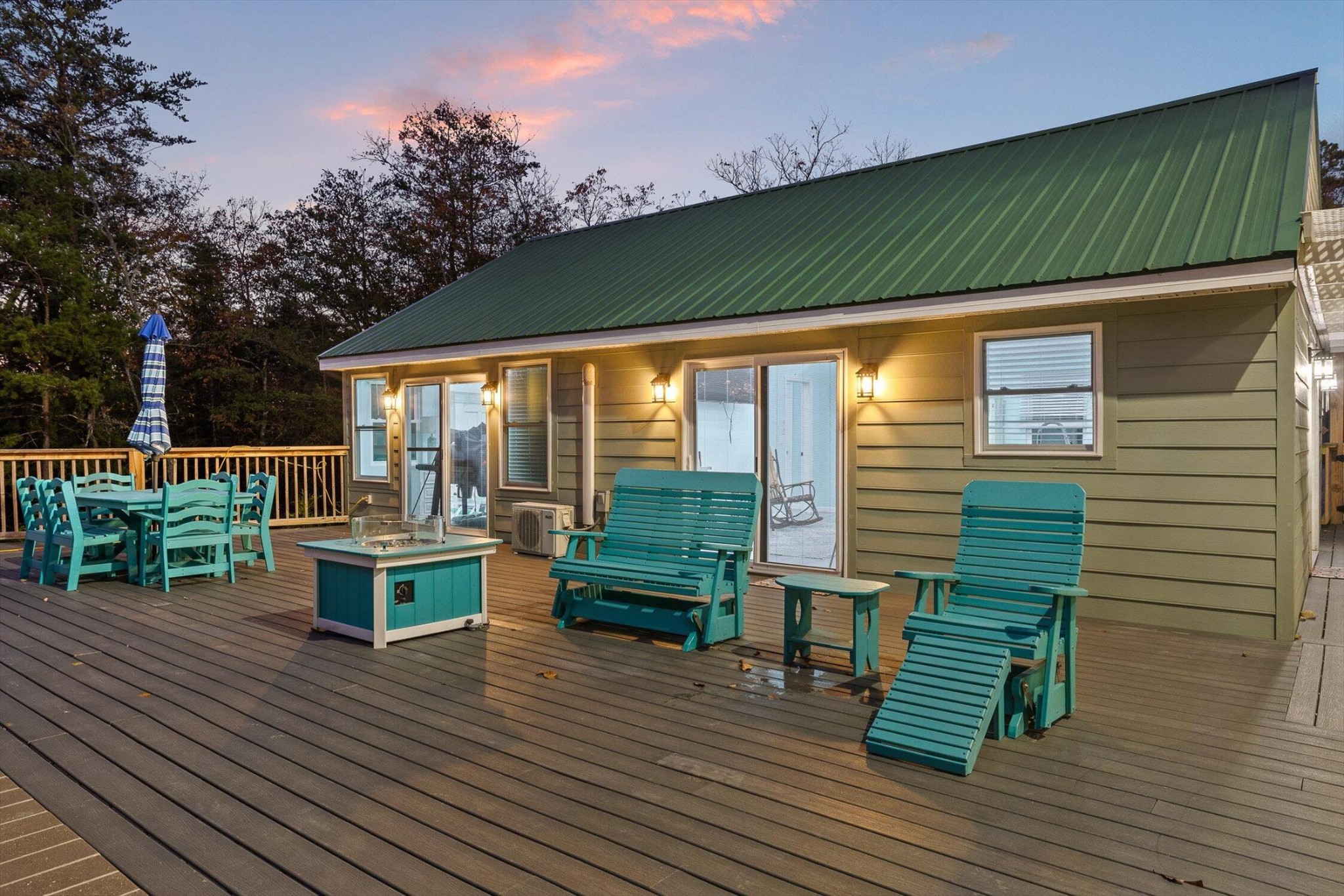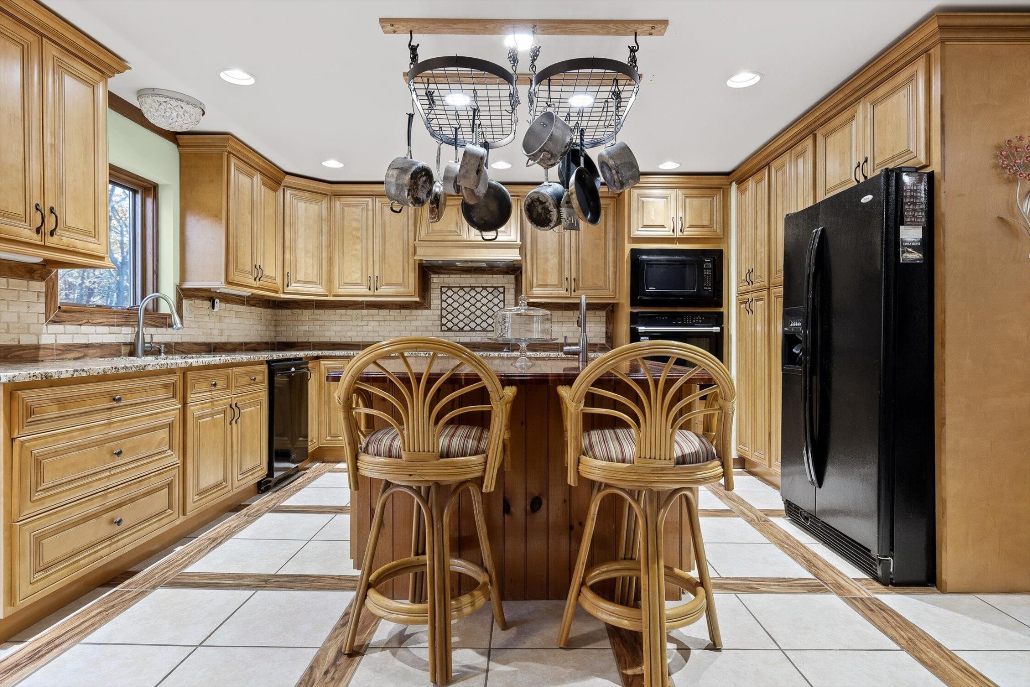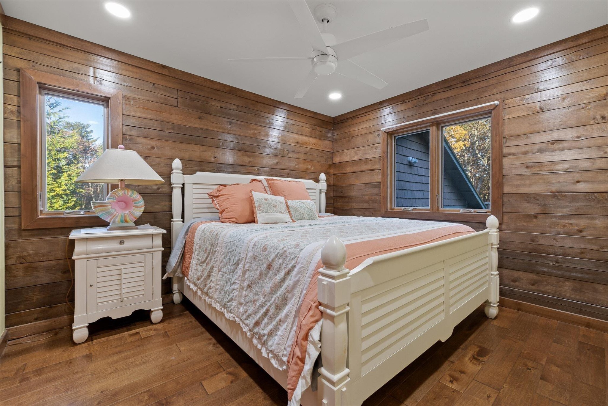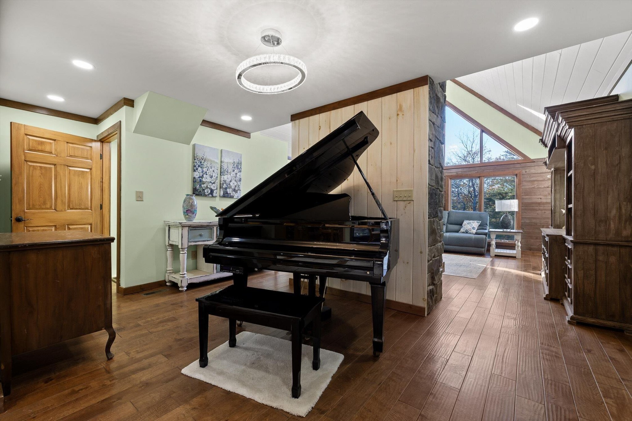The main home features five bedrooms and four bathrooms, showcasing warm wood finishes, vaulted ceilings, and the timeless charm of exposed beams. With three full kitchens, the layout offers incredible flexibility for hosting, extended family, or rental opportunities.
