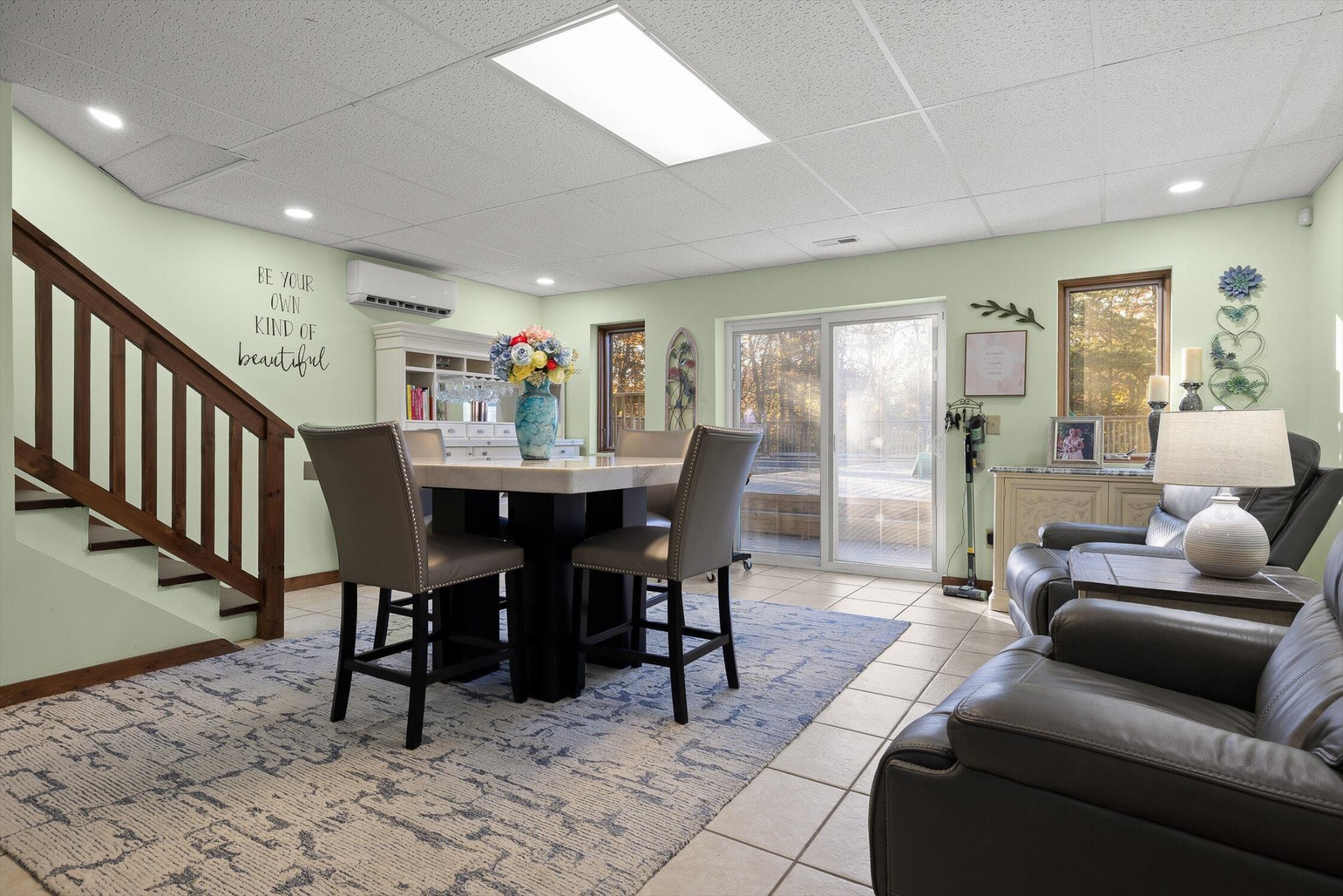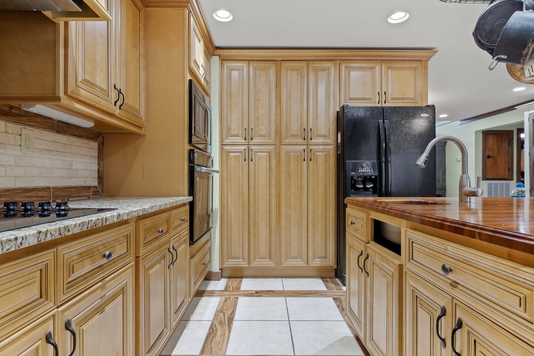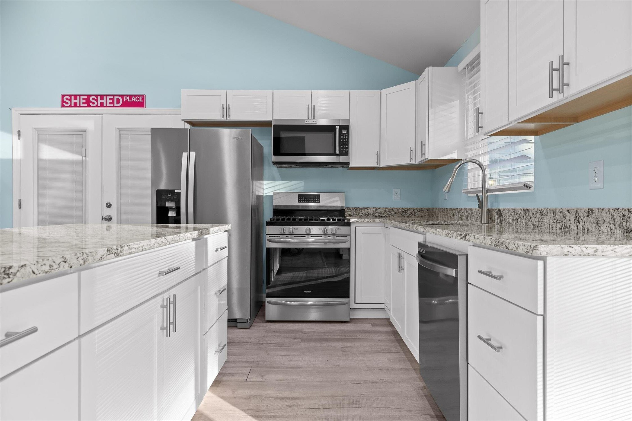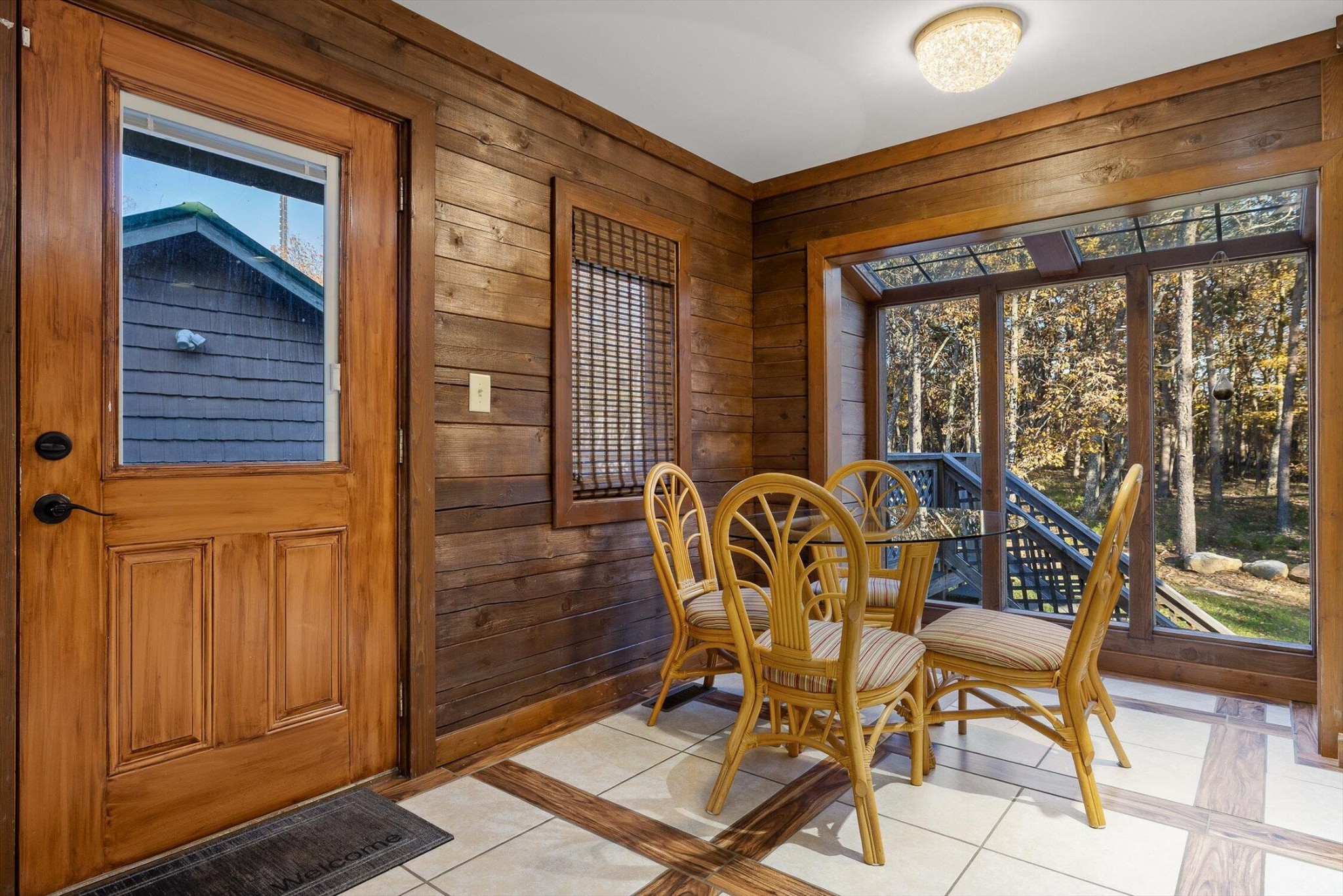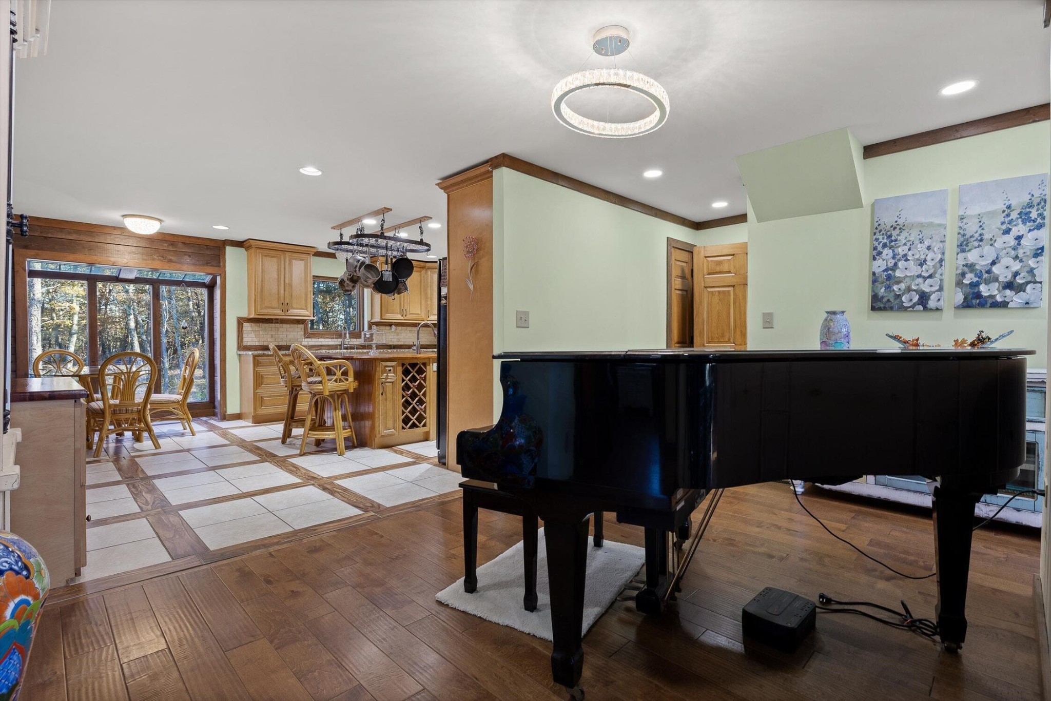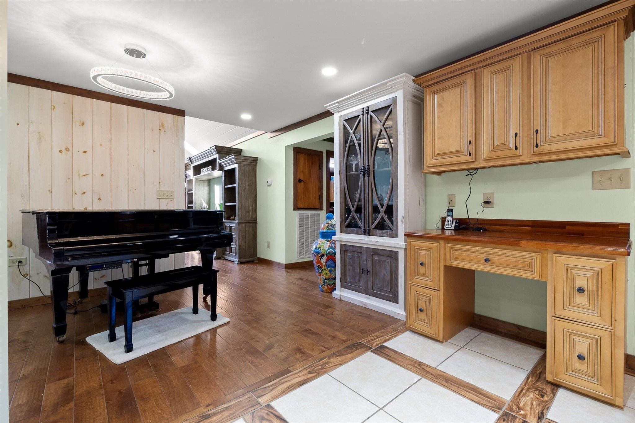 The main home features five bedrooms and four bathrooms, showcasing warm wood finishes, vaulted ceilings, and the timeless charm of exposed beams. With three full kitchens, the layout offers incredible flexibility for hosting, extended family, or rental opportunities.