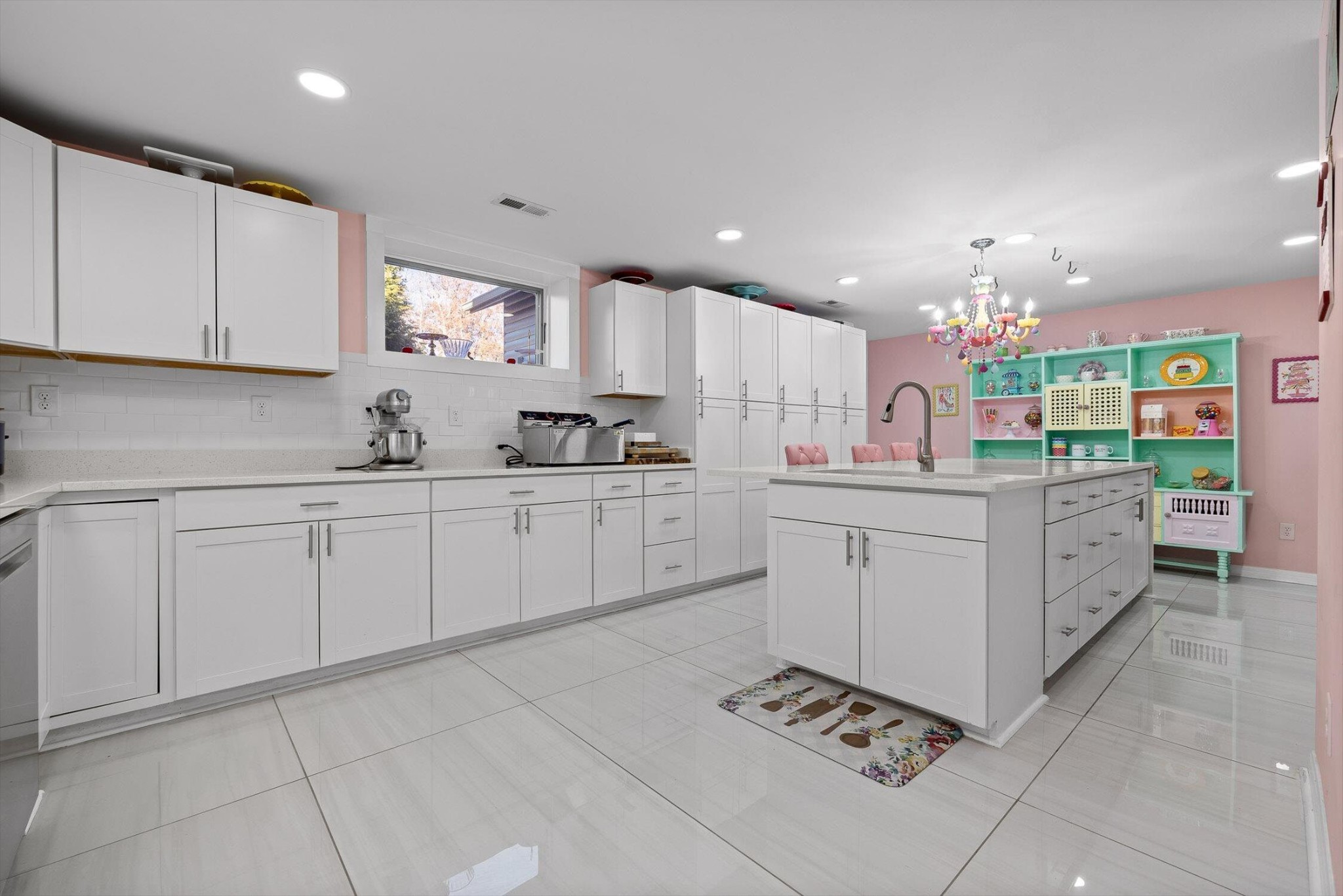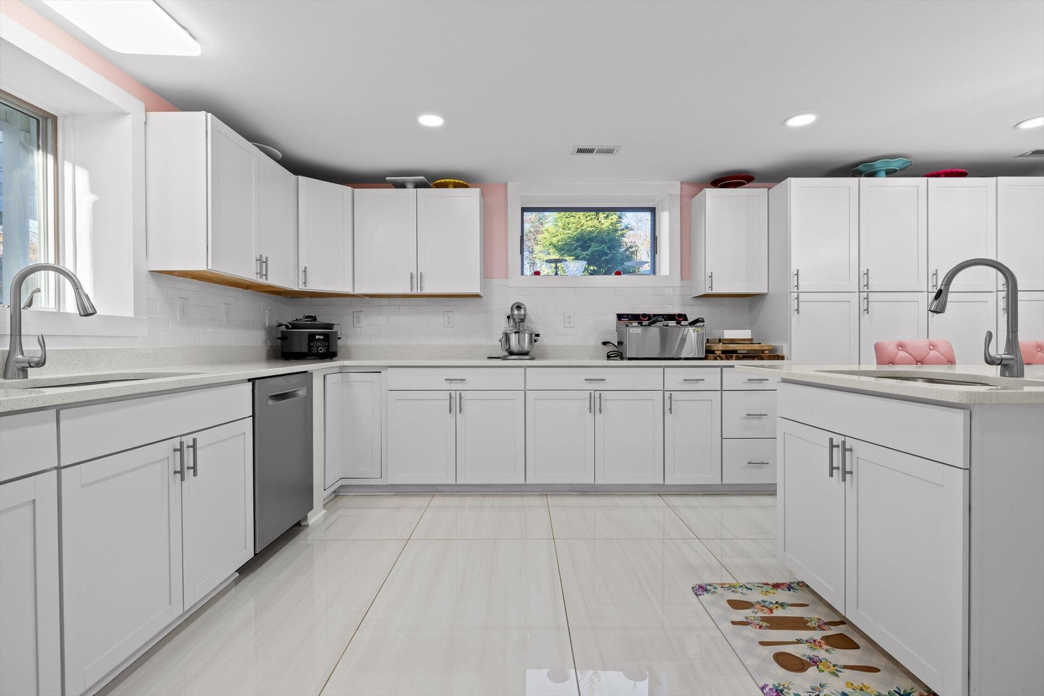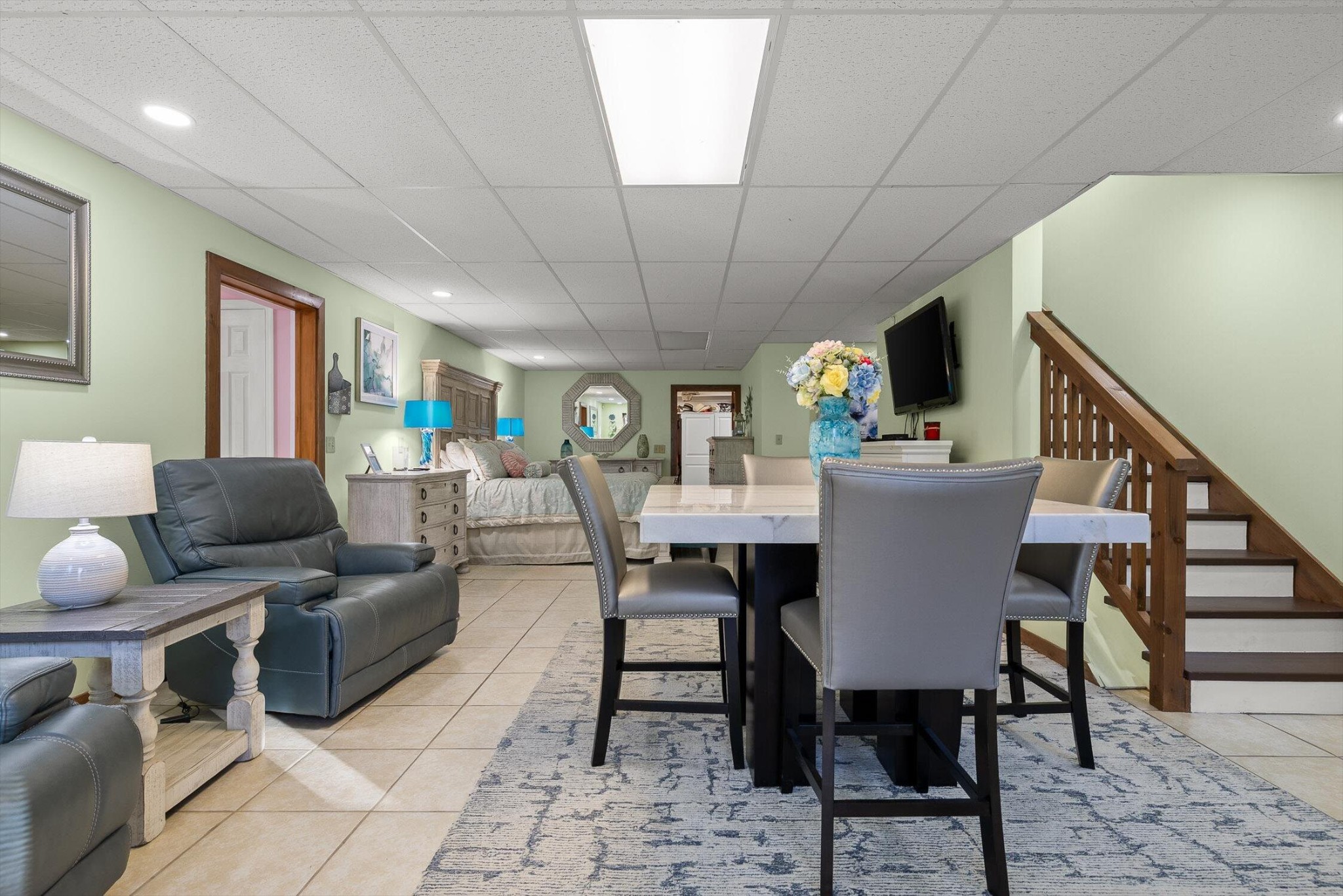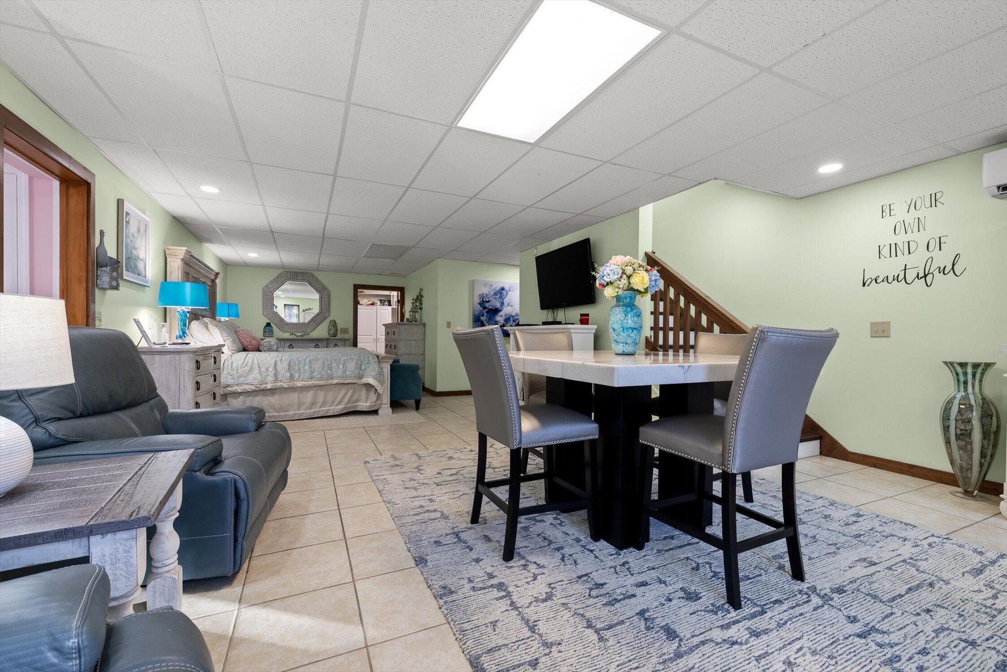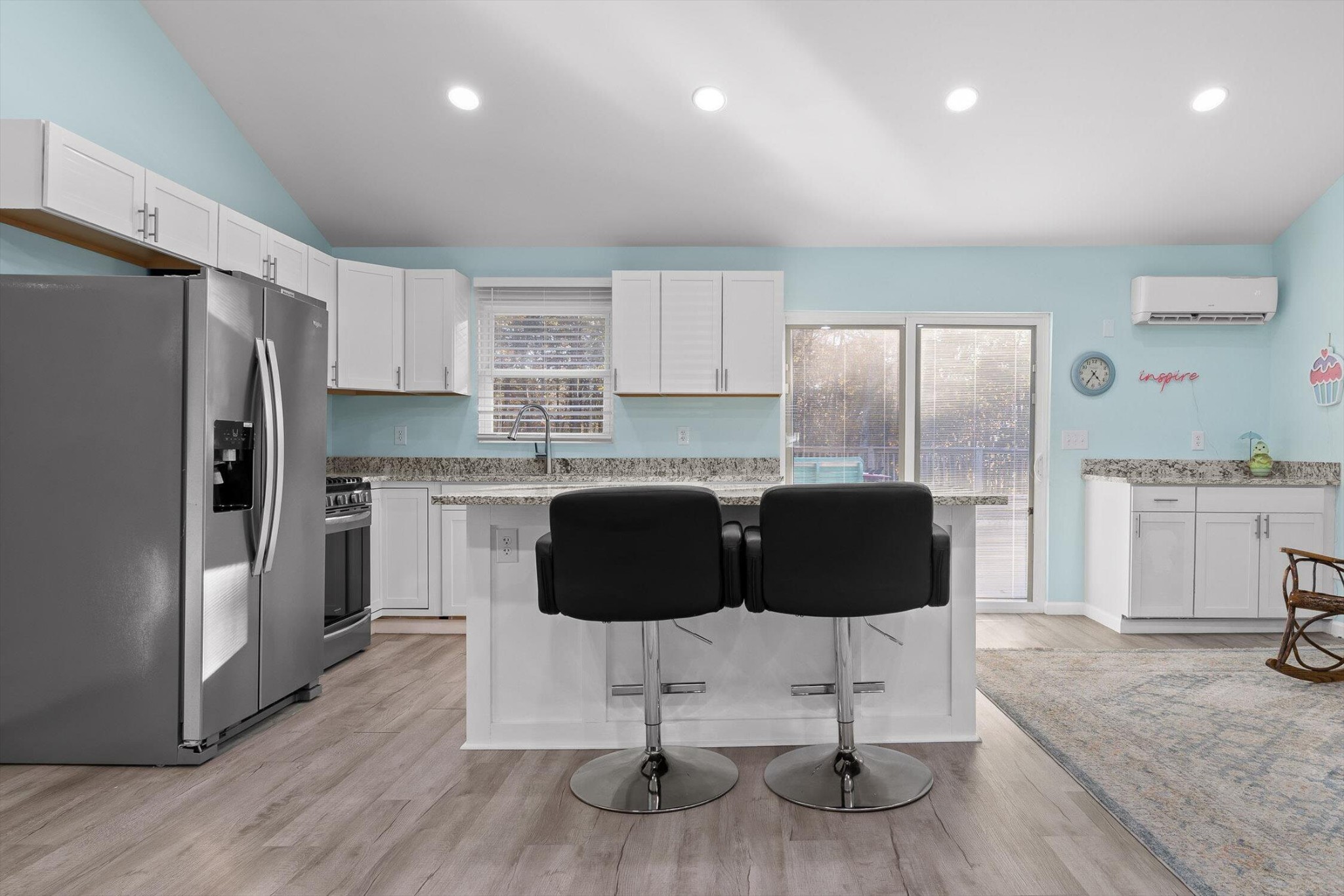 The main home features five bedrooms and four bathrooms, showcasing warm wood finishes, vaulted ceilings, and the timeless charm of exposed beams. With three full kitchens, the layout offers incredible flexibility for hosting, extended family, or rental opportunities.