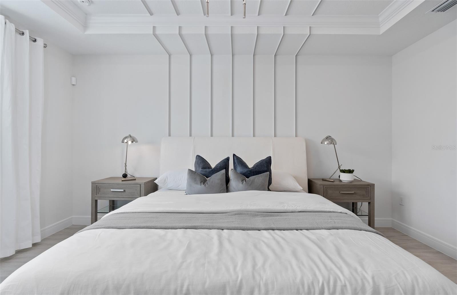 The spacious, single-story Palmary dream home by Del Webb showcases a Florida Mediterranean exterior with stone masonry, offering 2 bedrooms, an open flex room, 2 bathrooms, Sunroom, a covered lanai, and a 2-car garage. At the heart of the home, the gourmet kitchen is a standout feature, equipped with 42" Dana Colada cabinetry, Quartz countertops, a decorative tile backsplash, granite sink, and upgraded faucet. Whirlpool stainless steel appliances, including a natural gas cooktop, complete this culinary haven. The open-concept living area, flooded with natural light from expansive windows and highlighted by tall ceilings — including a tray ceiling in the gathering room — creates an airy, welcoming space perfect for relaxing or entertaining. The covered lanai with patio extension blends your living space with the outdoors, making it ideal for seamless gatherings. The private owner's suite offers a luxurious retreat, featuring a spa-like bathroom with a frameless glass-enclosed shower with bench, garden tub, dual vanities with quartz countertops, and a spacious walk-in closet. The bathroom also includes an enclosed toilet for privacy and a linen closet for added convenience. At the front of the home, the spare bedroom, bathroom, and versatile flex room provide ample space for guests or personal use. Designer-curated selections elevate this home with pendant pre-wiring, comfort-height toilets, and Lumber Honey wood-look porcelain tile flooring throughout. Additional LED downlights provide perfect illumination, while 8' Cheyenne-style interior doors complement the tall ceilings, enhancing the home’s elegant feel. For modern convenience, this home is equipped with a smart thermostat, smart doorbell, and additional data ports. Blending luxury, comfort, and cutting-edge connectivity, this home is designed for today’s lifestyle. Schedule an appointment to see it today!