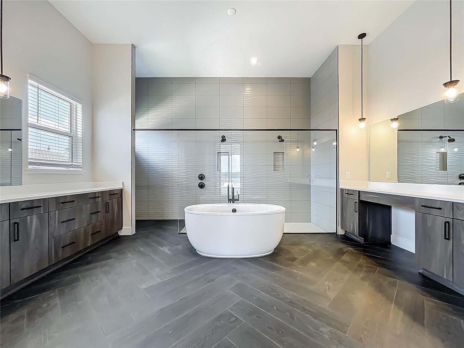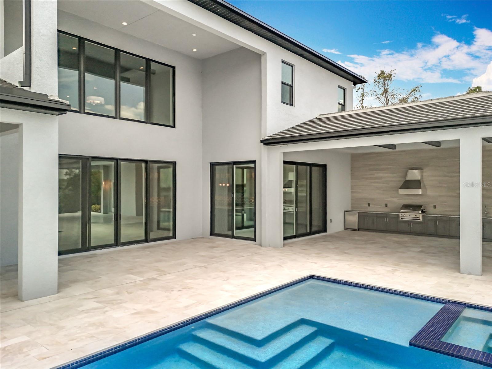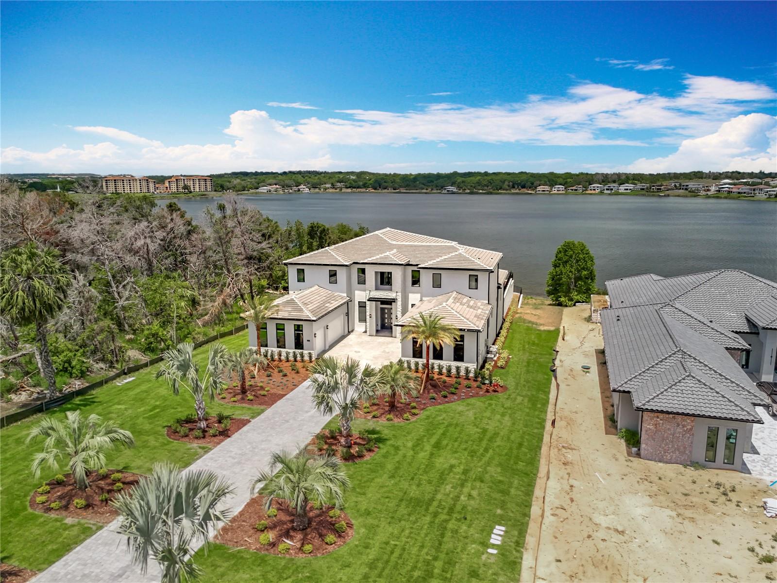 STAND OUT FROM THE ORIDNARY and elevate your lifestyle into the breathtaking realm of Bella Collina! Introducing a newly constructed luxury lakefront residence highly positioned on an expansive acre-plus lot in the exclusive Estates section of the community. Overlooking the serene shores of Lake Sienna, this exceptional home offers panoramic water views, sophisticated interior finishes, and an ultra-impressive outdoor living space designed for both relaxation and entertaining. This is more than just a home, it’s a statement of purpose and meaning. From the moment you step through the covered entry, you’re met with dramatic architectural elements including double floating staircases, a soaring two-story open concept gathering space and uninterrupted sightlines to captivating lake views. The main level has been thoughtfully designed for both convenience and everyday living and features a grand, open concept living, dining, and kitchen area, a luxurious primary suite with lake views, a secondary en-suite bedroom, a versatile flex room, powder bath, large laundry room, and a practical drop zone off one of two oversized three-car garages. Upstairs, a walkway bridge for added privacy separates three additional en-suite bedrooms, a private home office, and a spacious loft and media room prewired with multiple Cat 6 outlets for today’s connected lifestyle. What truly sets this home apart is the outdoor living area with a spacious travertine deck, high ceiling covered lanai, fully equipped summer kitchen, gas fireplace, and a dedicated pool bath and shower - all framed by picturesque water views. The custom-designed infinity-edge pool is flanked by two raised pedestal mounts ideal for fire bowls or water features. A multi-person heated spa and sun shelf invite tranquil moments under the sun.