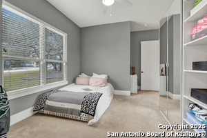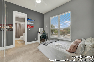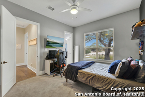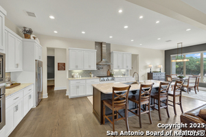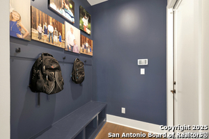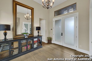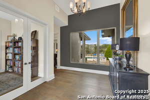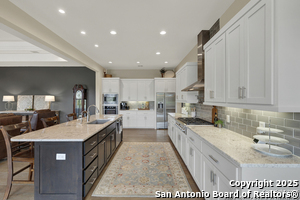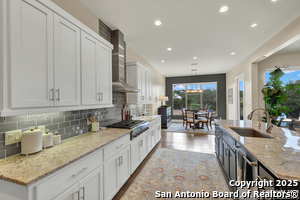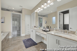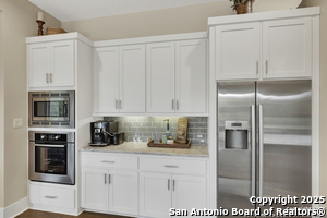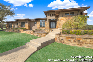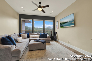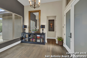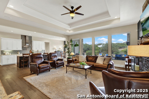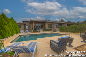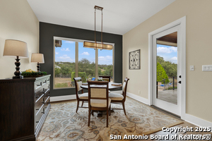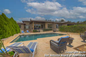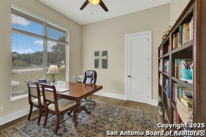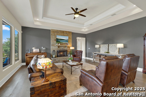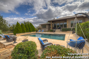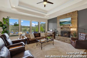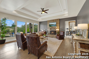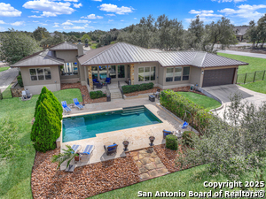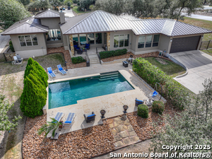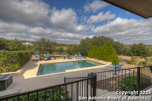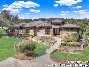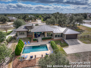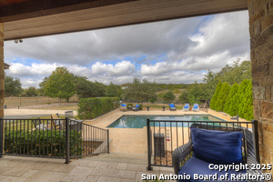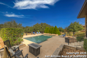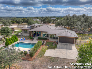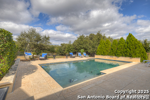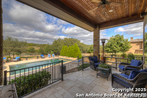 Stunning David Mills custom home in gated Copper Ridge! This luxury 4-bedroom, 3.5-bath residence sits on a 1-acre park-like corner lot with a private gated rear entry and exceptional curb appeal. Mature oaks, professional lighting, sprinkler system & elevated stone beds surround this elegant property, offering both privacy & beauty in one of New Braunfels' premier Hill Country communities. Inside, the open-concept floor plan showcases hardwood floors, soaring ceilings, & picture windows that fill the home with natural light. The spacious living room features gas fire logs & trayed ceilings with dimmable lighting. The gourmet kitchen boasts granite countertops, Bosch stainless appliances, Thermador gas cooktop, soft-close drawers, & a large walk-in pantry. The oversized primary suite includes dual vanities, honed granite counters, a soaking tub, & a large walk-in shower with a rain shower head, plus a custom closet with built-ins. Three of the four bedrooms include private ensuites, upgraded carpet, & 1/2" memory foam pad with spill guard. All bedrooms feature walk-in closets. The fourth bedroom, located near the front door, is currently used as an office. Additional features include a dedicated office, game/theater room, mudroom area with built-in bench, & a laundry room with granite counters, sink, cabinetry, & space for a refrigerator. The epoxy-floored garage offers 2 workrooms, tankless water heaters, water softener, extra attic decking, & the home is wired and equipped with speakers for surround sound inside & out. New main AC unit (April 2025) ensures year-round comfort. Step outside to your custom Keith Zars pool, perfectly positioned for privacy with no rear neighbor in view. Enjoy walking distance to the community park, pickleball and basketball courts, pool, pavilion, & mailboxes. Experience luxury Hill Country living in New Braunfels-a rare combination of craftsmanship, comfort, and lifestyle in Copper Ridge.