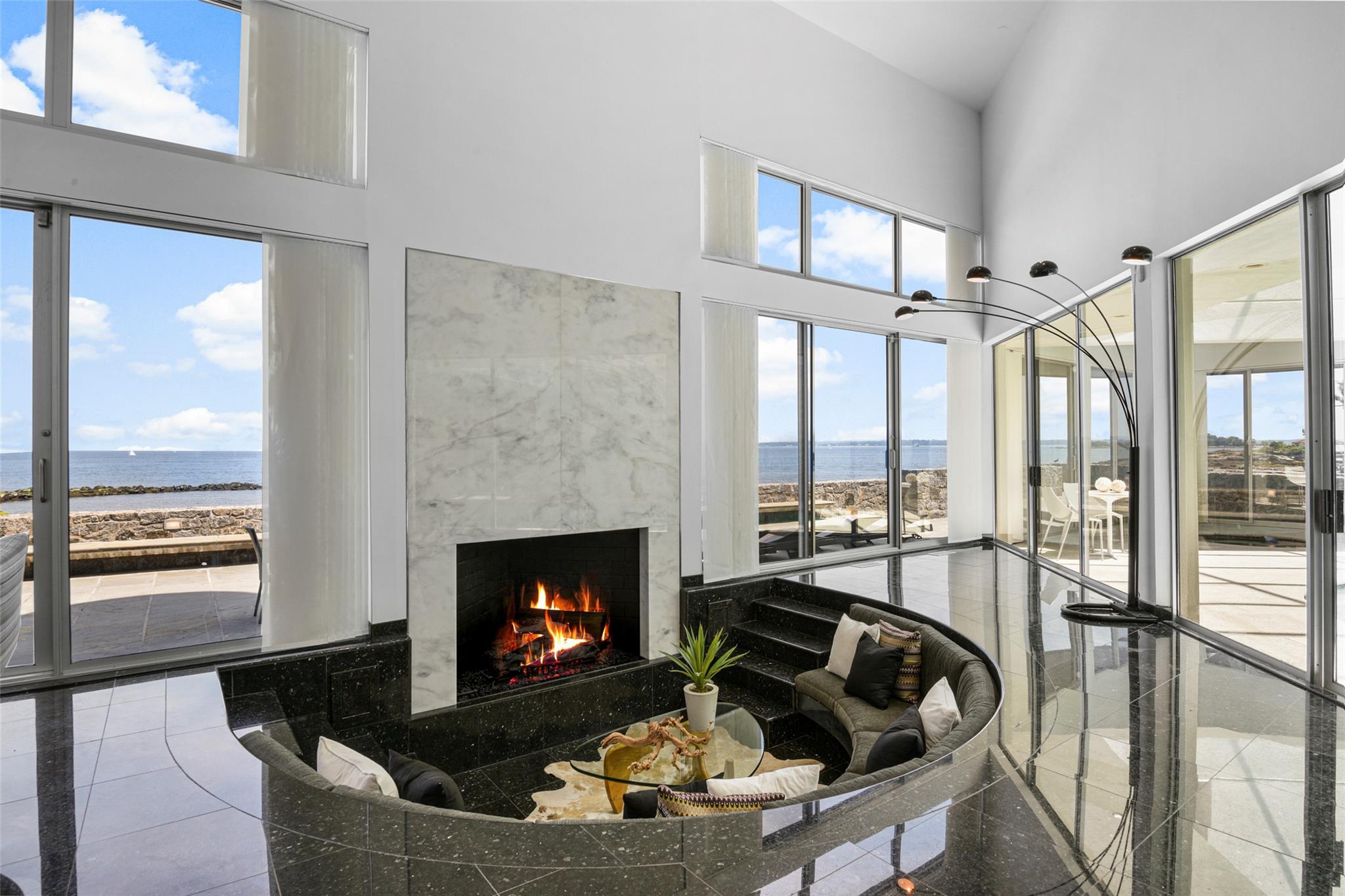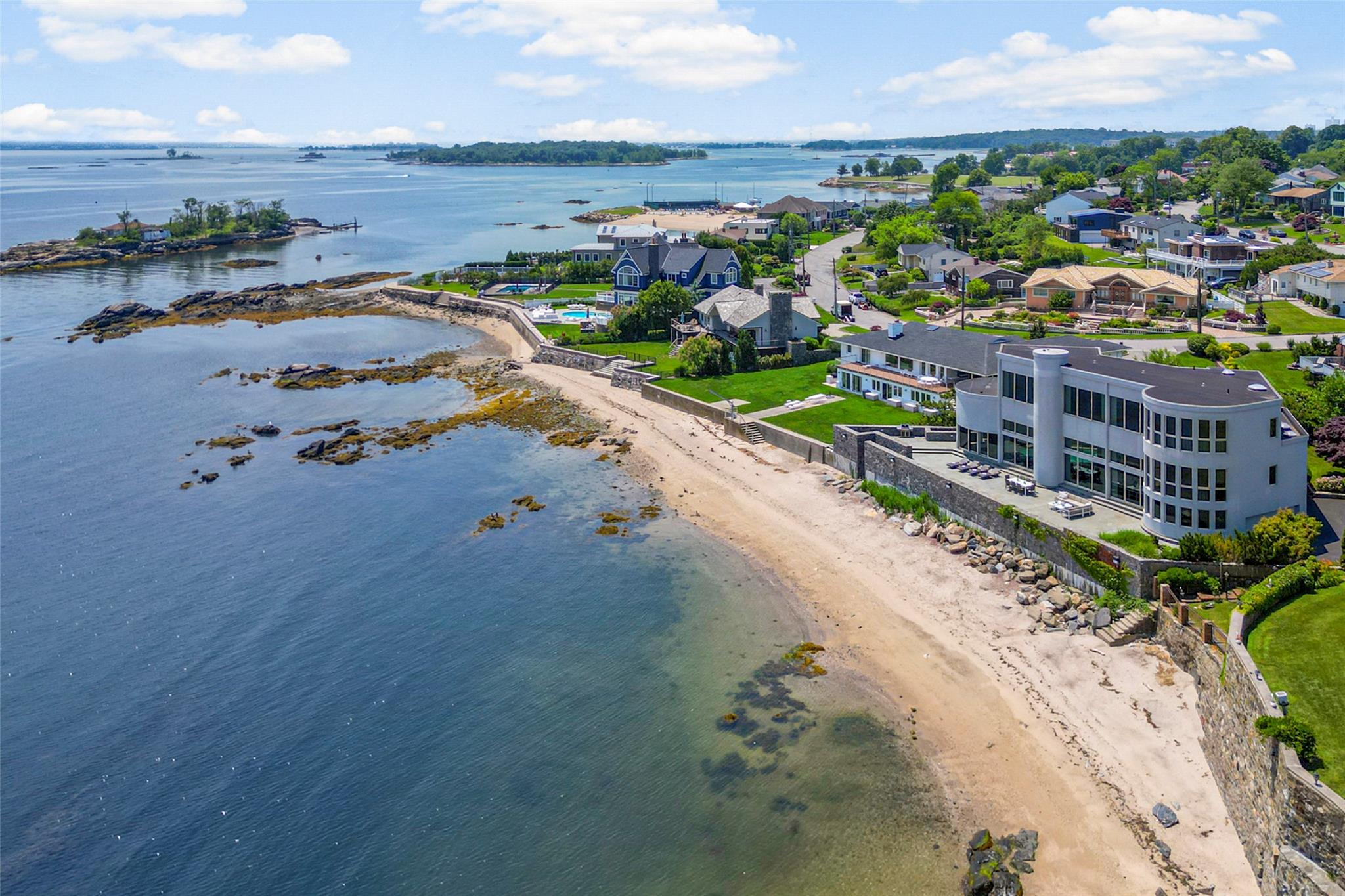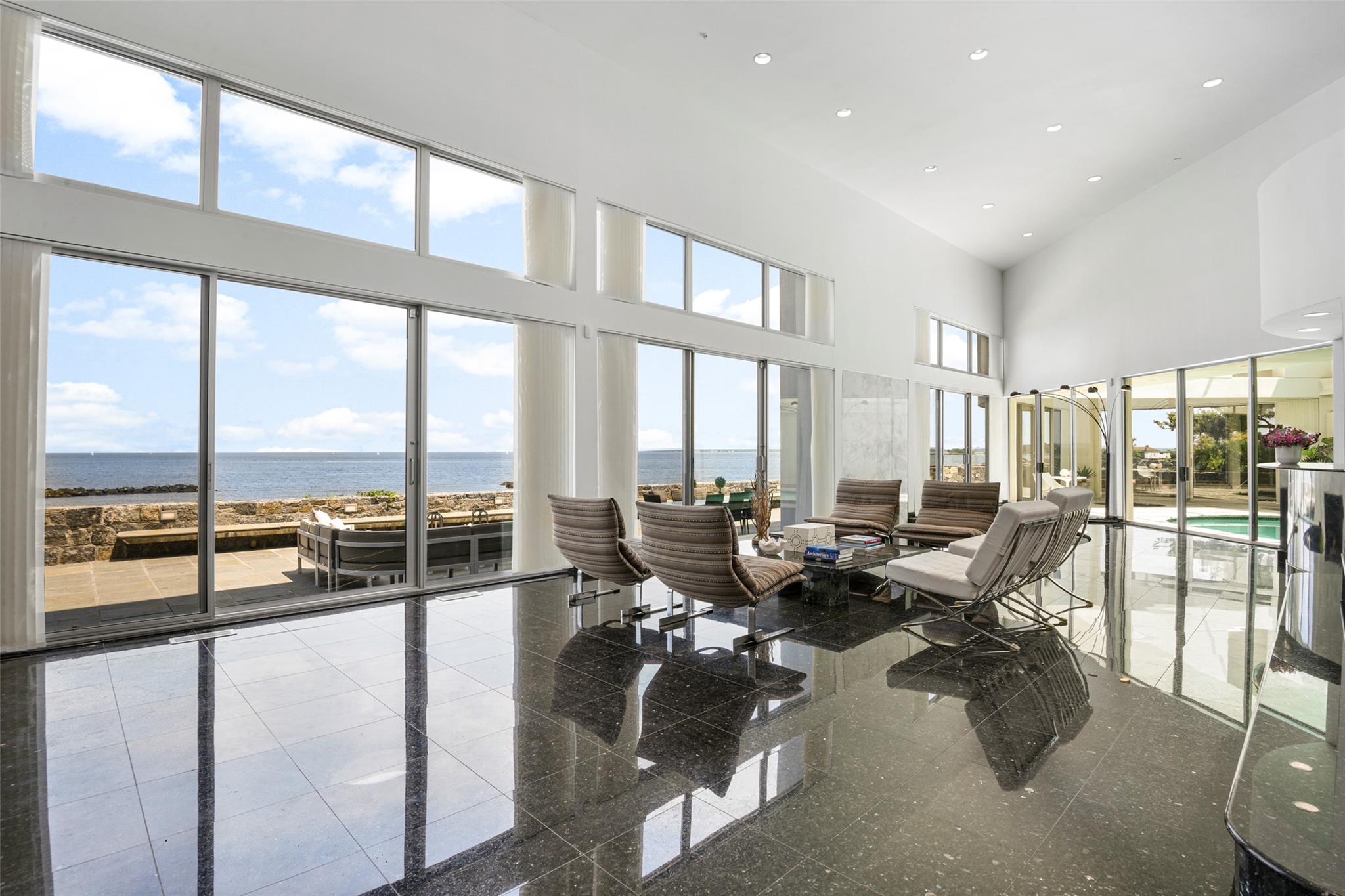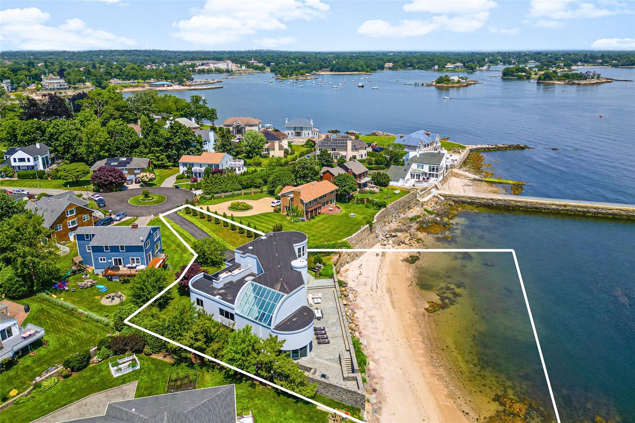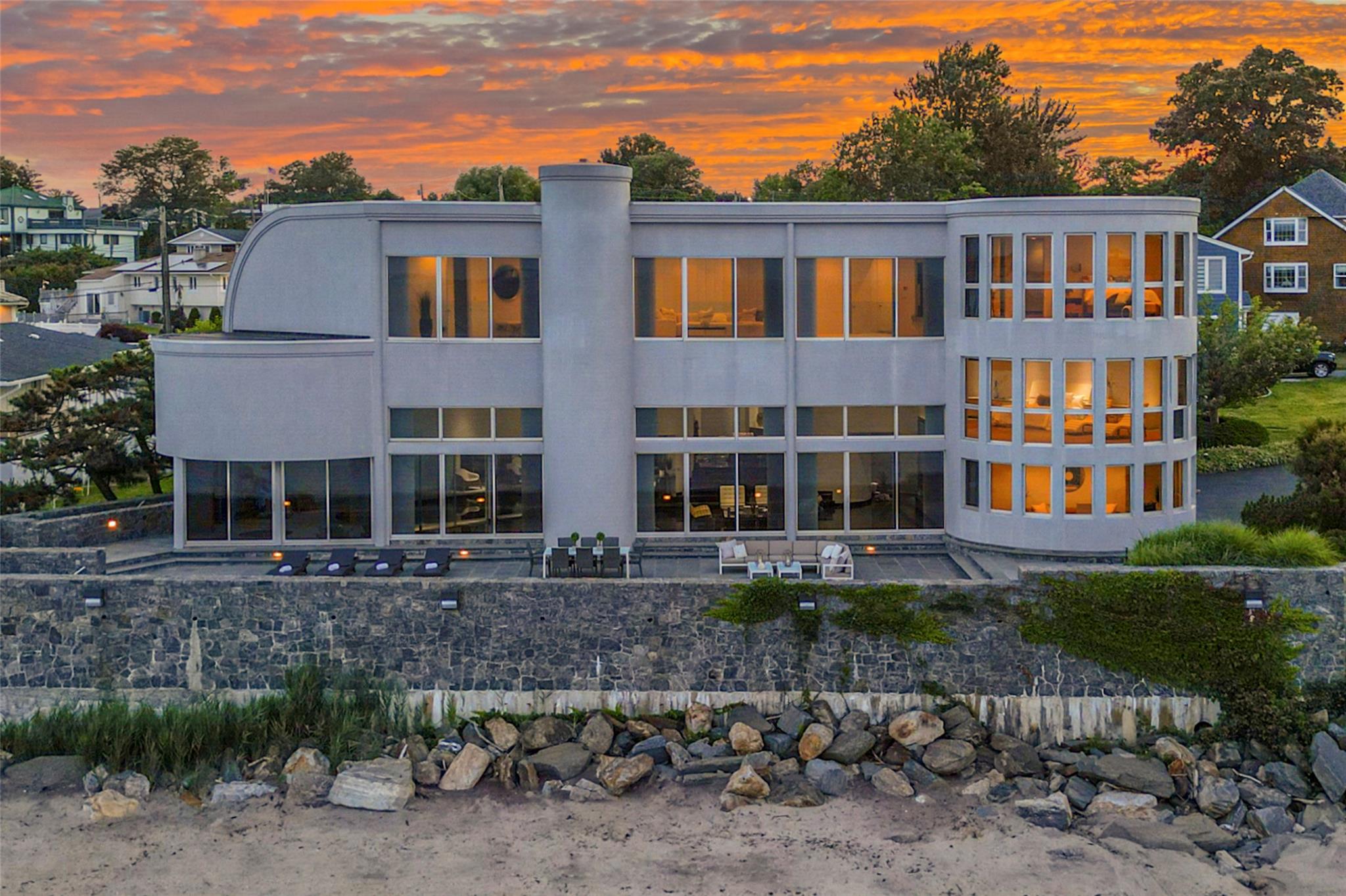 Waterfront Modernist Icon with Private Beach & Endless Views. Offered for the first time by its original owners, this architecturally significant waterfront home boasts over 118 feet of private shoreline and secluded sandy beach, with uninterrupted open ocean views across Long Island Sound. Designed in 1982 by renowned architect Myron Goldfinger and expanded in 1999, the residence is quietly tucked within an exclusive gated enclave of just 12 properties—only 35 minutes from midtown Manhattan by car. Featured in multiple design publications, this almost 6,000 sq ft modernist masterpiece showcases sculptural lines and curves, with soaring ceilings and skylights. Walls of glass blur the boundary between indoors and out, flooding the home with natural light and capturing breathtaking water views from nearly every room of this livable work-of-art home. Enter into the dramatic open living spaces, including a soaring living room with bar area, sunken conversation pit and fireplace, striking dining room, and designer eat-in kitchen. Host unforgettable gatherings year-round with the adjacent glass-clad indoor pool and jacuzzi room, or entertain on a grand scale from the expansive waterfront patio atop a steel beam and reinforced concrete constructed sea-wall. The design blends intimate and expansive public spaces - with sculptural curved stairways leading to four bedrooms thoughtfully spaced across two wings, and connected by a sensational family room on the third floor that feels suspended above the sea. Additional spaces include a home office, two powder rooms, au-pair suite off the kitchen, and two car garage. This one-of-a-kind property is located in an X-500 FEMA zone, so no flood insurance is required. Swim, kayak, or paddleboard from your private beach, forage among the rockpools, or take advantage of the additional association beach area and jetty with mooring rights. A rare chance to own an iconic modernist home with an unparalleled private beach and waterfront views in close proximity to NYC - where architecture, privacy, and nature meet in perfect harmony.