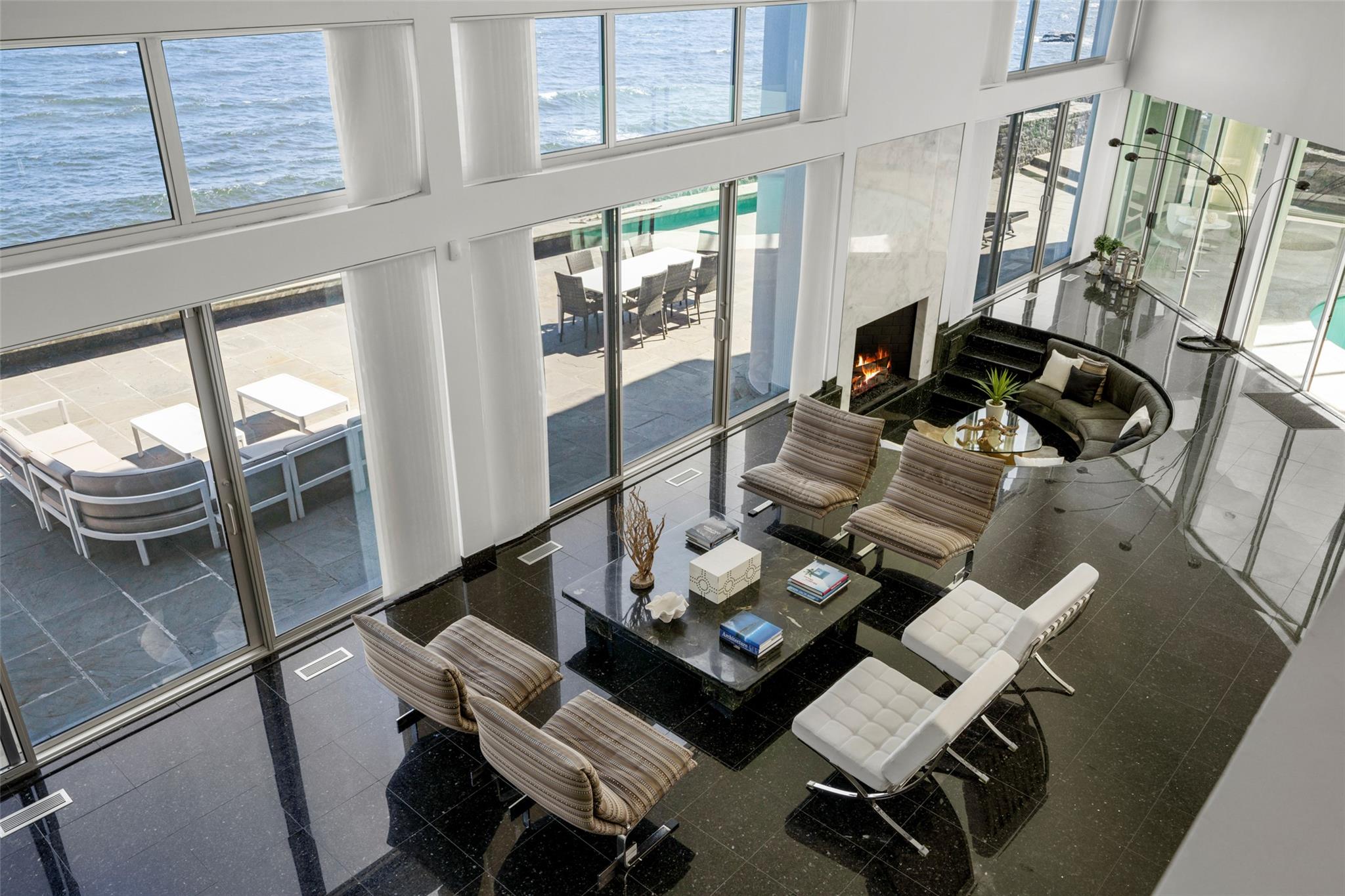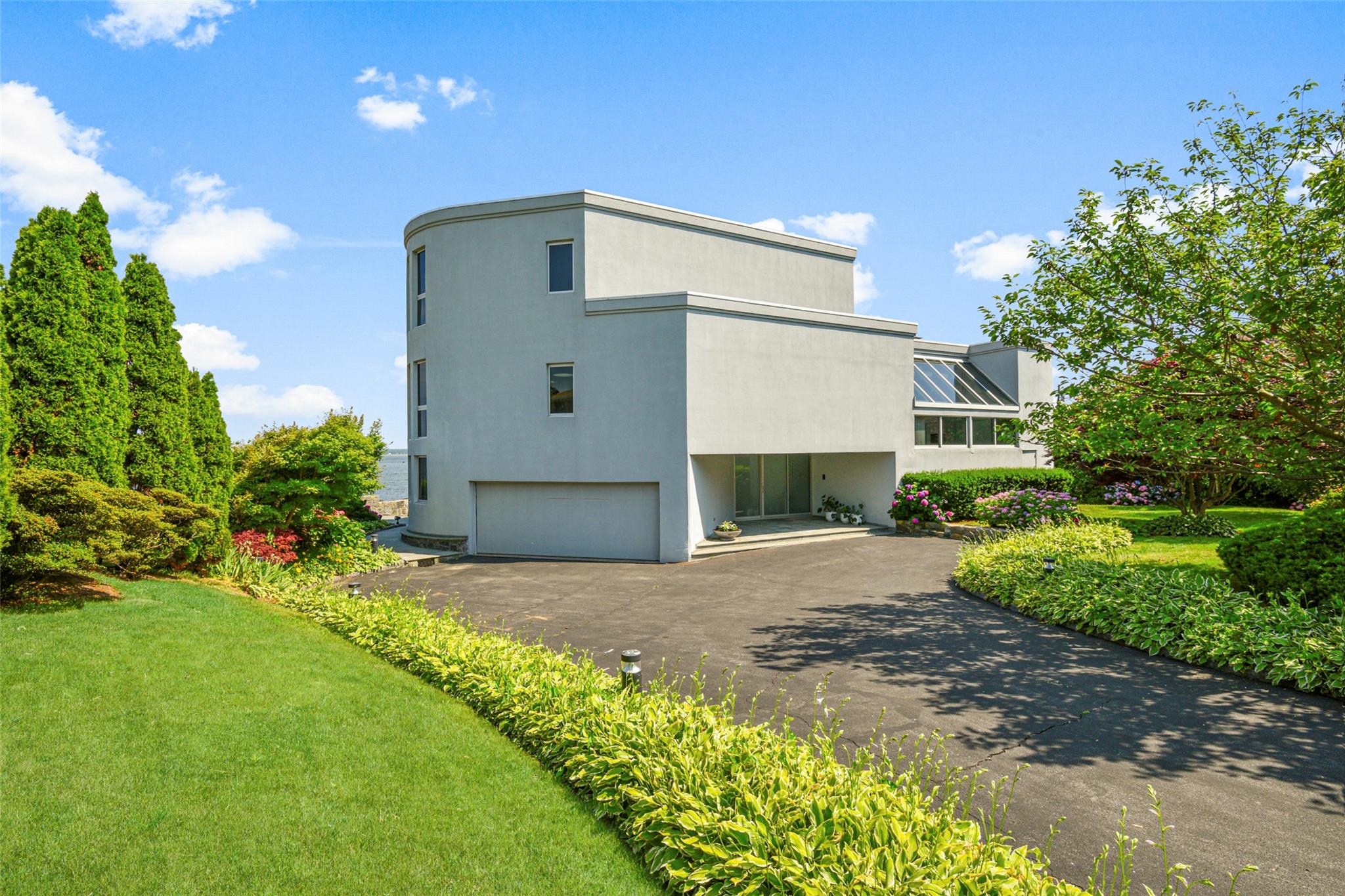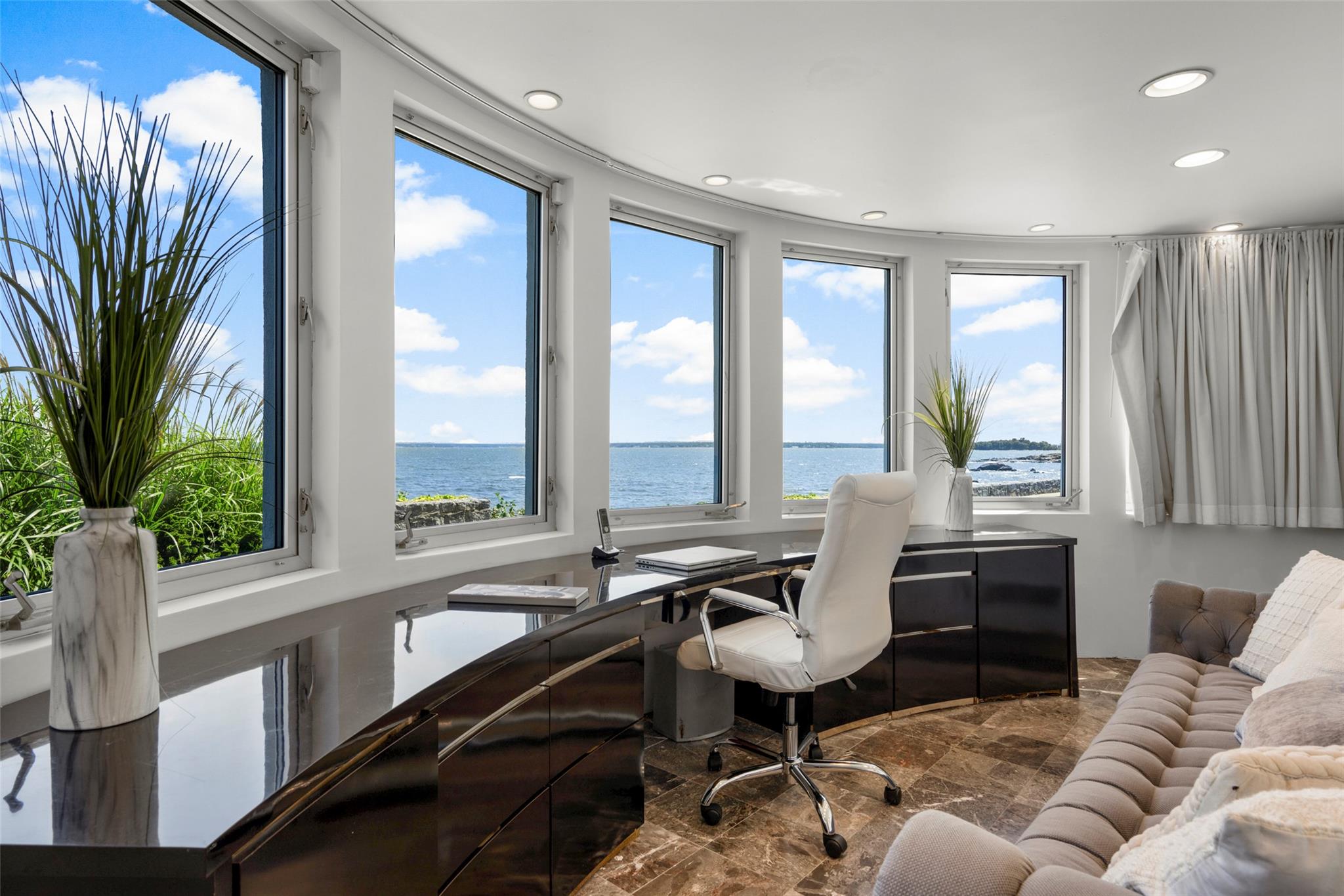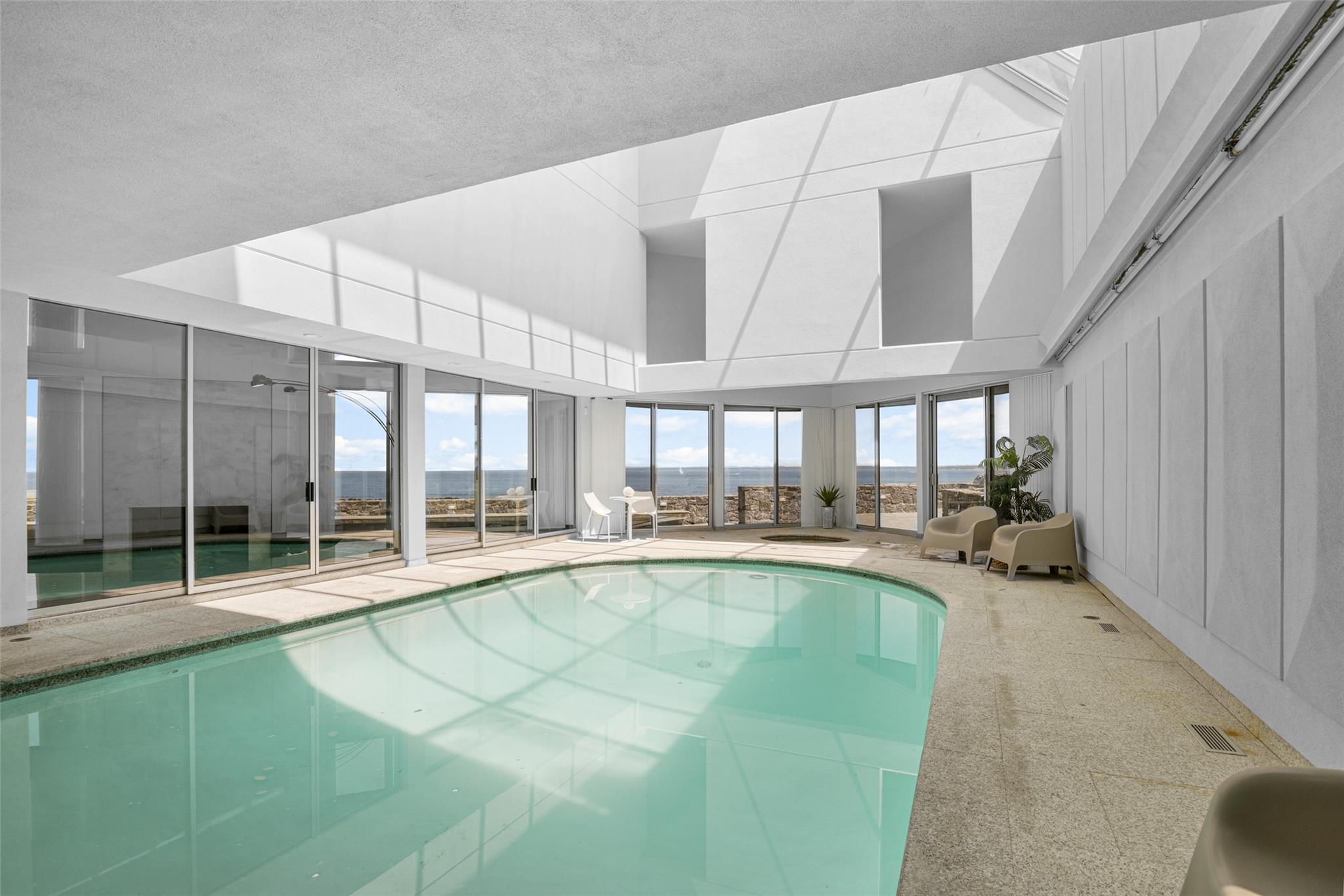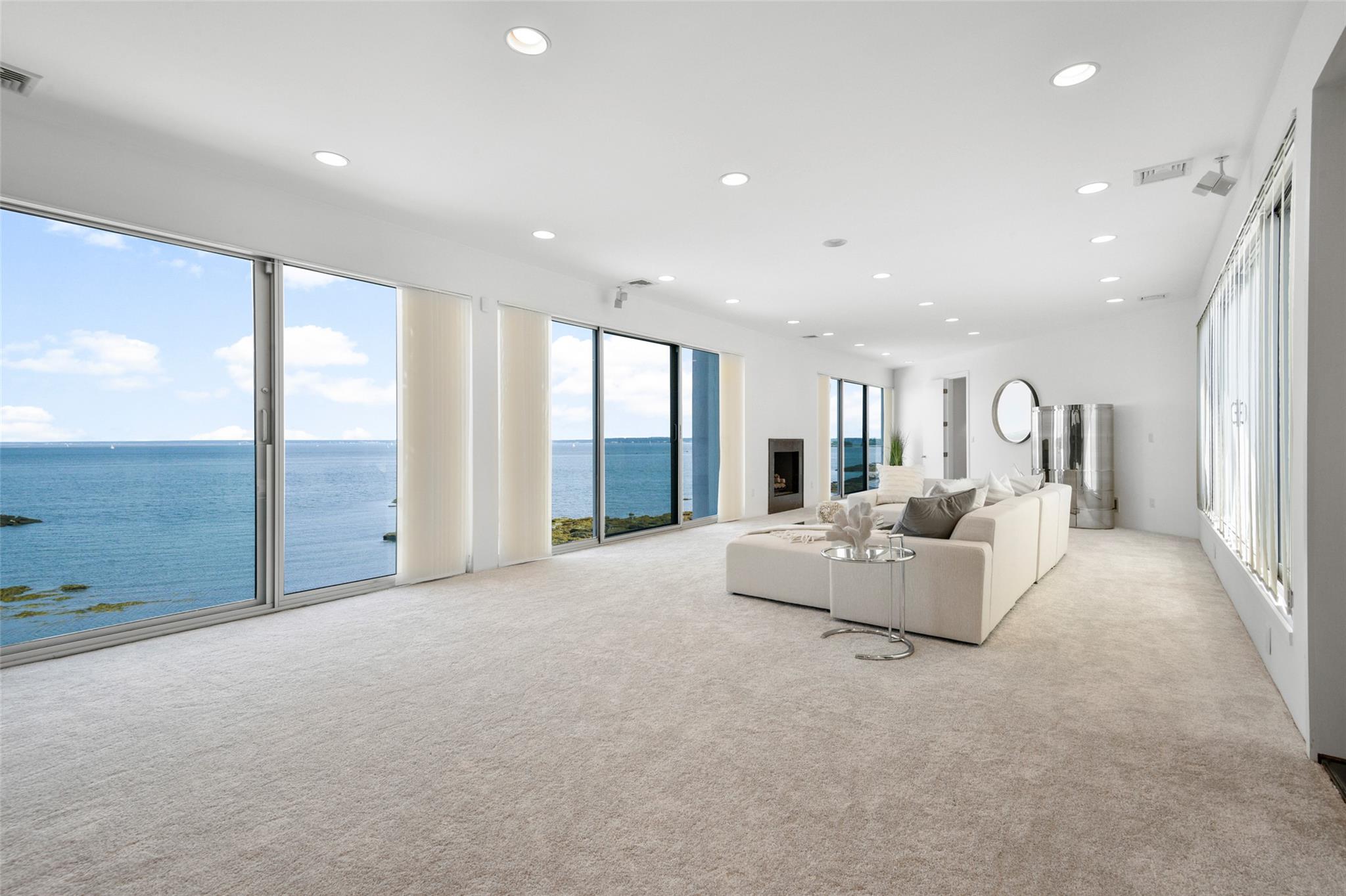 Waterfront Modernist Icon with Private Beach & Endless Views. Offered for the first time by its original owners, this architecturally significant waterfront home boasts over 118 feet of private shoreline and secluded sandy beach, with uninterrupted open ocean views across Long Island Sound. Designed in 1982 by renowned architect Myron Goldfinger and expanded in 1999, the residence is quietly tucked within an exclusive gated enclave of just 12 properties—only 35 minutes from midtown Manhattan by car. Featured in multiple design publications, this almost 6,000 sq ft modernist masterpiece showcases sculptural lines and curves, with soaring ceilings and skylights. Walls of glass blur the boundary between indoors and out, flooding the home with natural light and capturing breathtaking water views from nearly every room of this livable work-of-art home. Enter into the dramatic open living spaces, including a soaring living room with bar area, sunken conversation pit and fireplace, striking dining room, and designer eat-in kitchen. Host unforgettable gatherings year-round with the adjacent glass-clad indoor pool and jacuzzi room, or entertain on a grand scale from the expansive waterfront patio atop a steel beam and reinforced concrete constructed sea-wall. The design blends intimate and expansive public spaces - with sculptural curved stairways leading to four bedrooms thoughtfully spaced across two wings, and connected by a sensational family room on the third floor that feels suspended above the sea. Additional spaces include a home office, two powder rooms, au-pair suite off the kitchen, and two car garage. This one-of-a-kind property is located in an X-500 FEMA zone, so no flood insurance is required. Swim, kayak, or paddleboard from your private beach, forage among the rockpools, or take advantage of the additional association beach area and jetty with mooring rights. A rare chance to own an iconic modernist home with an unparalleled private beach and waterfront views in close proximity to NYC - where architecture, privacy, and nature meet in perfect harmony.