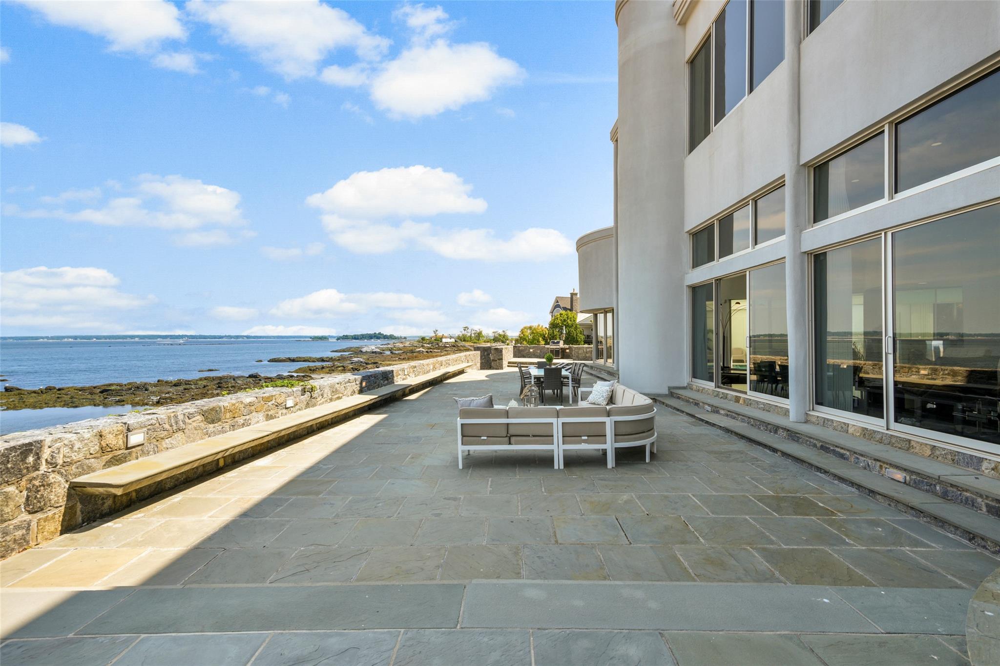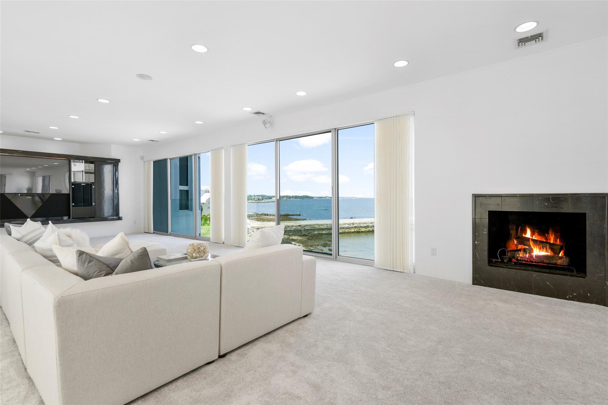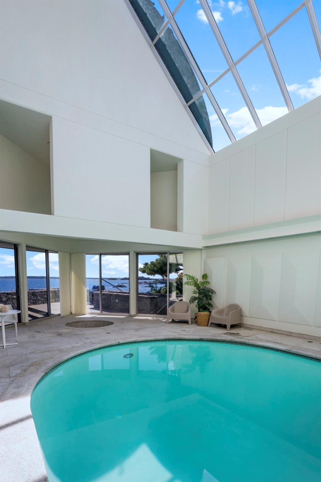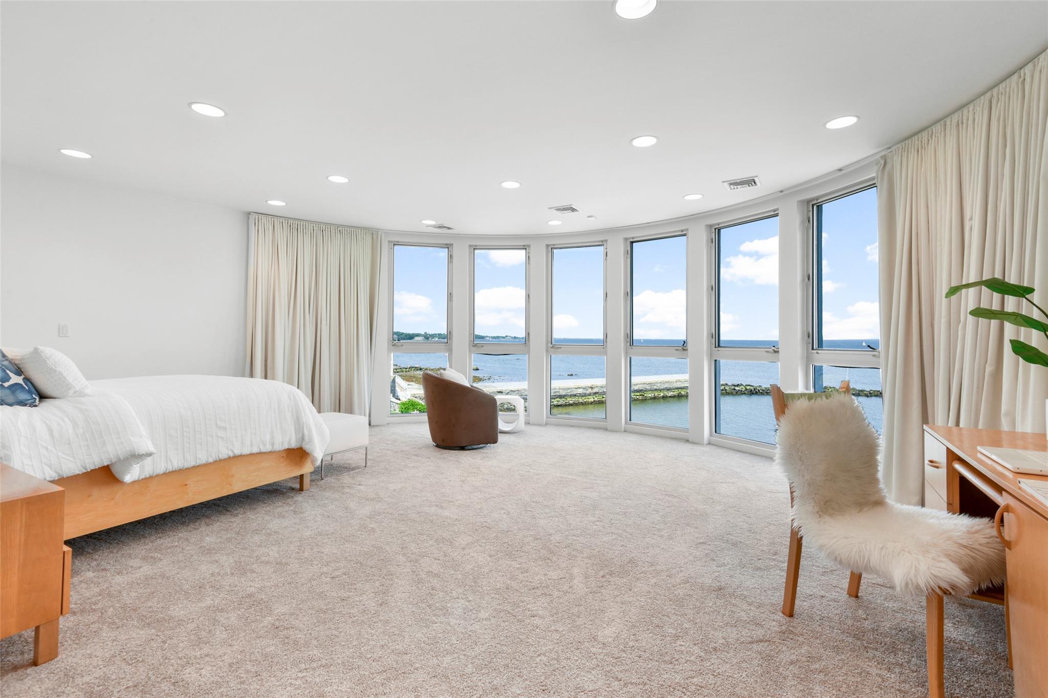 Waterfront Modernist Icon with Private Beach & Endless Views. Offered for the first time by its original owners, this architecturally significant waterfront home boasts over 118 feet of private shoreline and secluded sandy beach, with uninterrupted open ocean views across Long Island Sound. Designed in 1982 by renowned architect Myron Goldfinger and expanded in 1999, the residence is quietly tucked within an exclusive gated enclave of just 12 properties—only 35 minutes from midtown Manhattan by car. Featured in multiple design publications, this almost 6,000 sq ft modernist masterpiece showcases sculptural lines and curves, with soaring ceilings and skylights. Walls of glass blur the boundary between indoors and out, flooding the home with natural light and capturing breathtaking water views from nearly every room of this livable work-of-art home. Enter into the dramatic open living spaces, including a soaring living room with bar area, sunken conversation pit and fireplace, striking dining room, and designer eat-in kitchen. Host unforgettable gatherings year-round with the adjacent glass-clad indoor pool and jacuzzi room, or entertain on a grand scale from the expansive waterfront patio atop a steel beam and reinforced concrete constructed sea-wall. The design blends intimate and expansive public spaces - with sculptural curved stairways leading to four bedrooms thoughtfully spaced across two wings, and connected by a sensational family room on the third floor that feels suspended above the sea. Additional spaces include a home office, two powder rooms, au-pair suite off the kitchen, and two car garage. This one-of-a-kind property is located in an X-500 FEMA zone, so no flood insurance is required. Swim, kayak, or paddleboard from your private beach, forage among the rockpools, or take advantage of the additional association beach area and jetty with mooring rights. A rare chance to own an iconic modernist home with an unparalleled private beach and waterfront views in close proximity to NYC - where architecture, privacy, and nature meet in perfect harmony.