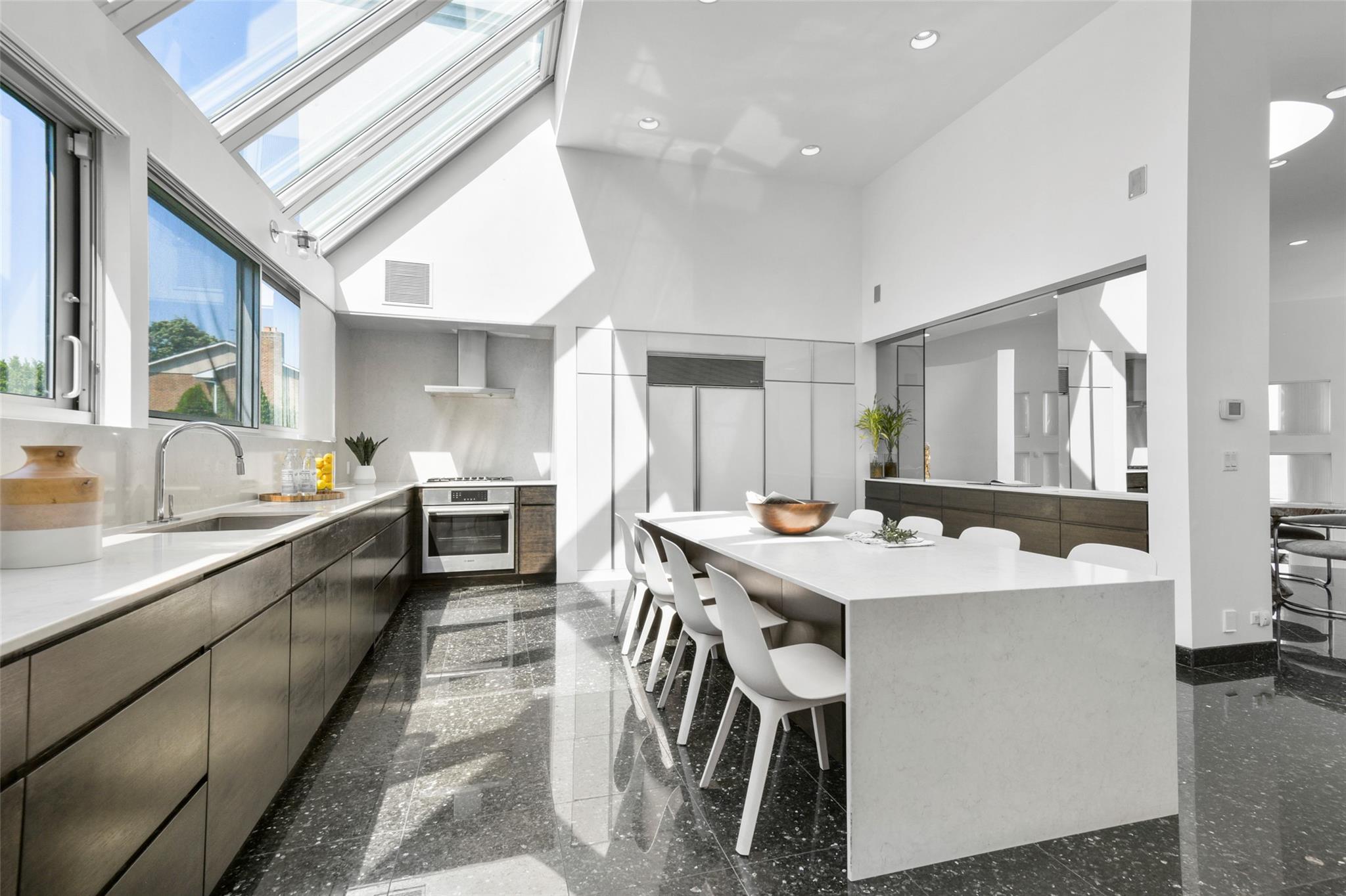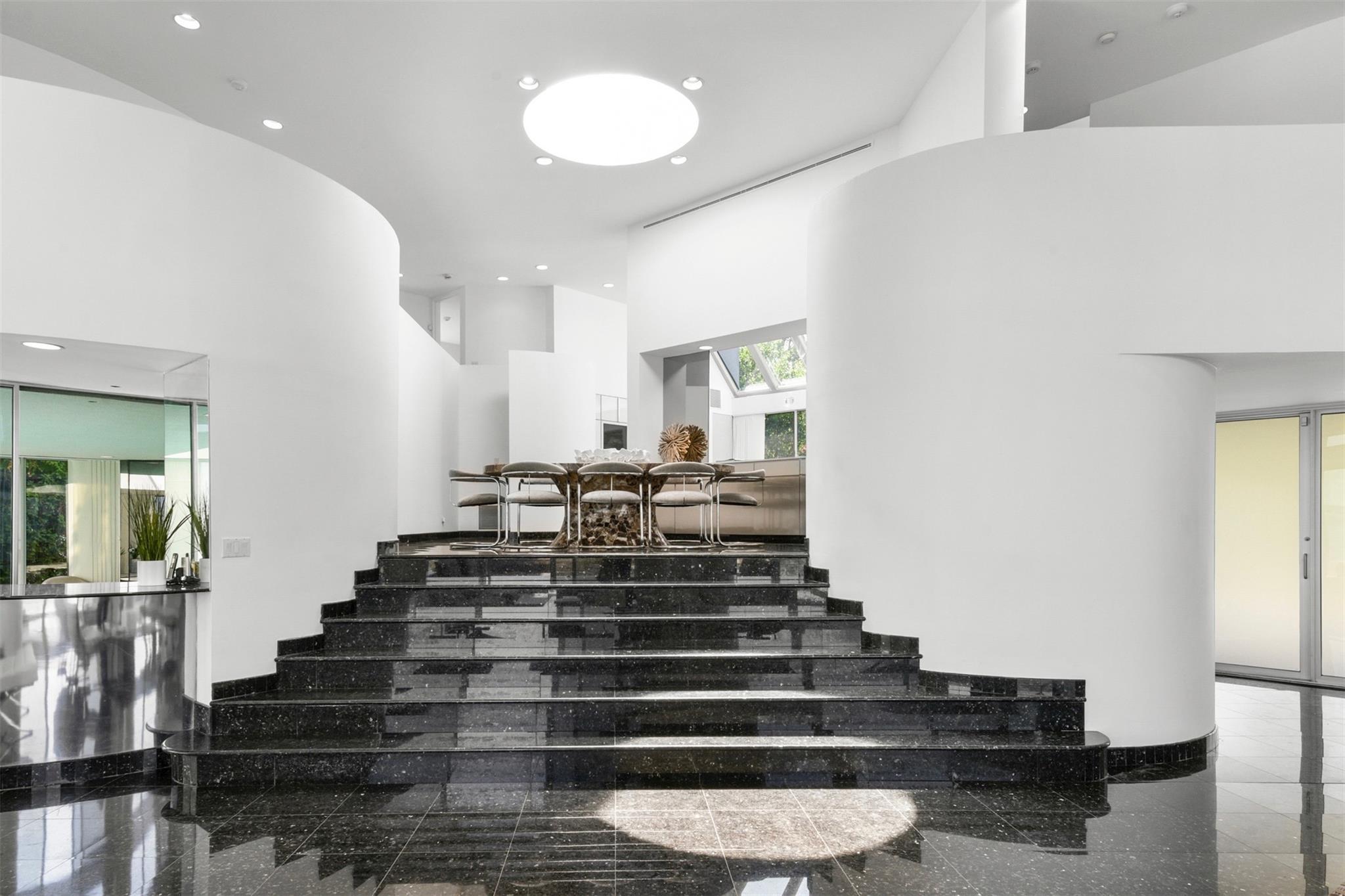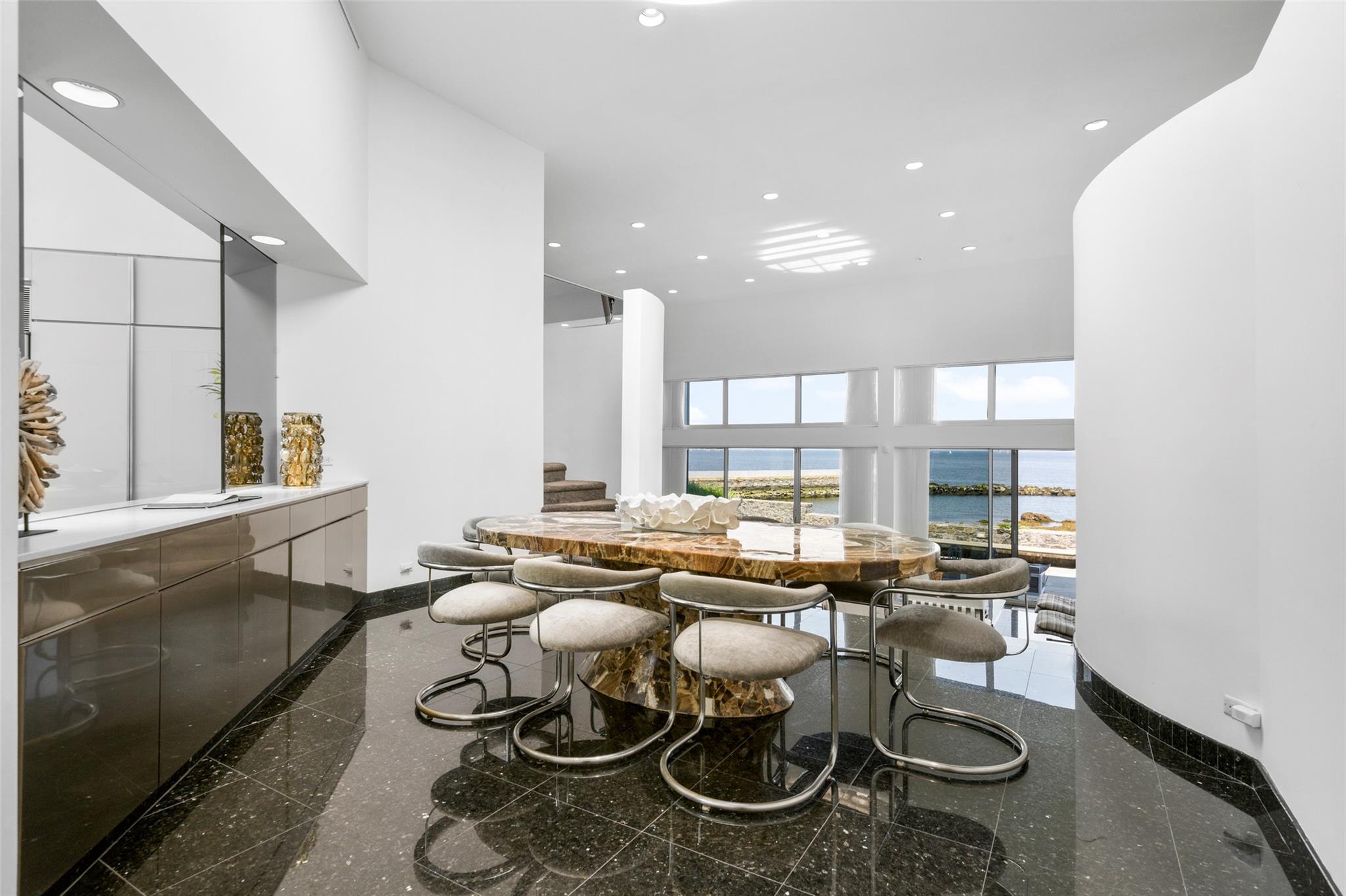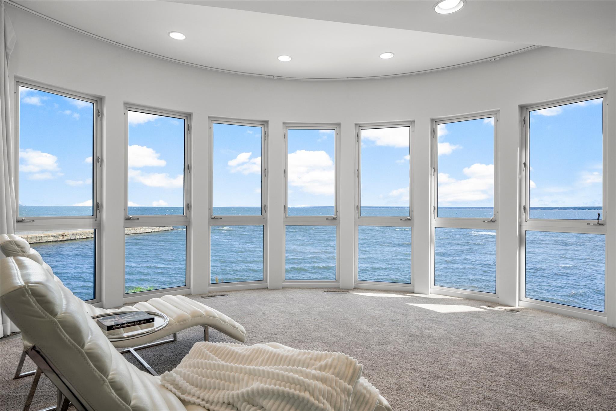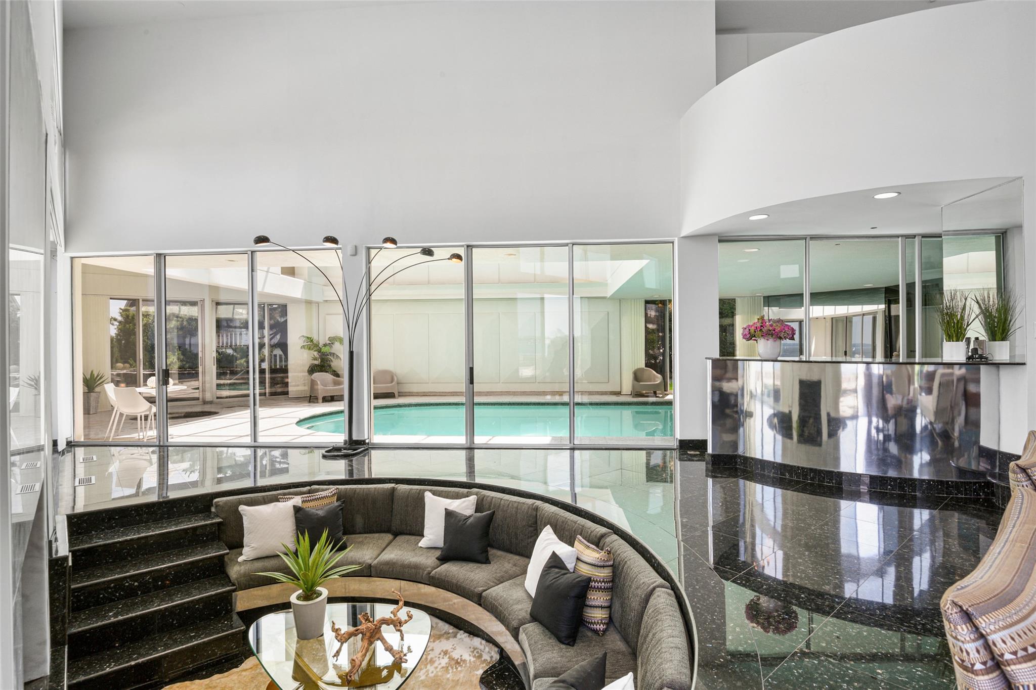 Waterfront Modernist Icon with Private Beach & Endless Views. Offered for the first time by its original owners, this architecturally significant waterfront home boasts over 118 feet of private shoreline and secluded sandy beach, with uninterrupted open ocean views across Long Island Sound. Designed in 1982 by renowned architect Myron Goldfinger and expanded in 1999, the residence is quietly tucked within an exclusive gated enclave of just 12 properties—only 35 minutes from midtown Manhattan by car. Featured in multiple design publications, this almost 6,000 sq ft modernist masterpiece showcases sculptural lines and curves, with soaring ceilings and skylights. Walls of glass blur the boundary between indoors and out, flooding the home with natural light and capturing breathtaking water views from nearly every room of this livable work-of-art home. Enter into the dramatic open living spaces, including a soaring living room with bar area, sunken conversation pit and fireplace, striking dining room, and designer eat-in kitchen. Host unforgettable gatherings year-round with the adjacent glass-clad indoor pool and jacuzzi room, or entertain on a grand scale from the expansive waterfront patio atop a steel beam and reinforced concrete constructed sea-wall. The design blends intimate and expansive public spaces - with sculptural curved stairways leading to four bedrooms thoughtfully spaced across two wings, and connected by a sensational family room on the third floor that feels suspended above the sea. Additional spaces include a home office, two powder rooms, au-pair suite off the kitchen, and two car garage. This one-of-a-kind property is located in an X-500 FEMA zone, so no flood insurance is required. Swim, kayak, or paddleboard from your private beach, forage among the rockpools, or take advantage of the additional association beach area and jetty with mooring rights. A rare chance to own an iconic modernist home with an unparalleled private beach and waterfront views in close proximity to NYC - where architecture, privacy, and nature meet in perfect harmony.