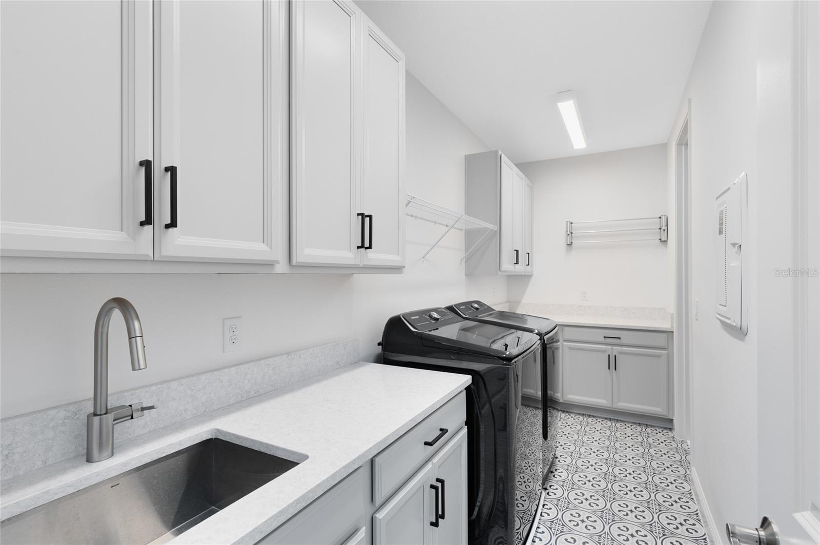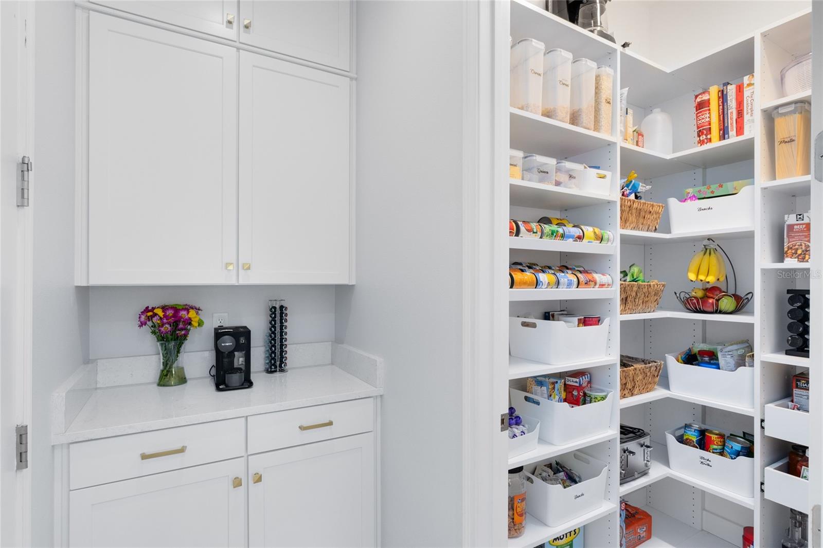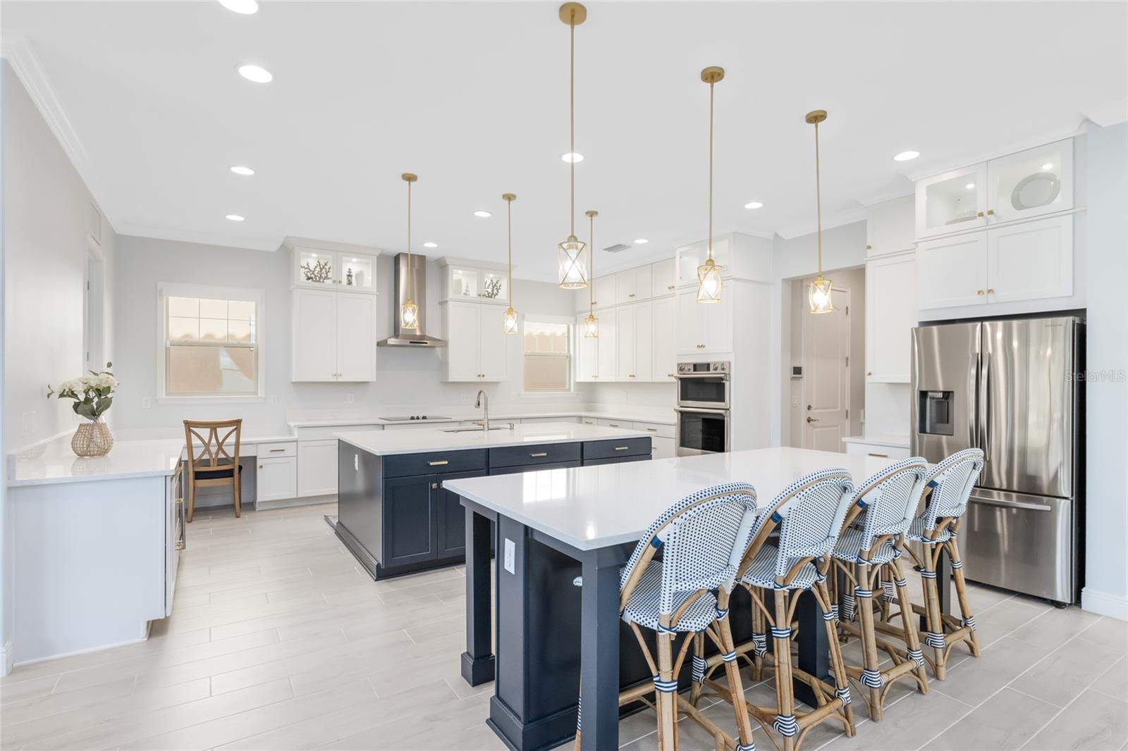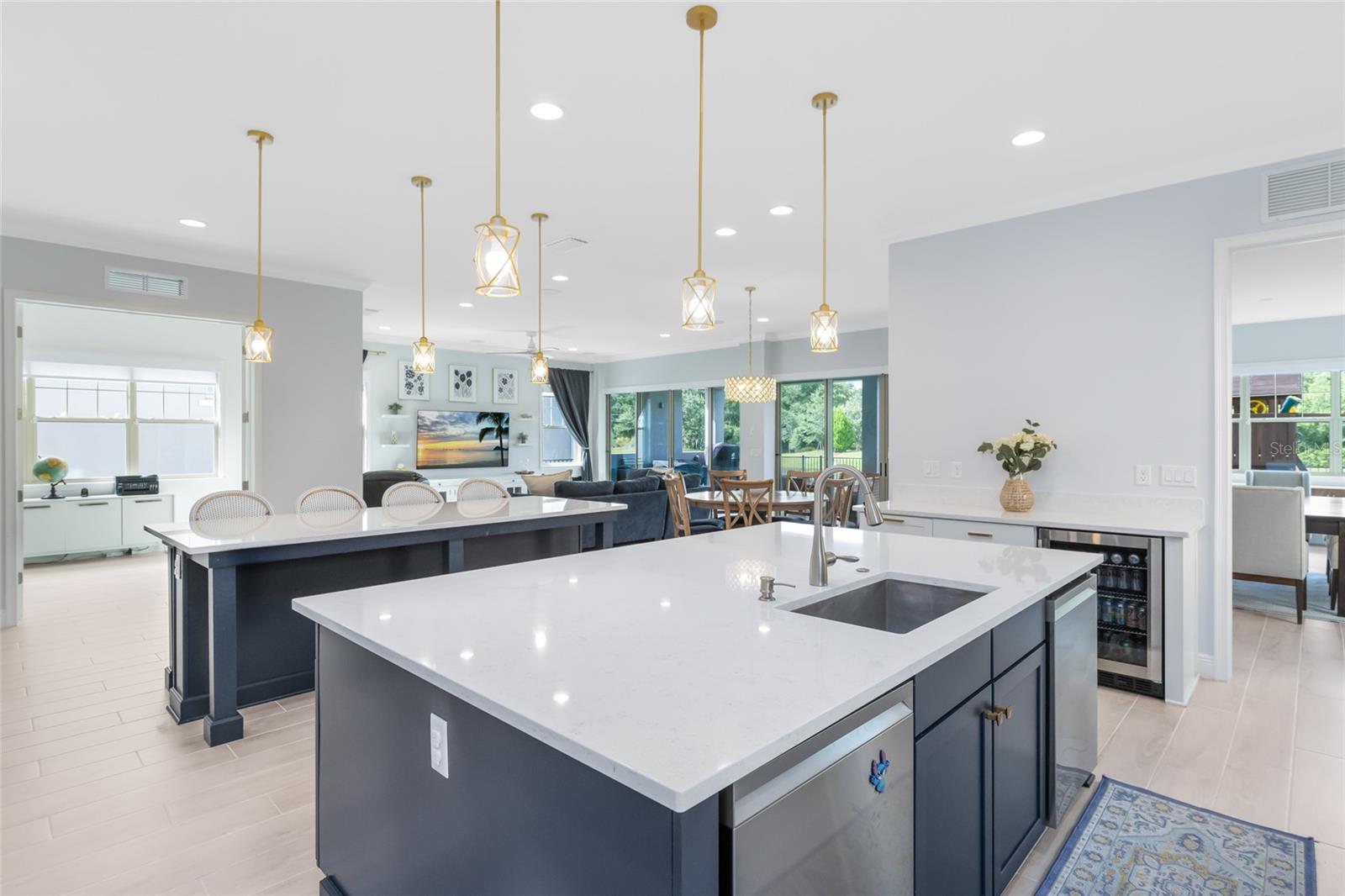 Step inside to an inviting open floor plan highlighted by natural light, tray ceilings, and designer finishes. The gourmet kitchen features sleek quartz countertops, double ovens, a gas cooktop, walk-in pantry, and a large island that opens to the dining area and great room—ideal for gathering and entertaining. A wall of glass sliders extends the living space to the covered lanai, where you can dine al fresco or relax while overlooking the tranquil water.