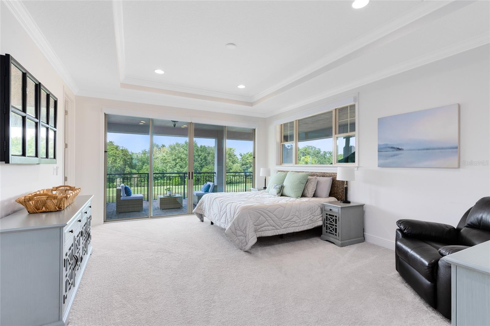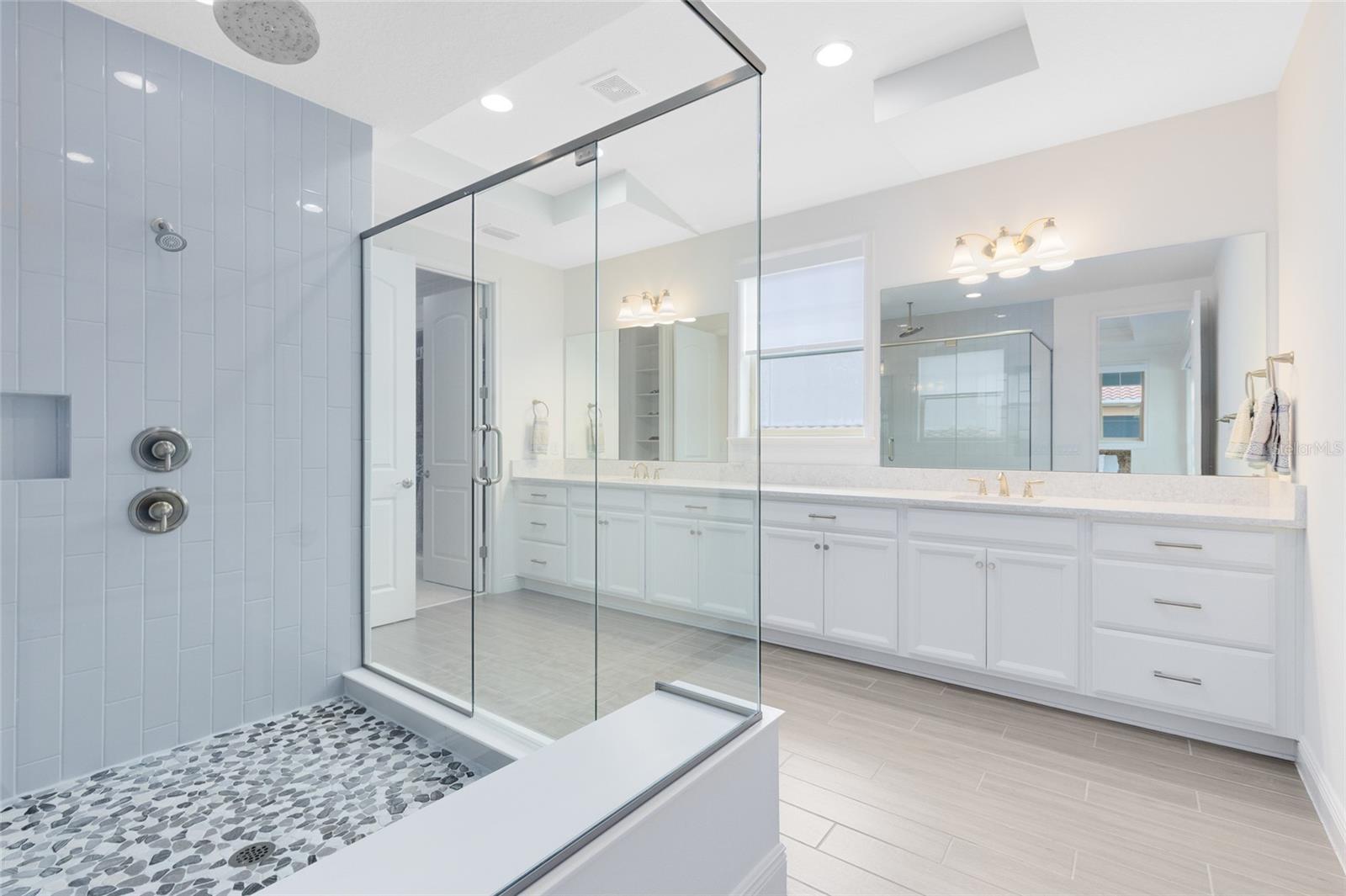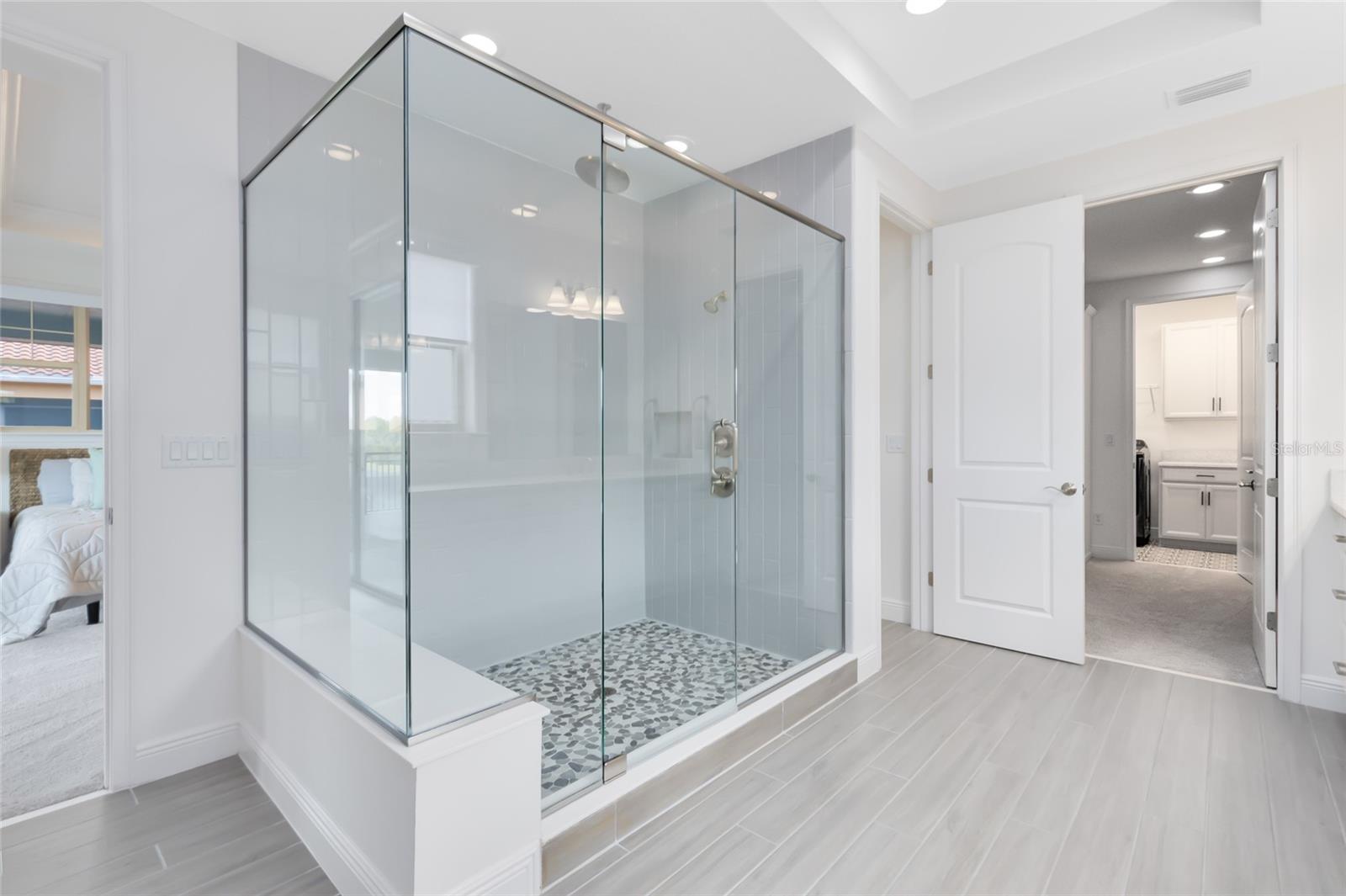 Upstairs, the expansive primary suite offers serene water views and private access to a covered balcony—the perfect place to enjoy your morning coffee or sunset breeze. The spa-inspired bath features dual vanities, a large glass-enclosed shower with pebble flooring, and a spacious custom closet with built-ins. Every bedroom in the home includes its own ensuite bath, offering privacy and comfort for family and guests alike.