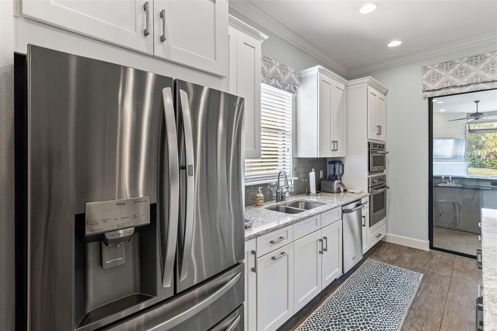 This private, outdoor oasis is designed for both relaxation and entertainment, with a built-in kitchen and fireplace offering a heated saltwater pool with a brand-new pump and filter. The screened-in lanai was updated in 2025 with a stunning picture-frame view of the water, enhancing the sense of openness and tranquility.