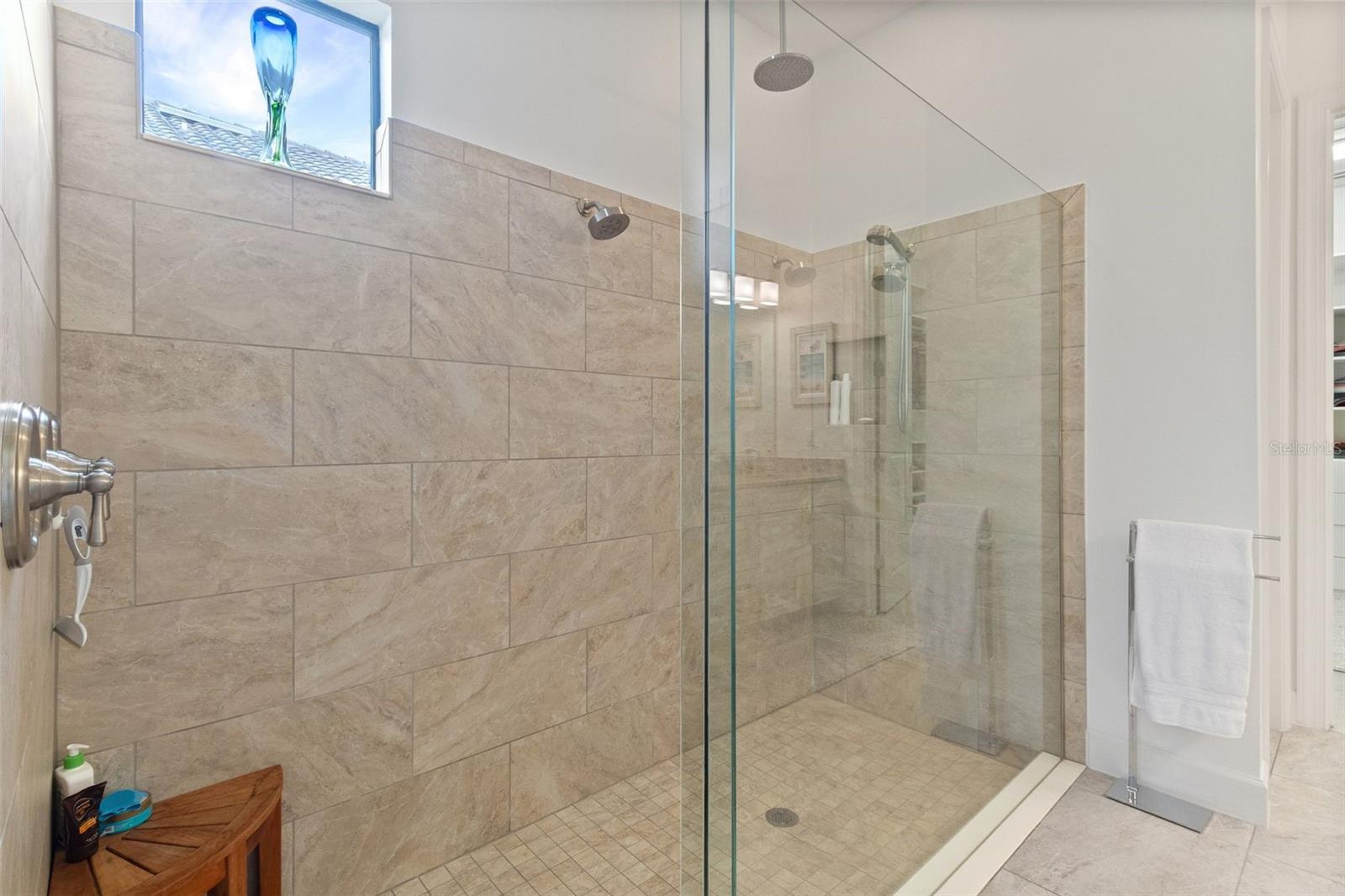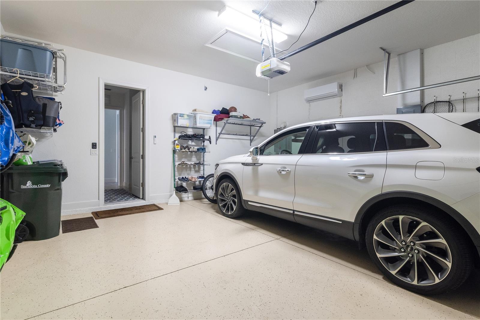 The designer kitchen is a standout, featuring quartz countertops, stainless steel Monogram GE appliances, a four-burner gas cooktop and handmade pendulum lighting imported from Granada, Spain. Additional upgrades include full-property gutters and a split A/C unit in the garage—ideal for a climate-controlled environment for classic or exotic car enthusiasts.