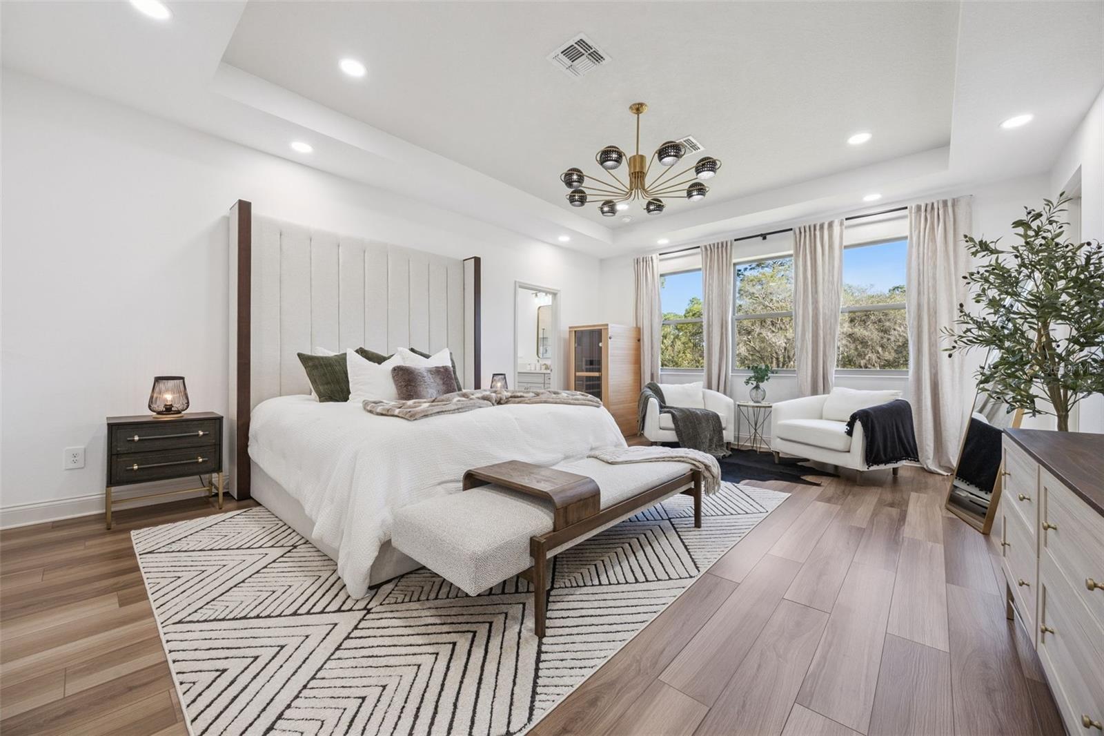 The primary retreat is a true sanctuary. This expansive suite features a tray ceiling, elevated lighting, and a private balcony overlooking serene conservation views. There is plenty of room for a cozy sitting area, ideal for morning coffee or evening relaxation. The fully customized dream closet is a standout luxury feature—designed with pant racks, velvet-lined jewelry storage, belt racks, built-in drawers, and tailored shelving, offering boutique-level organization.