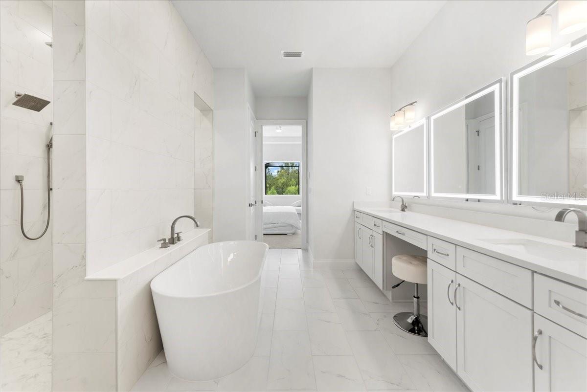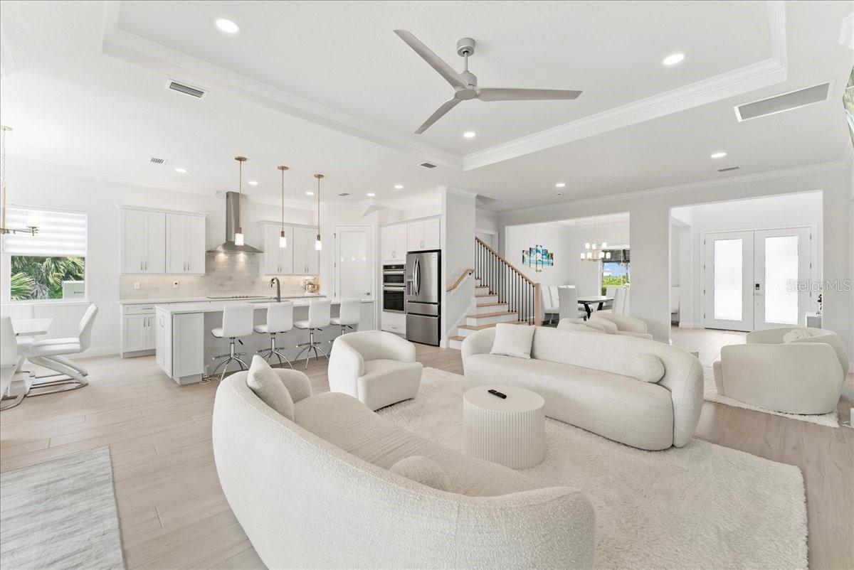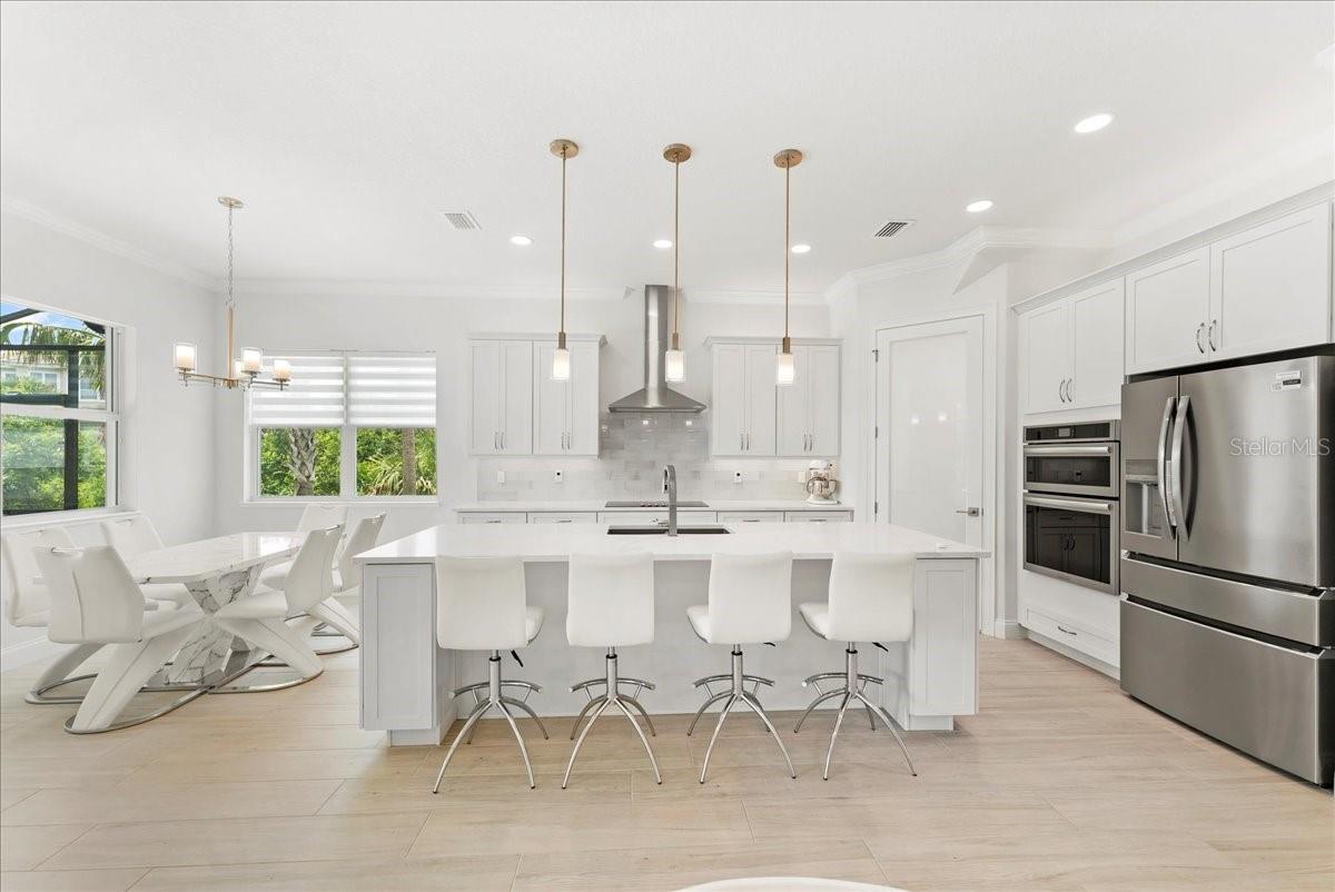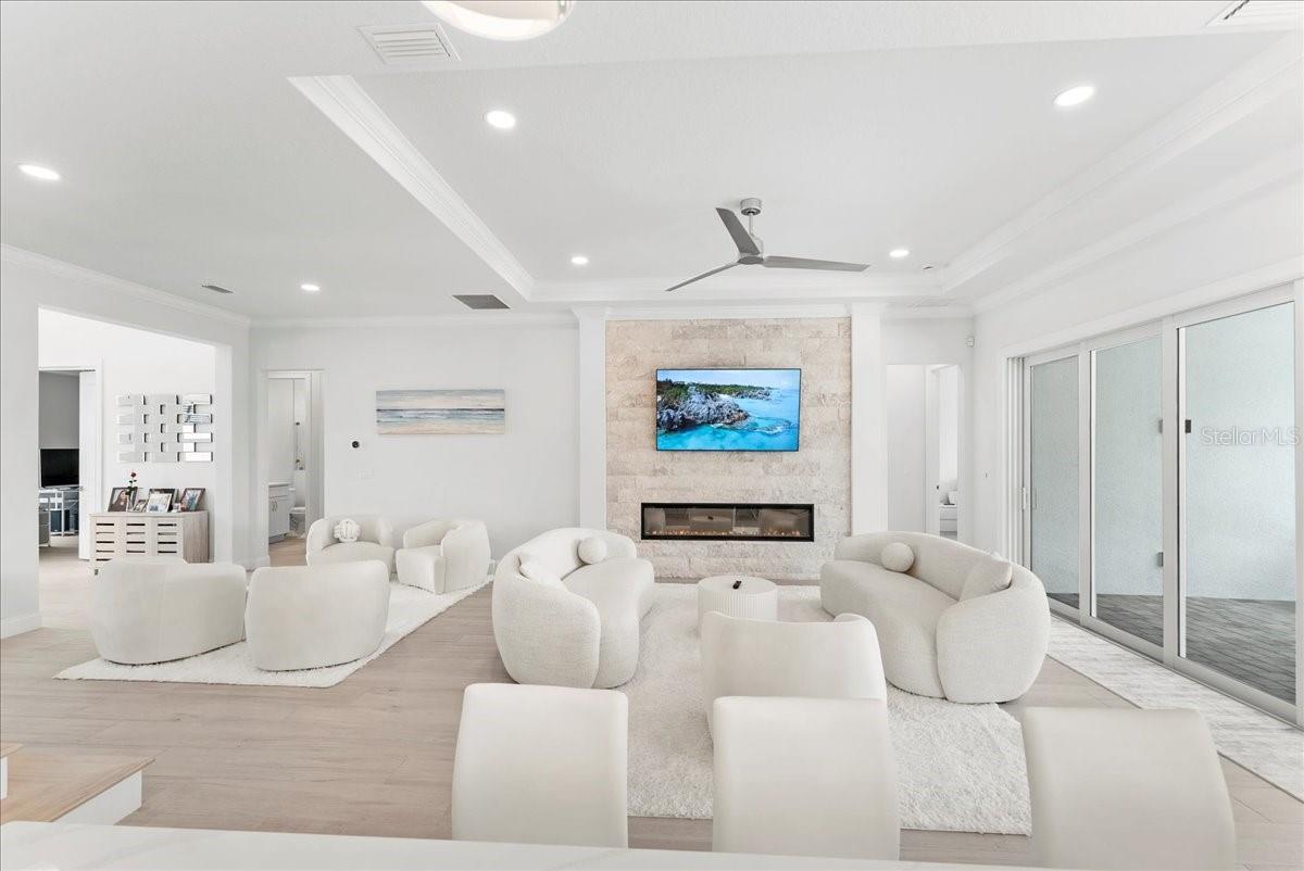 Stately curb appeal greets you as you enter the home via large double doors. The dramatic two-story entry foyer flows into the light and airy open concept first floor. A lower-level bedroom currently used as an office space provides direct access to a full bathroom, giving flexibility as work or bedroom space. A formal dining room flanks the entry foyer with plenty of seating for 10+ in an intimate setting, overlooking the lush street landscaping through large windows. The main living area provides ample seating space for your large group. This space can easily divided into dual seating areas to enhance entertaining, and complete with a large collapsible slider to the screened lanai. A highlight of this space is the floor to ceiling stone linear fireplace, providing lovely ambience for relaxation. The adjacent kitchen features 42-inch cabinetry, quartz countertops, glass tile backsplash, walk-in pantry and separate breakfast nook, overlooking the sparkling pool and spa. A first-floor primary suite features a large bay window overlooking the pool, tray ceiling, soaking tub, large walk-through shower, double sink vanity with lighted LED mirrors and seated vanity space, and walk-in closet with custom closet system. Rounding out this well-designed lower level is a laundry room with extra storage.