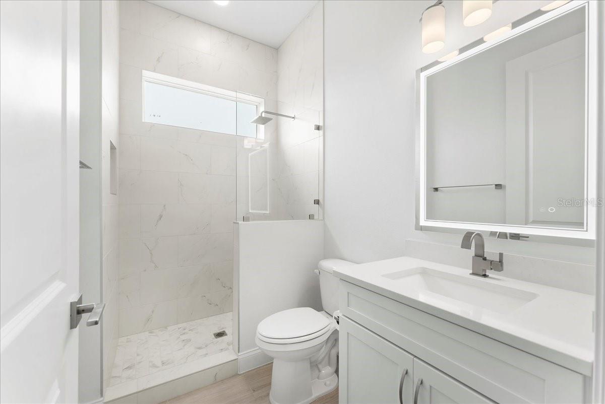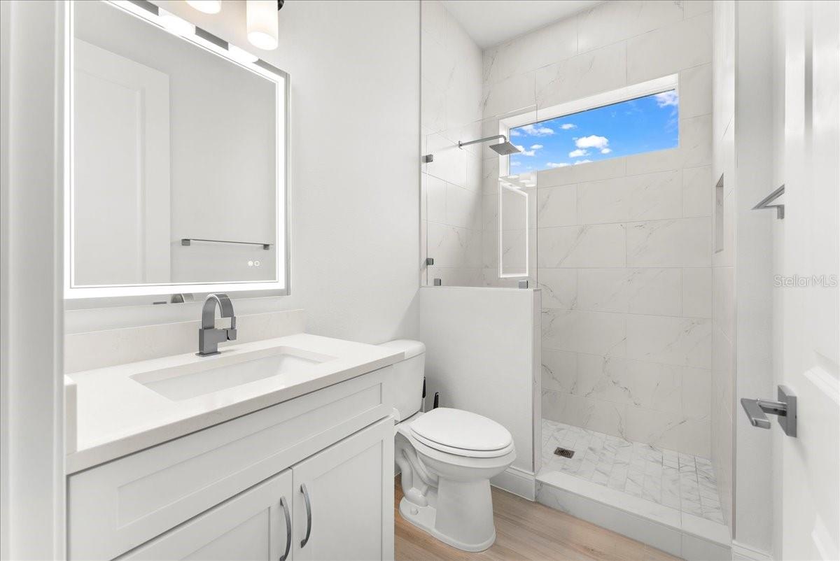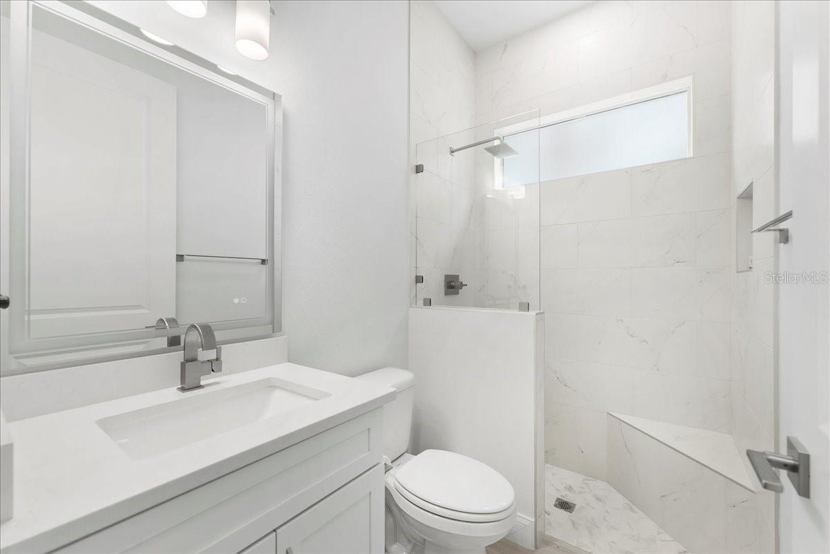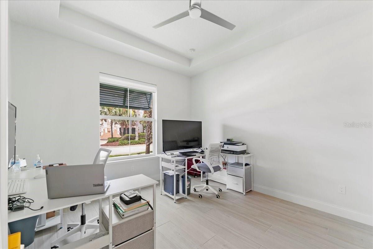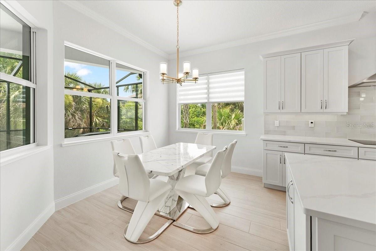 Stately curb appeal greets you as you enter the home via large double doors. The dramatic two-story entry foyer flows into the light and airy open concept first floor. A lower-level bedroom currently used as an office space provides direct access to a full bathroom, giving flexibility as work or bedroom space. A formal dining room flanks the entry foyer with plenty of seating for 10+ in an intimate setting, overlooking the lush street landscaping through large windows. The main living area provides ample seating space for your large group. This space can easily divided into dual seating areas to enhance entertaining, and complete with a large collapsible slider to the screened lanai. A highlight of this space is the floor to ceiling stone linear fireplace, providing lovely ambience for relaxation. The adjacent kitchen features 42-inch cabinetry, quartz countertops, glass tile backsplash, walk-in pantry and separate breakfast nook, overlooking the sparkling pool and spa. A first-floor primary suite features a large bay window overlooking the pool, tray ceiling, soaking tub, large walk-through shower, double sink vanity with lighted LED mirrors and seated vanity space, and walk-in closet with custom closet system. Rounding out this well-designed lower level is a laundry room with extra storage.