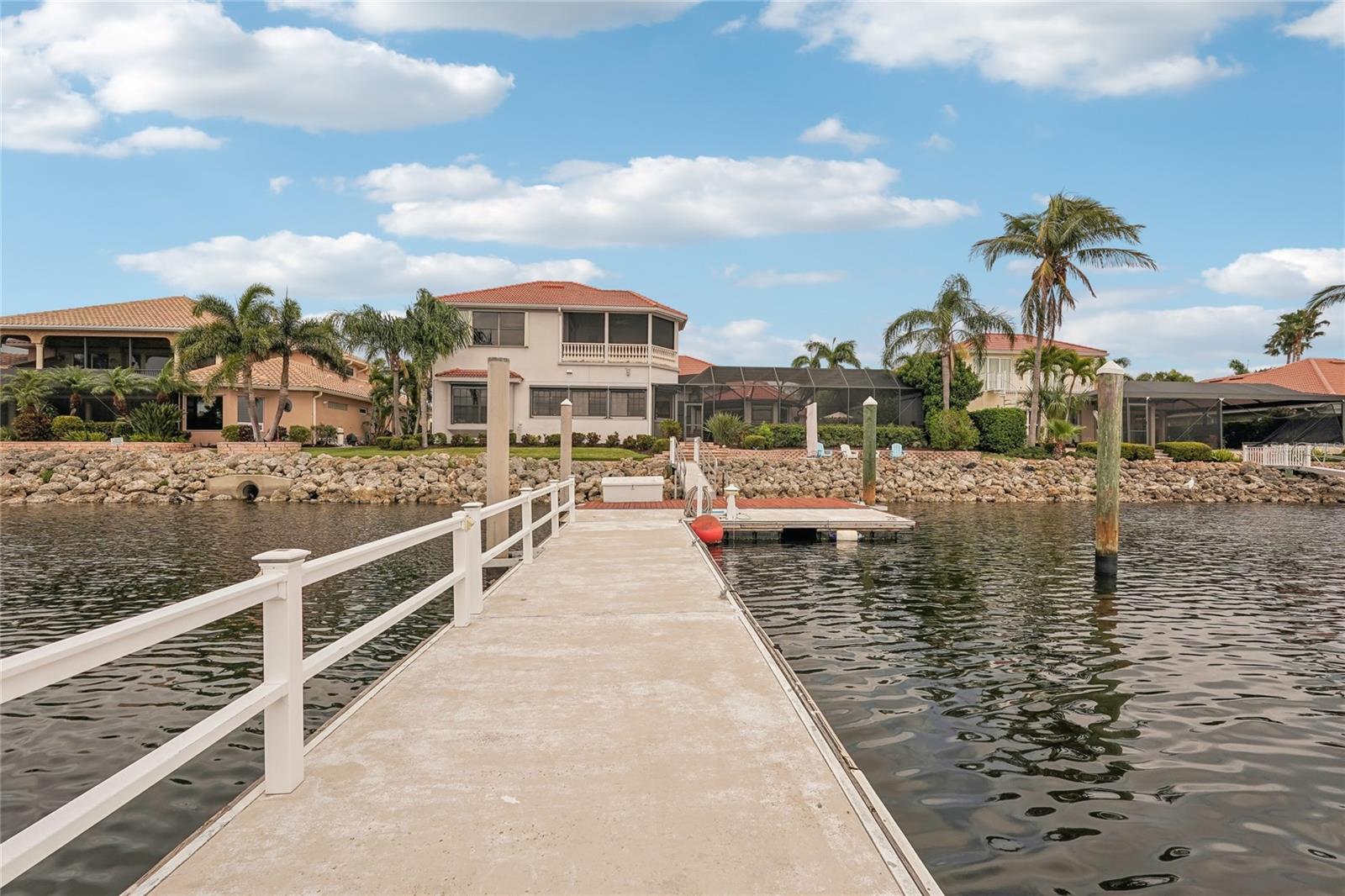 The protected harbor at Riviera Dunes is a hurricane hole six miles inland and just off the Manatee River and is thought by many to be the safest waterfront community on the west coast of Florida. The private 50' floating boat dock is equipped with shore power and city water and can accommodate vessels with a draft of up to 18', 60' of waterline and a practically unlimited beam. The 2' wide seacap is protected by an enduring riprap barrier that is 20' wide. Easy access to Intracoastal Waterway and the Gulf. While no home is hurricane proof, this one has a proven track record. In 2024, three storms affected the west coast of Florida and it remained unscathed, high and dry.